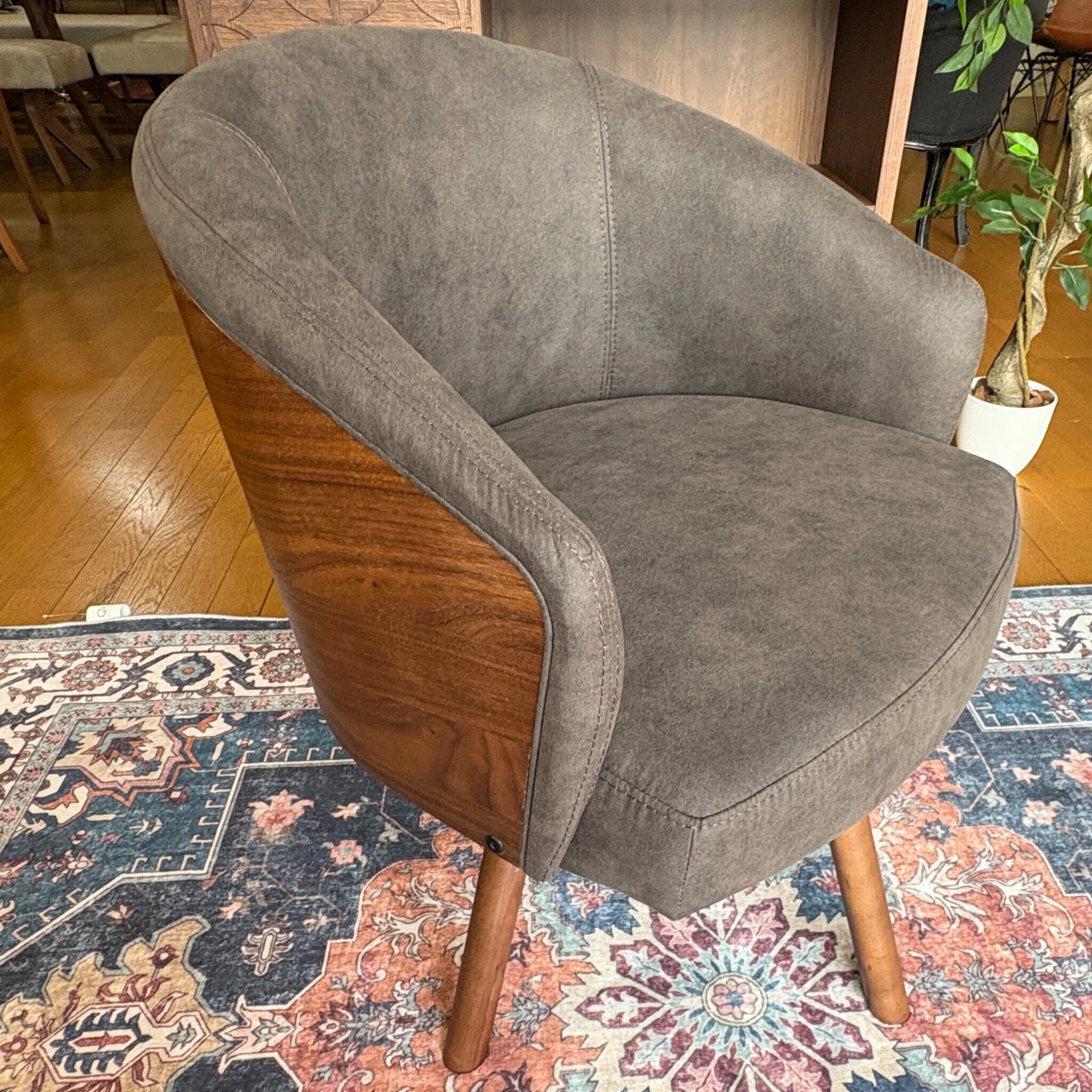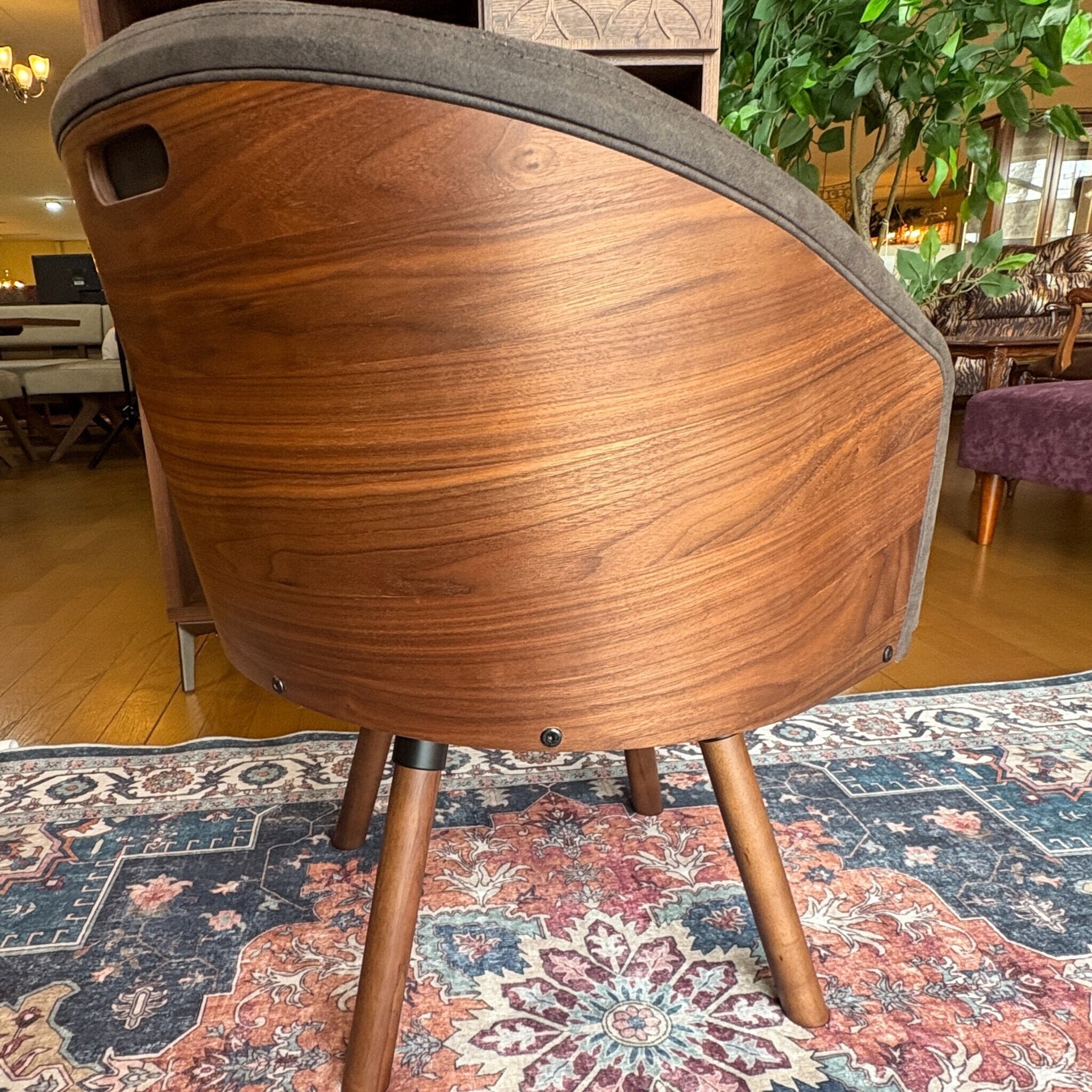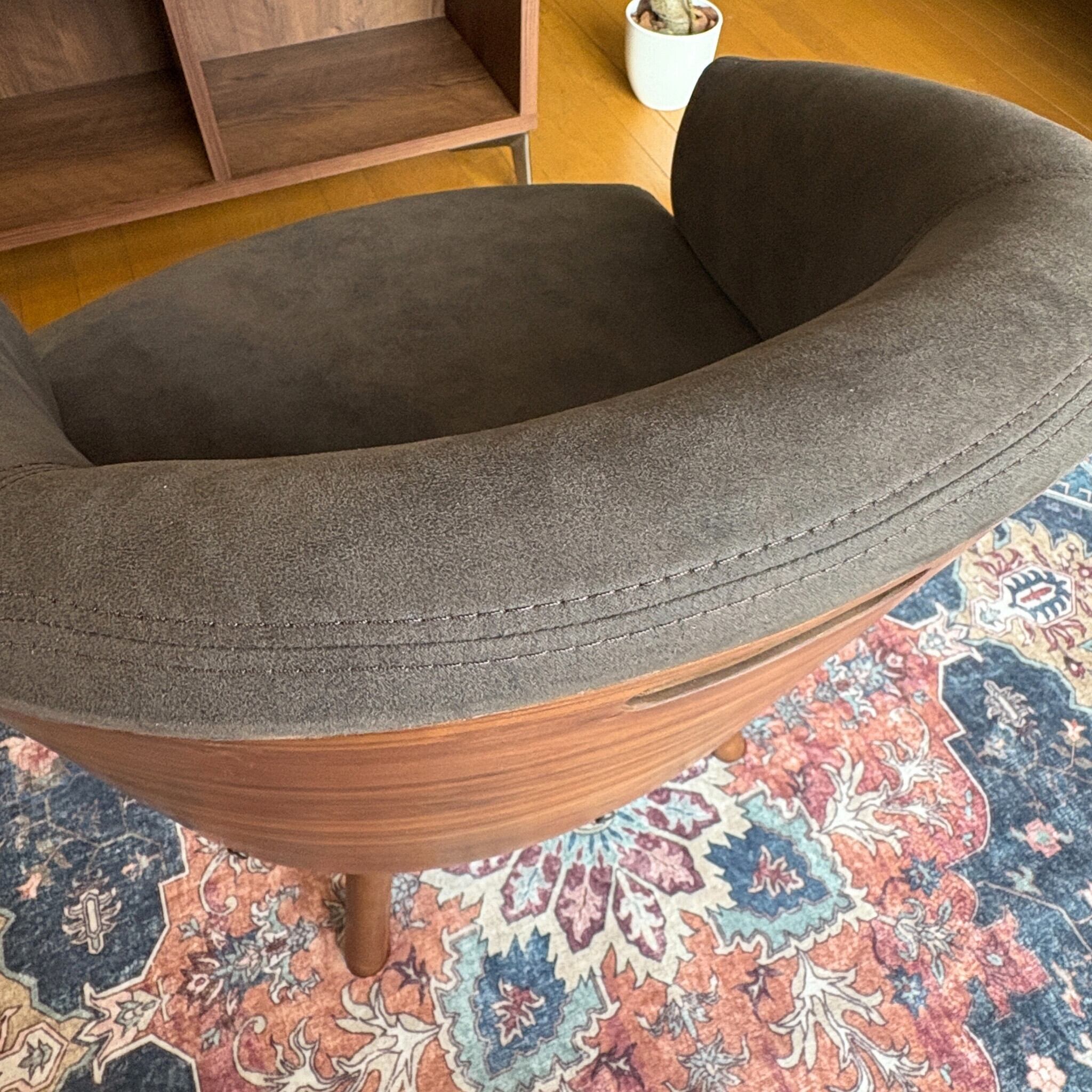 木部はウォールナット材の突板を贅沢に使い、生地はレザーのような見た目のファブリックという新しい素材を採用。革よりも通気性に優れお手入れ要らず。更に通常の布より摩擦に強いという事で座る時間が長くなりそうな椅子に最適の張り地です。