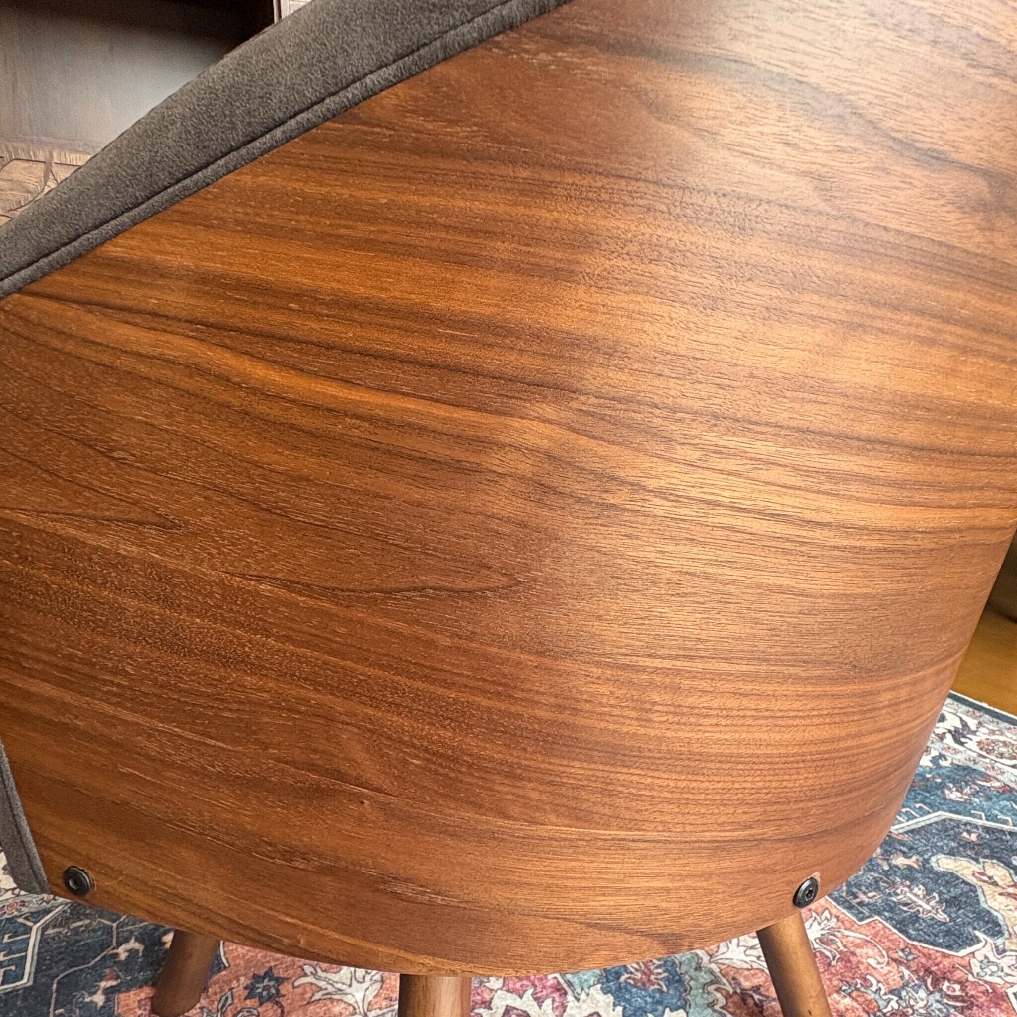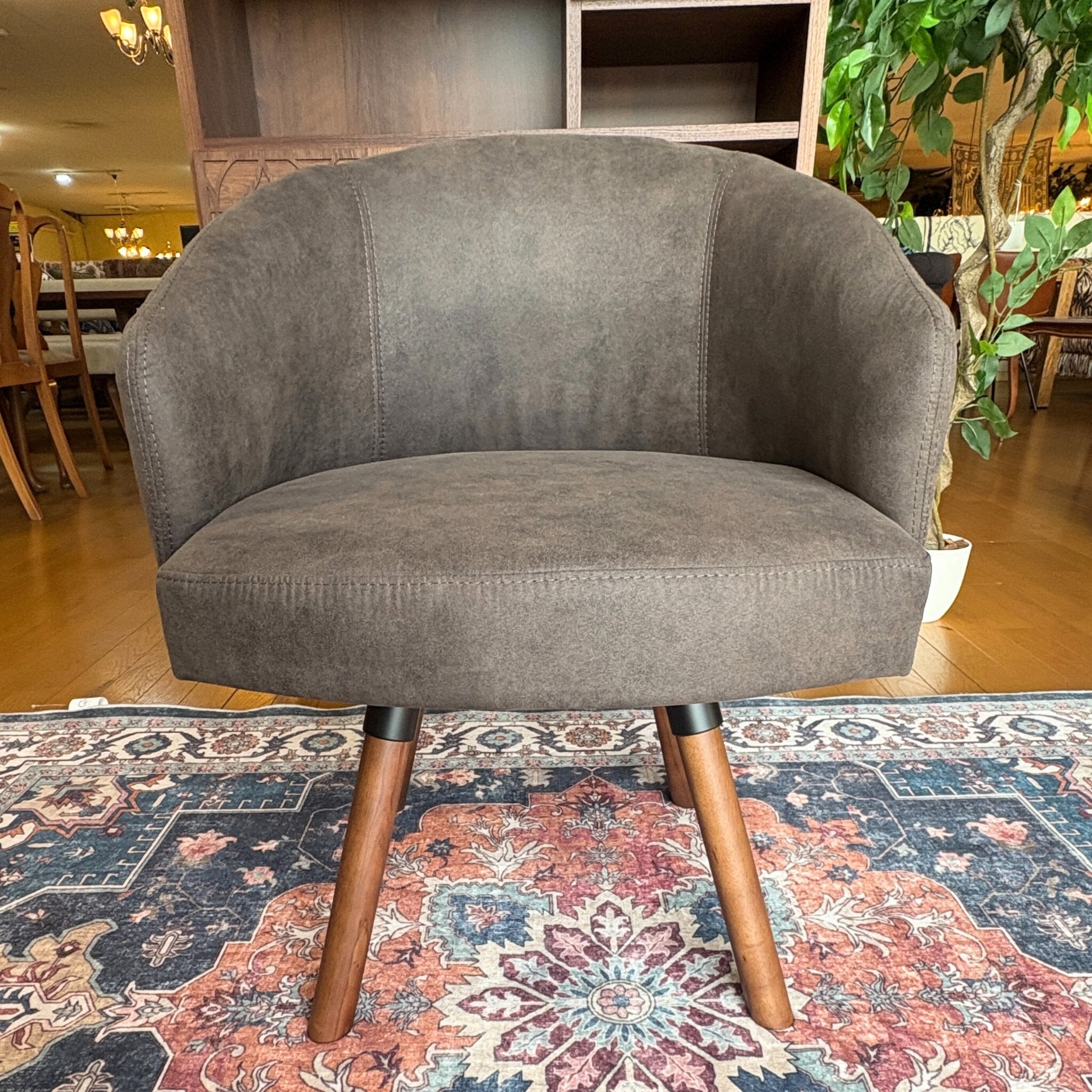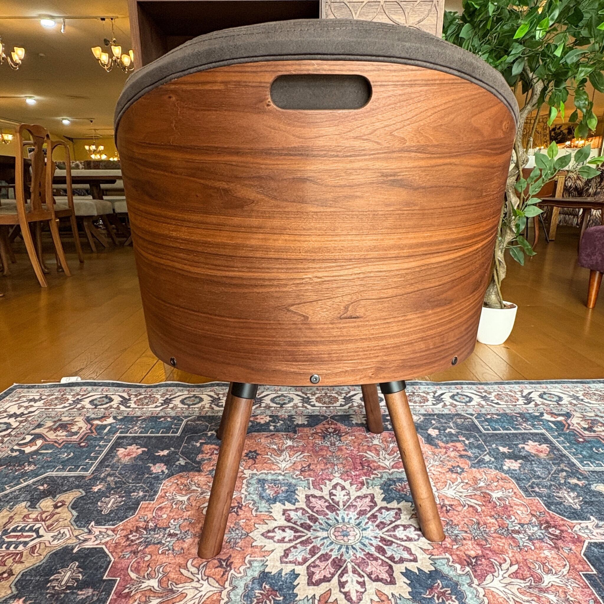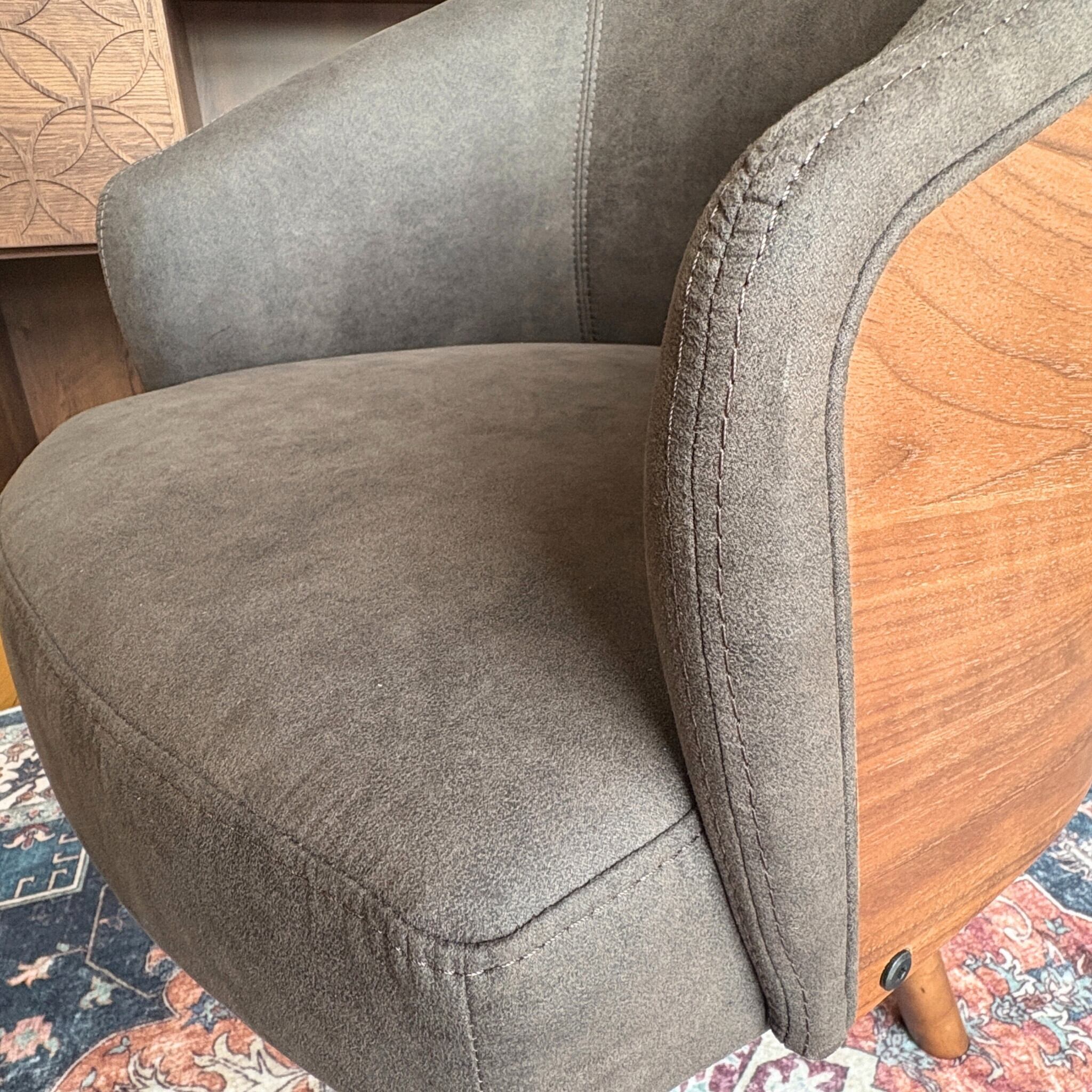 木部はウォールナット材の突板を贅沢に使い、生地はレザーのような見た目のファブリックという新しい素材を採用。革よりも通気性に優れお手入れ要らず。更に通常の布より摩擦に強いという事で座る時間が長くなりそうな椅子に最適の張り地です。
