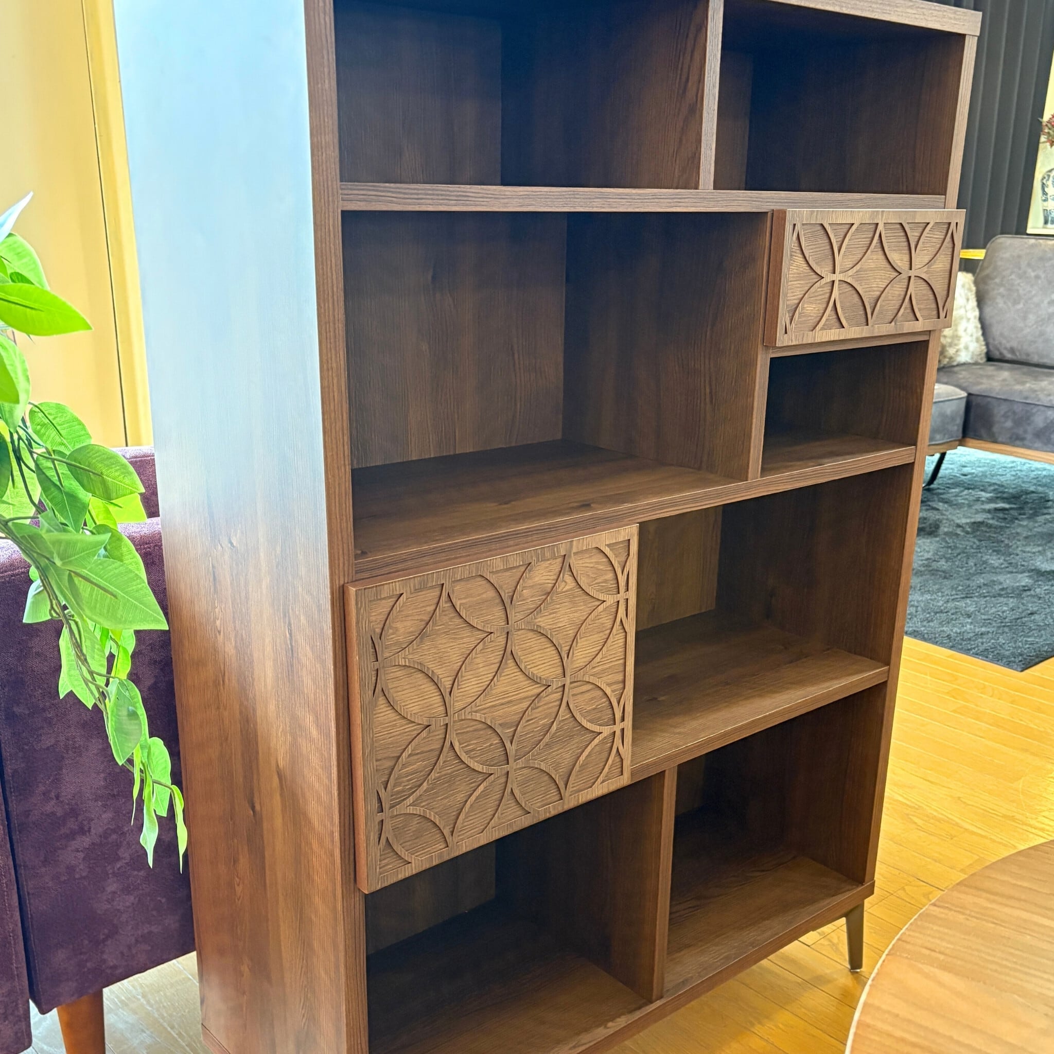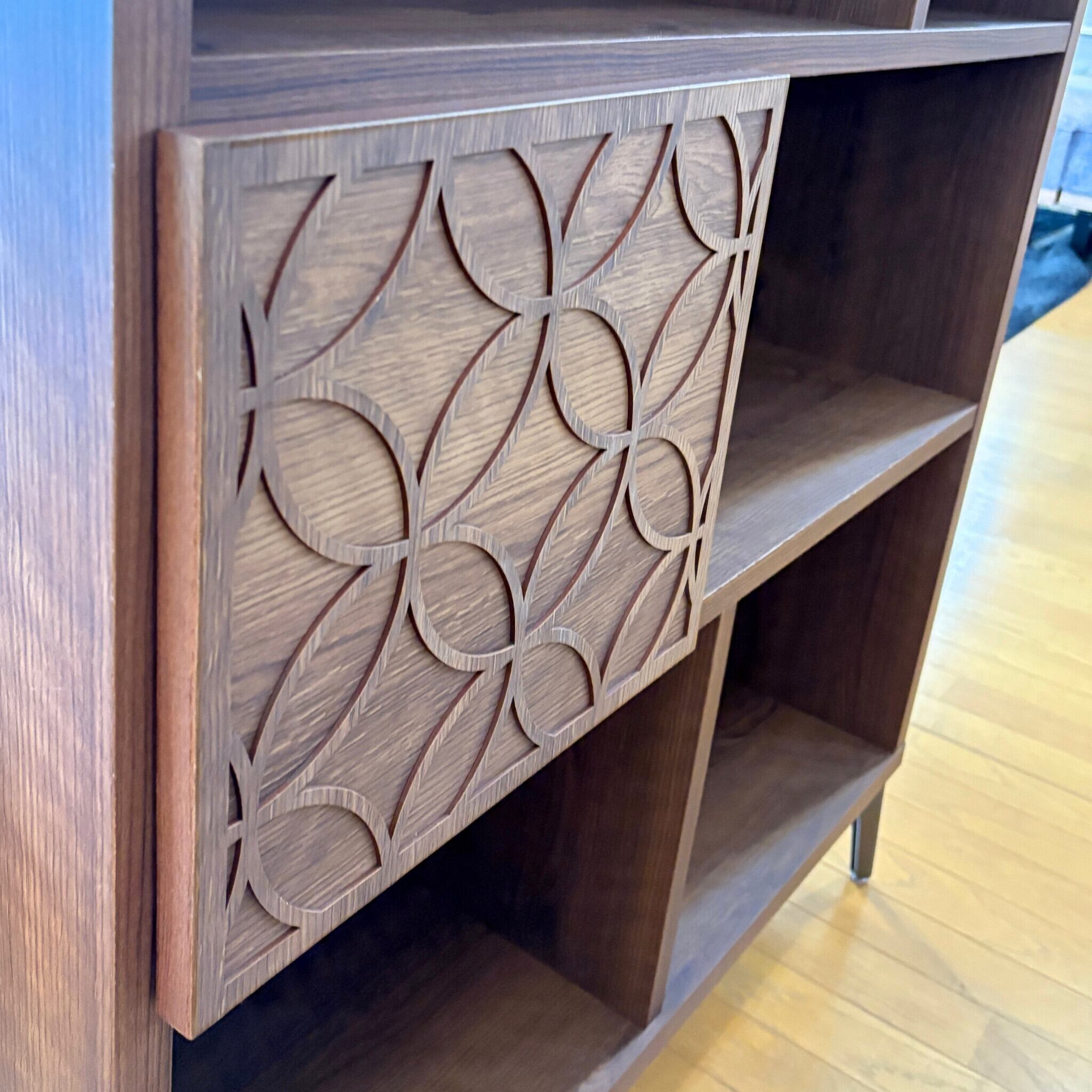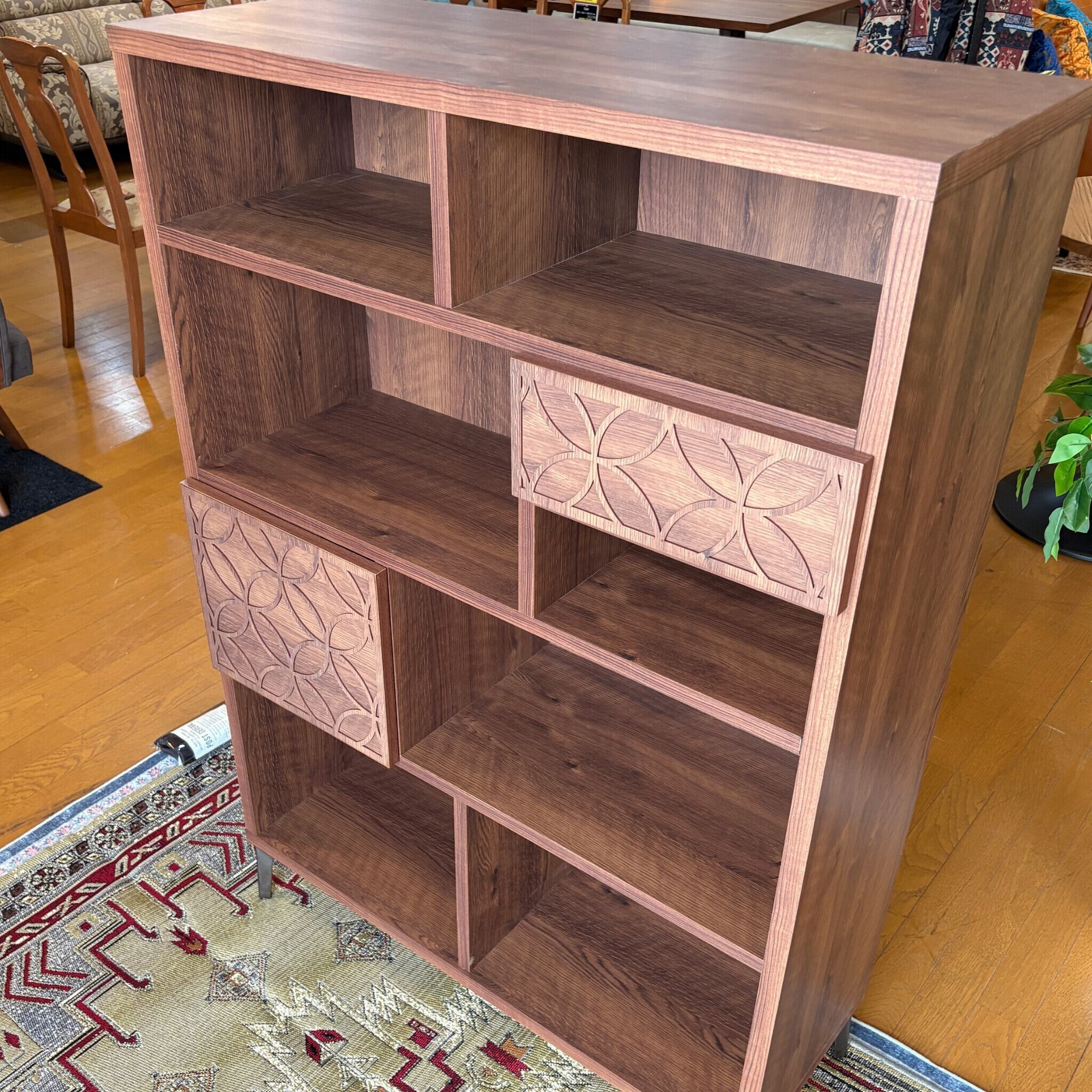 棚というものはシンプル過ぎてしまうものが多いのですが、こちらは扉と引き出しにアクセントを加えました。高さ130cmというサイズは圧迫感がなく、本棚や飾り棚としてはもちろん間仕切り家具としてもおすすめです。