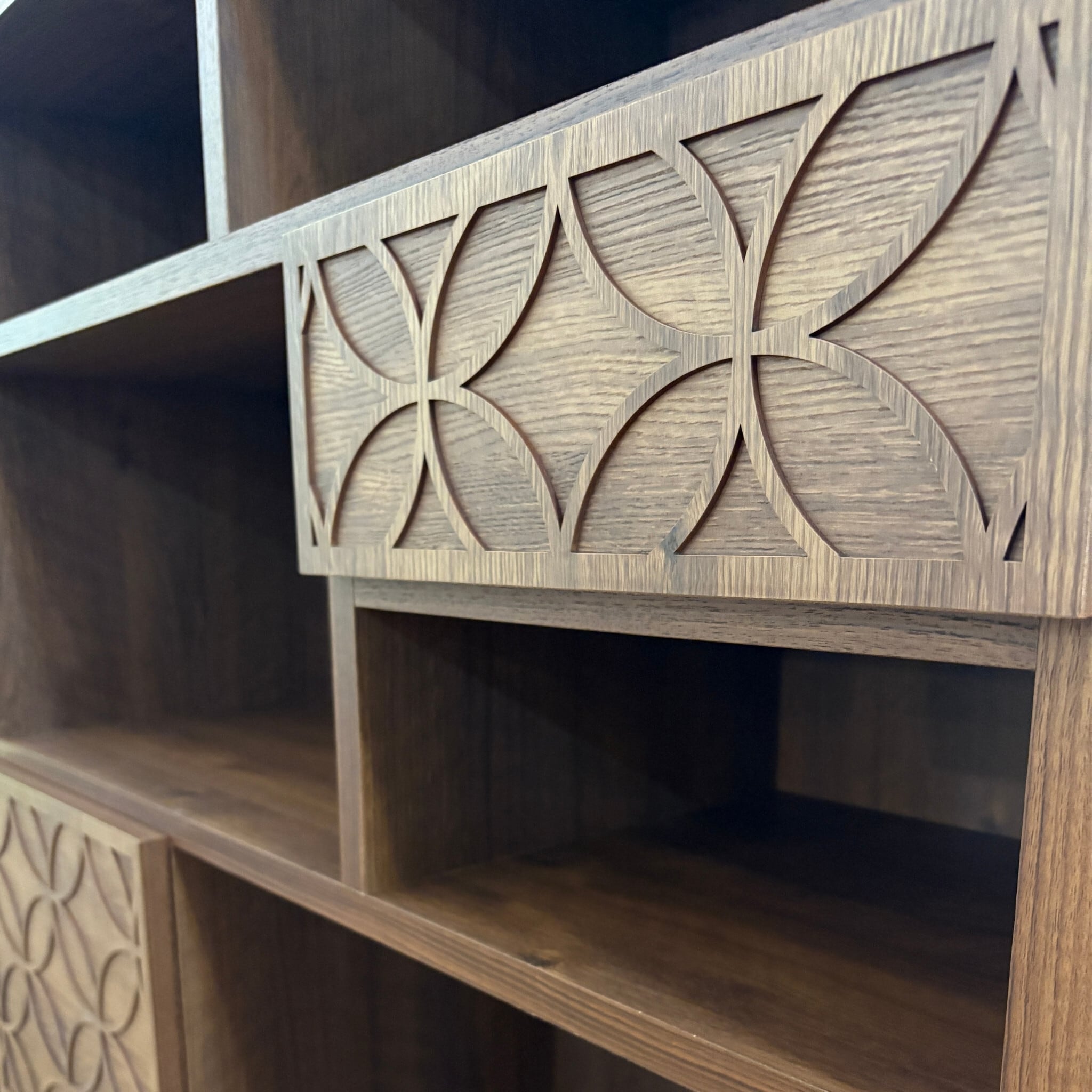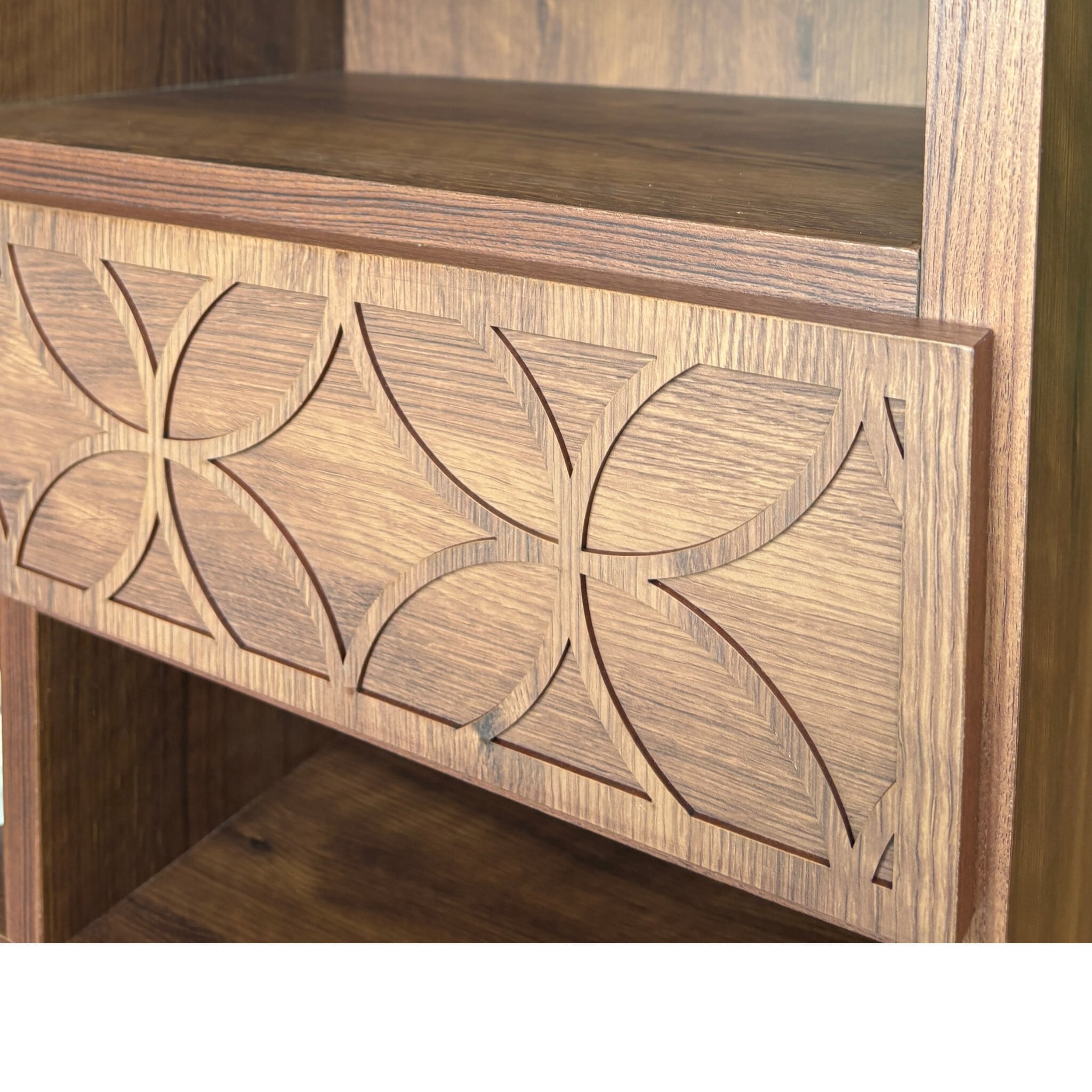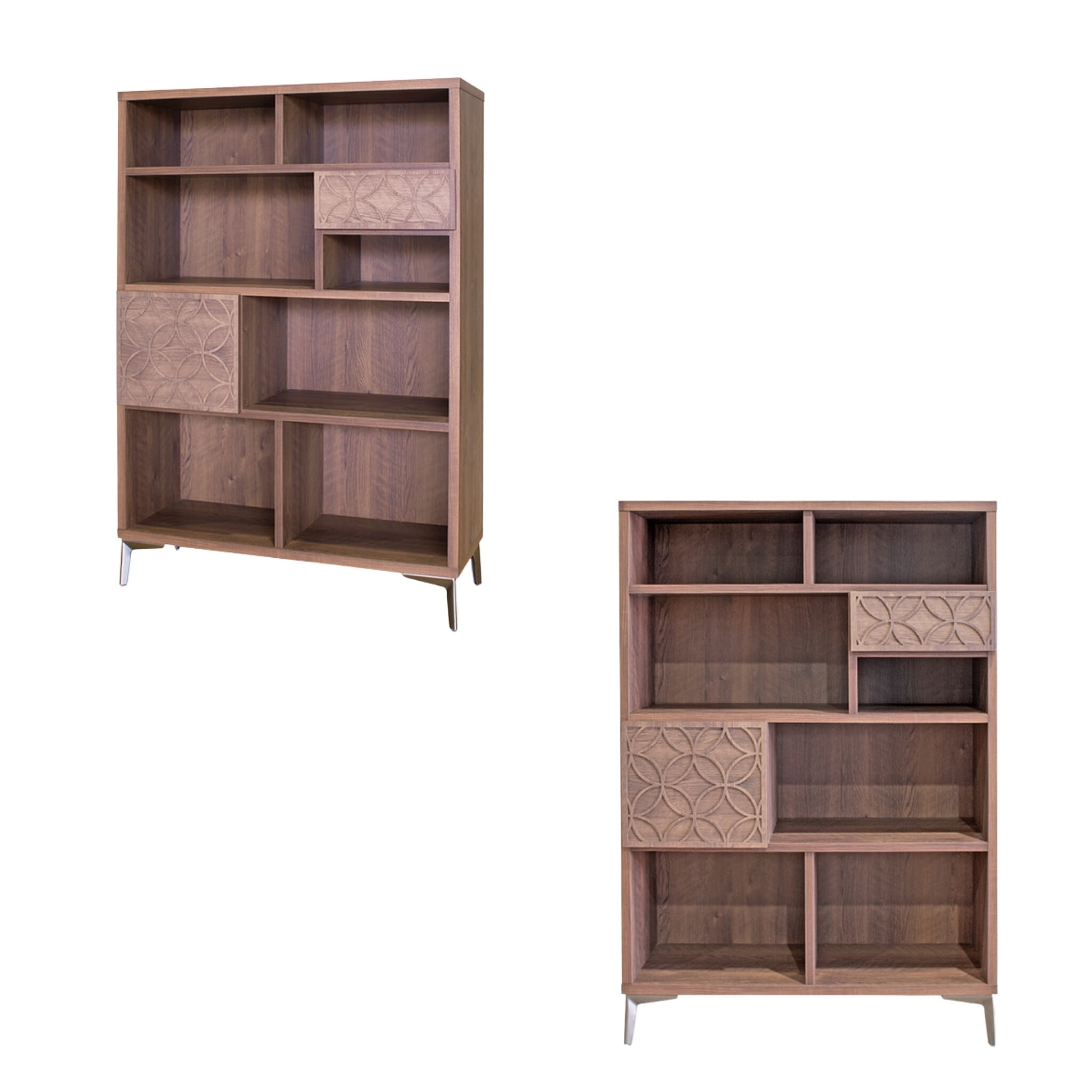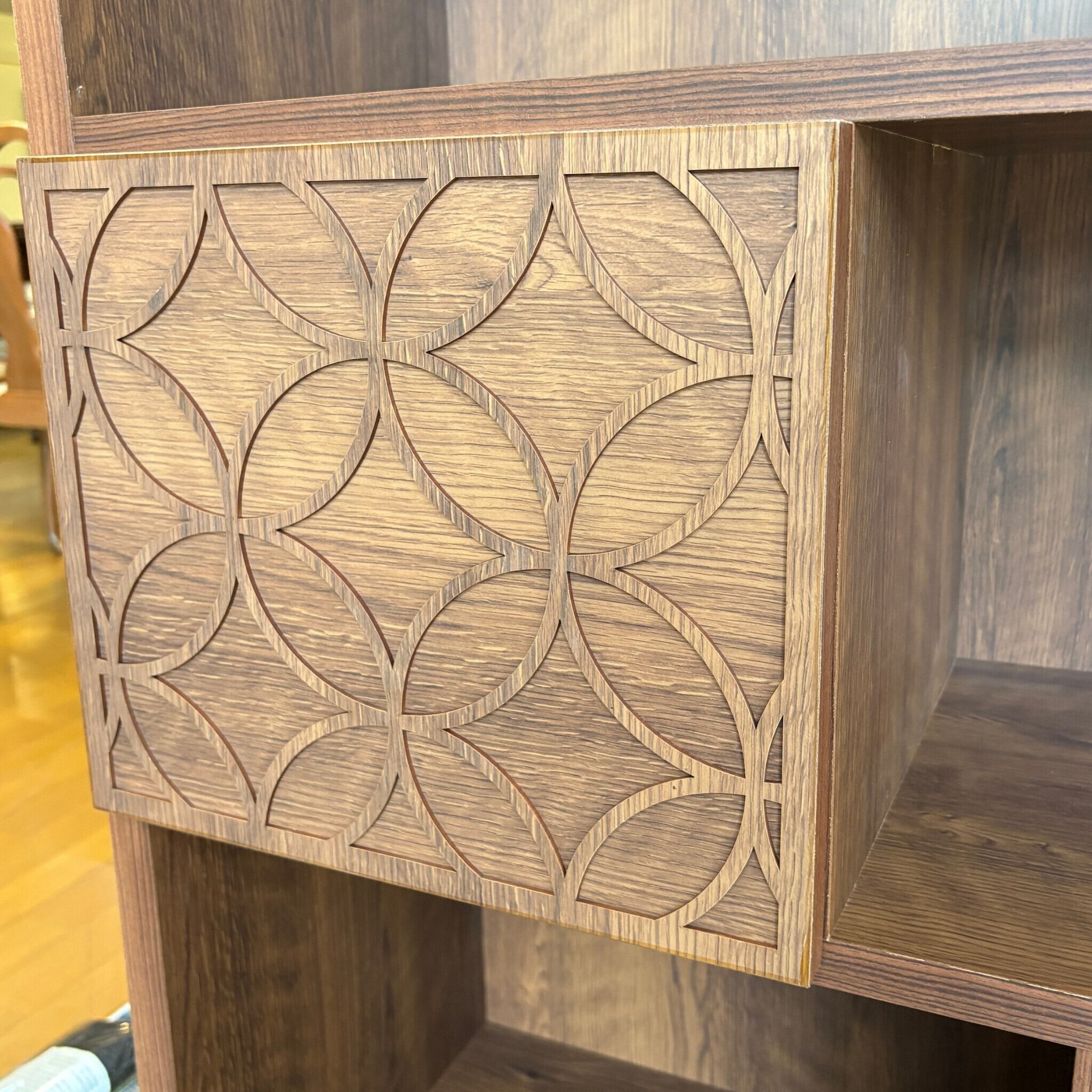 棚というものはシンプル過ぎてしまうものが多いのですが、こちらは扉と引き出しにアクセントを加えました。高さ130cmというサイズは圧迫感がなく、本棚や飾り棚としてはもちろん間仕切り家具としてもおすすめです。