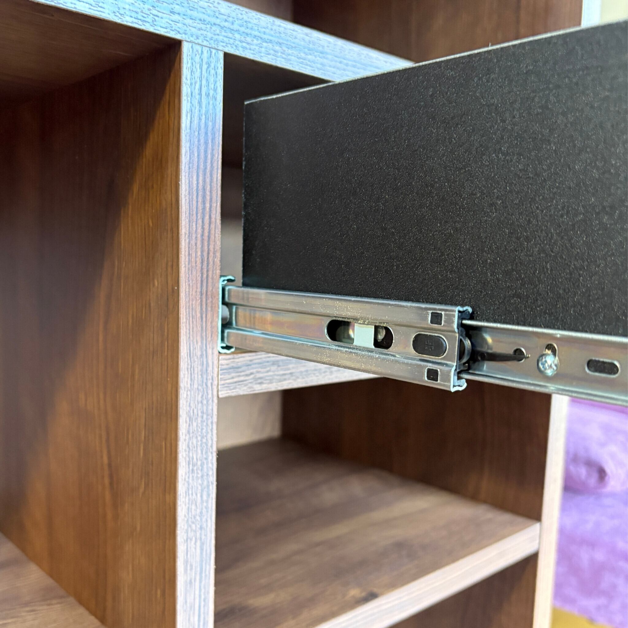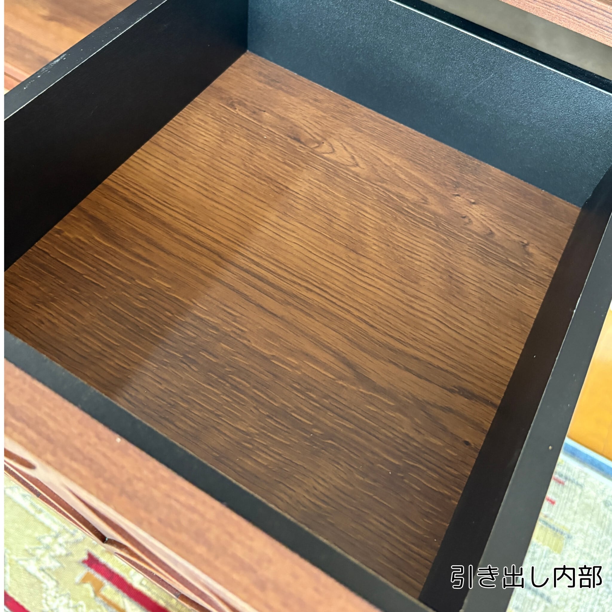 素材は天板部分・扉・引き出しに強化ペーパーを。本体はプリント化粧板を採用。コストを抑えながらスチールの脚で全体を引き締めました。高級感のある見た目ながらリーズナブルな価格です。