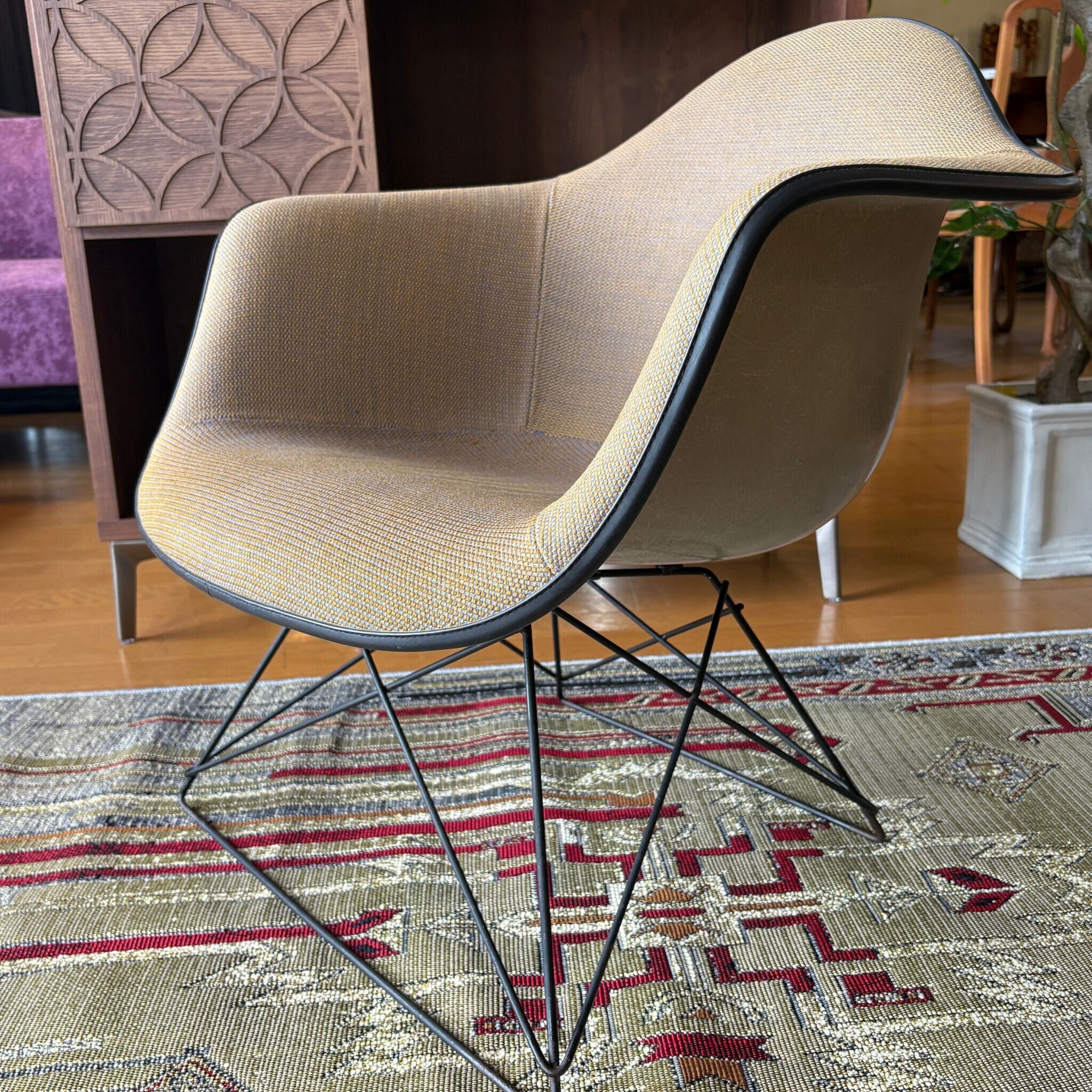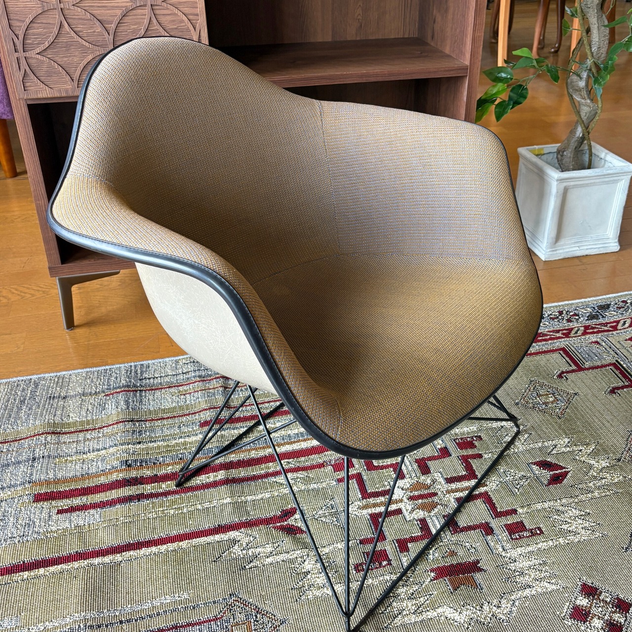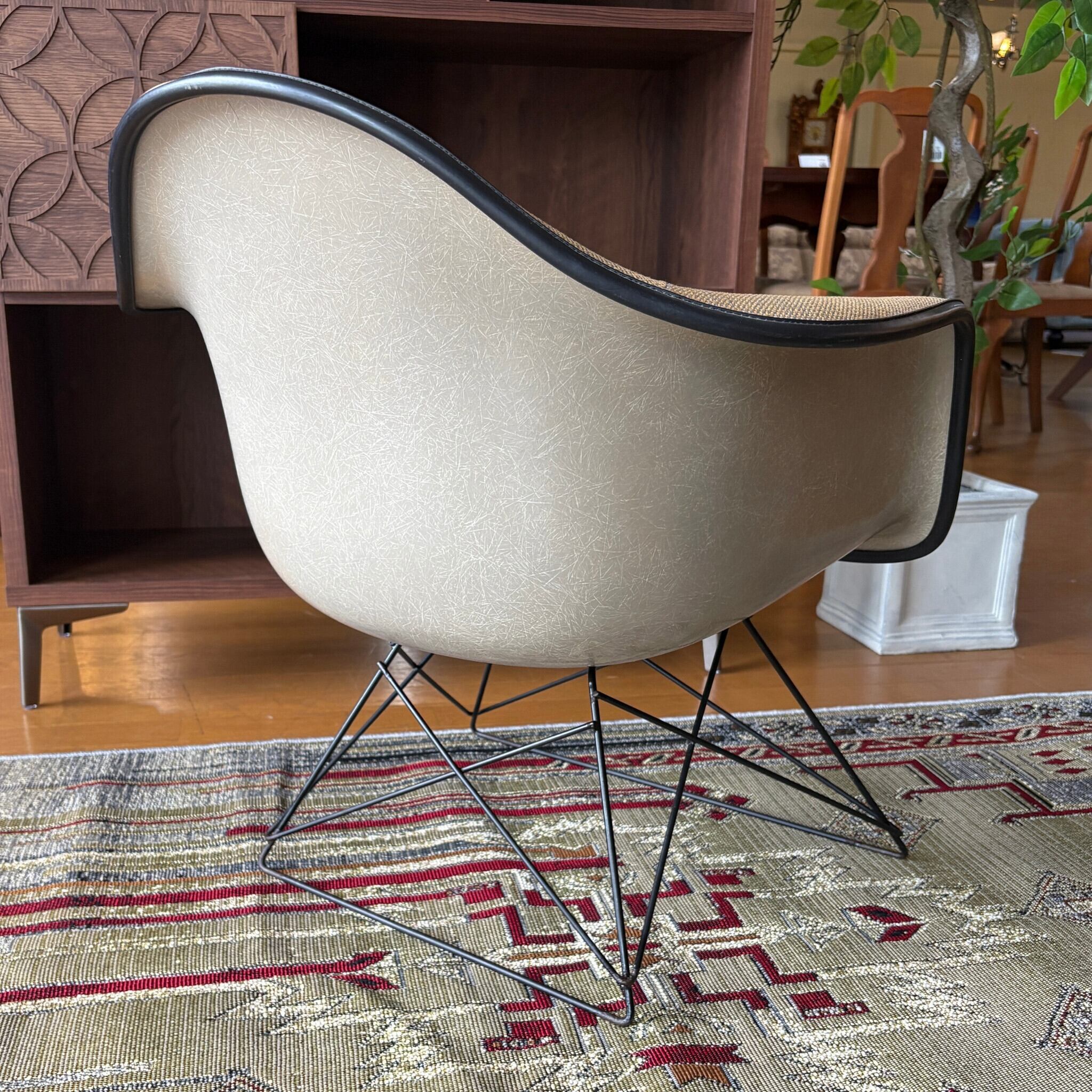 FRP製のヴィンテージシェルチェア自体が高値で取引されますが、そこに「張りぐるみ」という要素が加わることでさらに価値が上がります。オリジナルのファブリックがここまで綺麗な状態で残っているのは珍しいです。