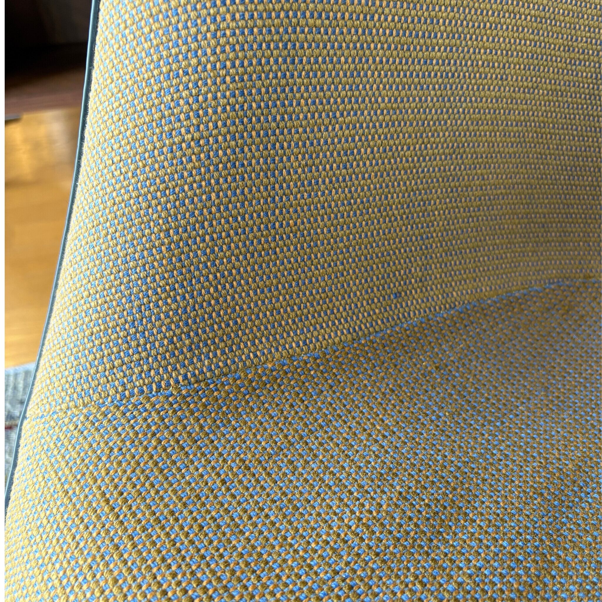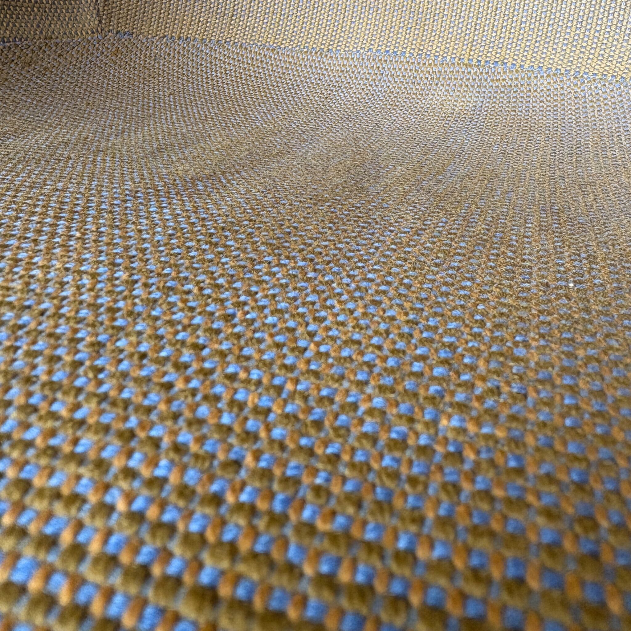 ファブリックは当時に張られたアレキサンダー・ジラードの3317 4017です。遠目の写真だと分かりにくいですがブルーとベージュゴールド系をミックスした独特な色合いでミッドセンチュリーな雰囲気に溢れています。