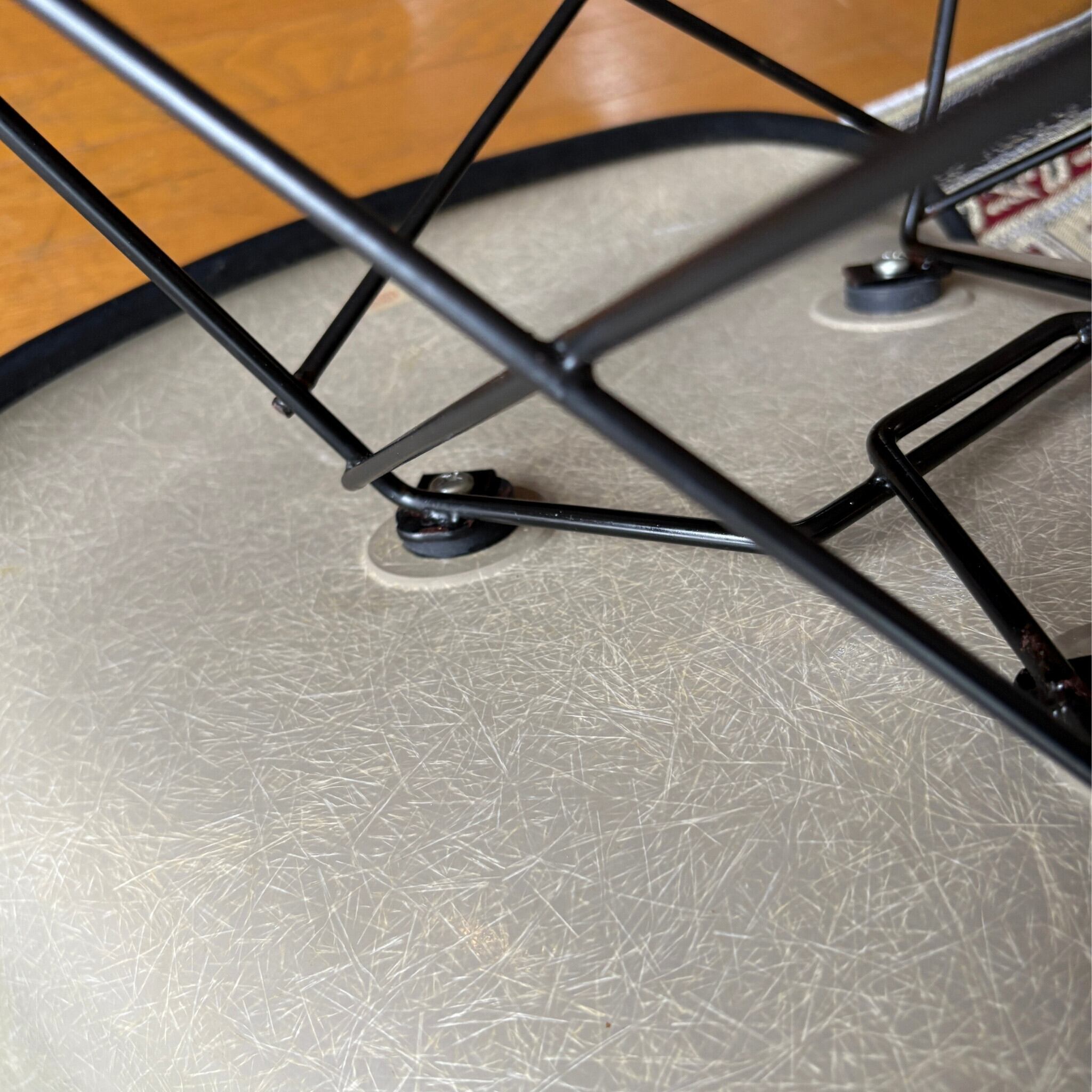 まず特筆すべきはシェルの裏面に見えるグラスファイバーの繊維です。これは現在のポリプロピレン製ではなく初期のFRP(グラスファイバー強化プラスチック)製であることを示しています。繊維が細かく美しいのが特徴的です。この質感は現行のポリプロピレン製では味わえない魅力です。