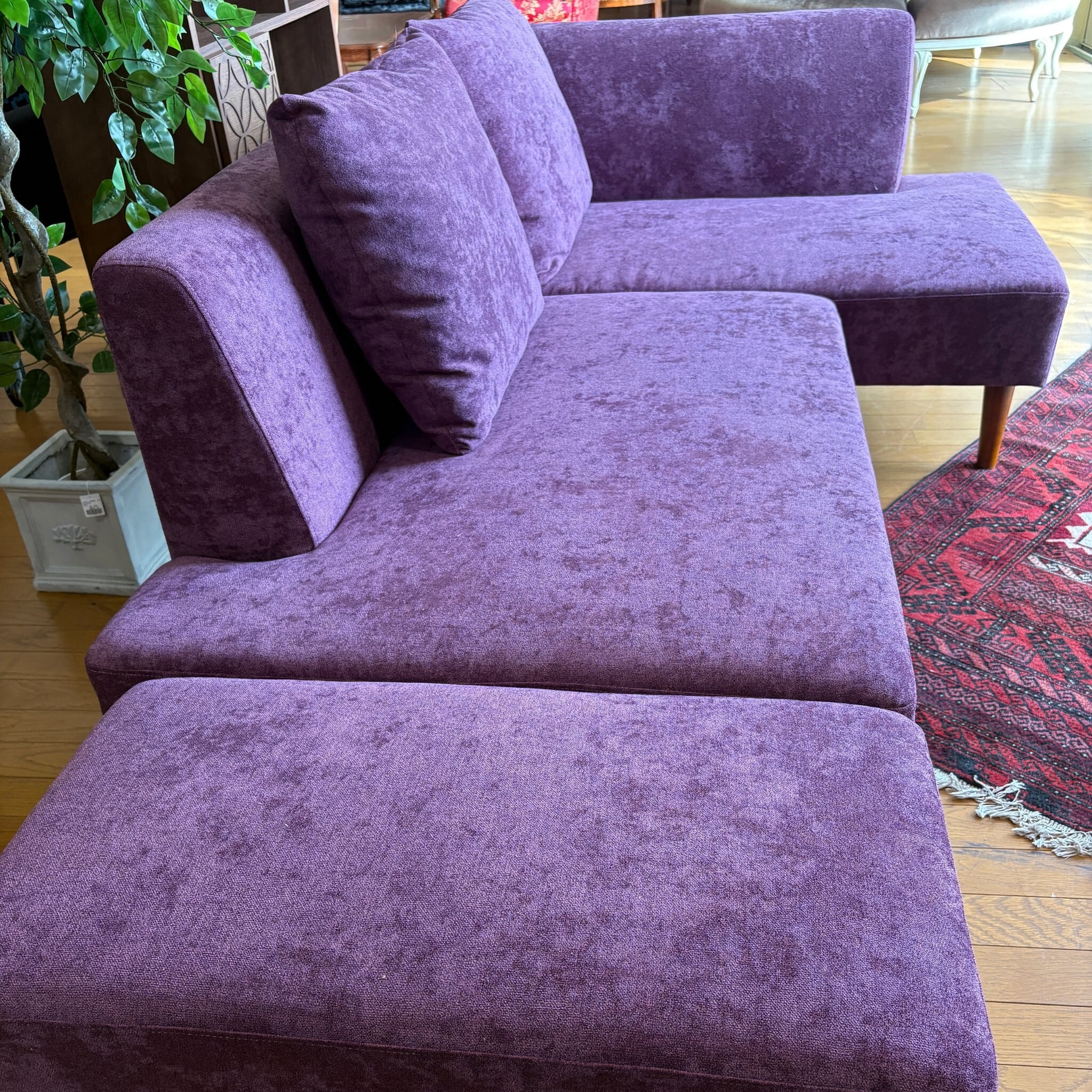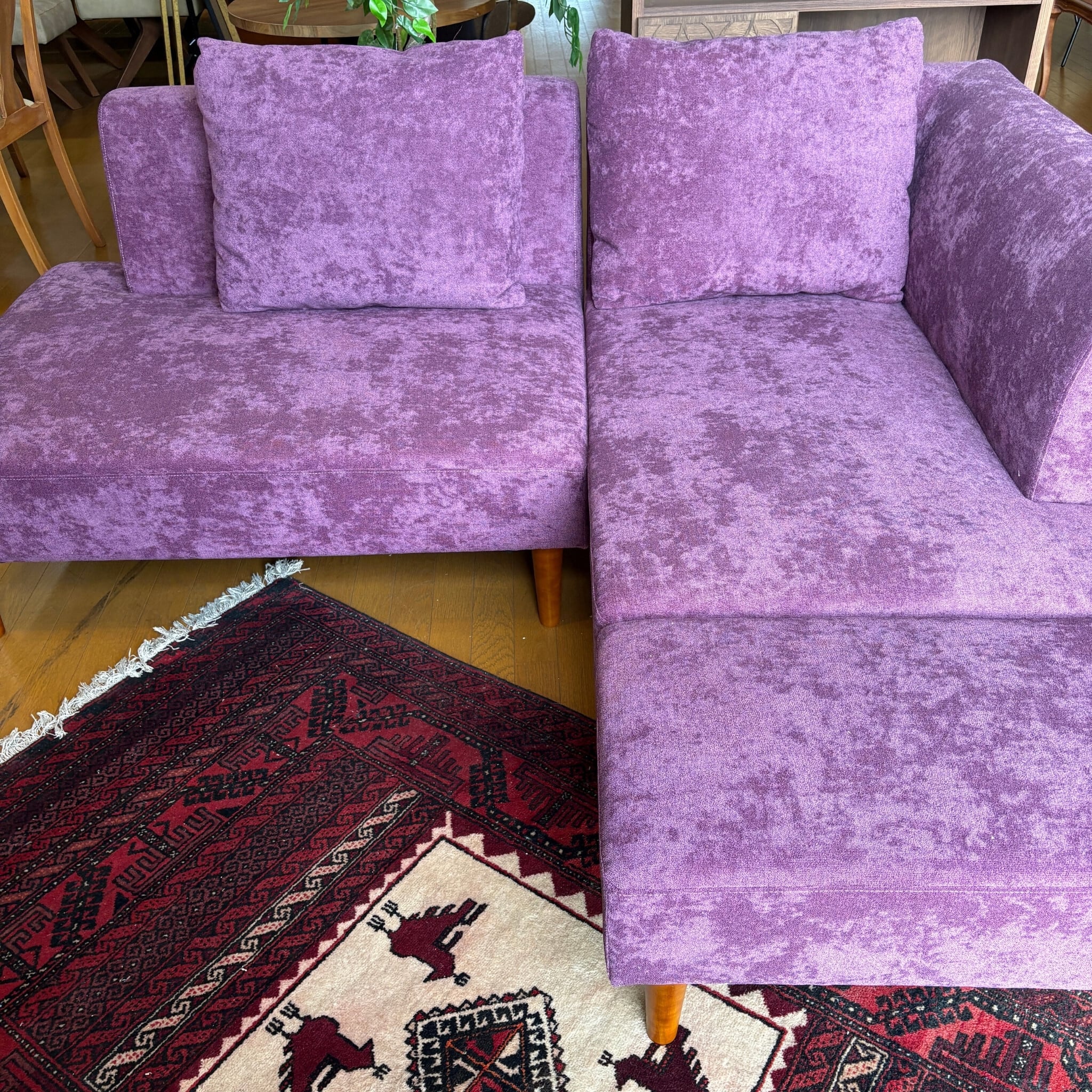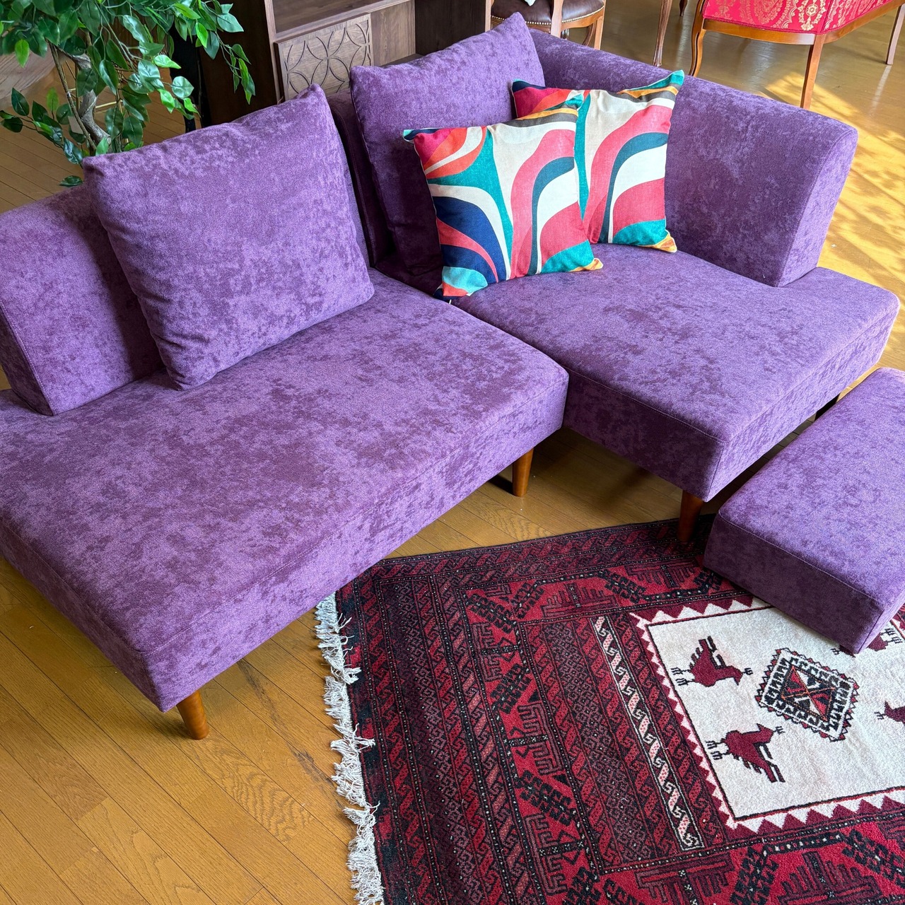 パープルが空間に映えるソファセットです。ソファ2本とオットマンの計3点で構成されています。この価格帯で紫のソファは珍しく、人と違うものをお探しの方へおすすめです。※画像1枚目に写っているクッション2個は撮影用小物で別売りです※
