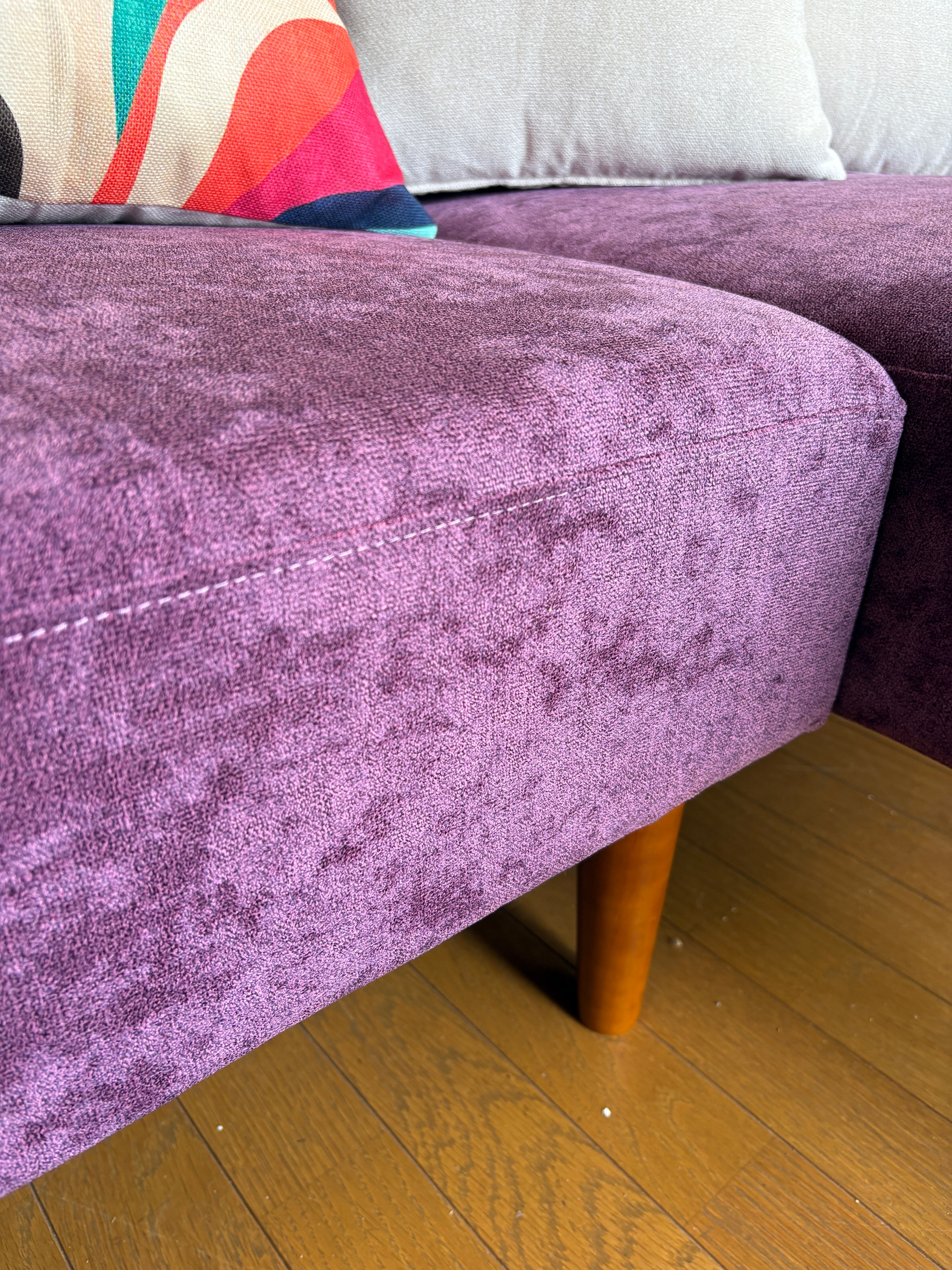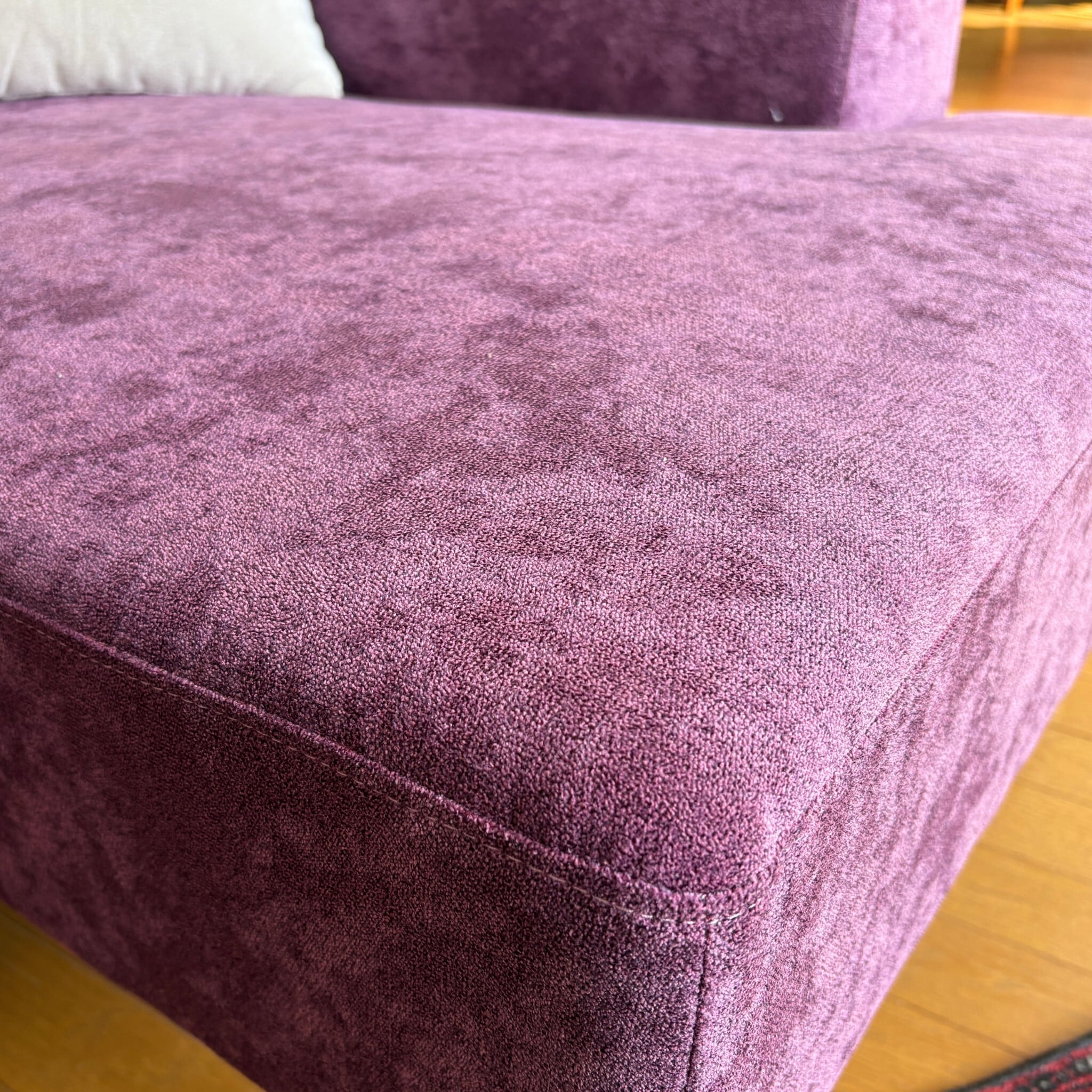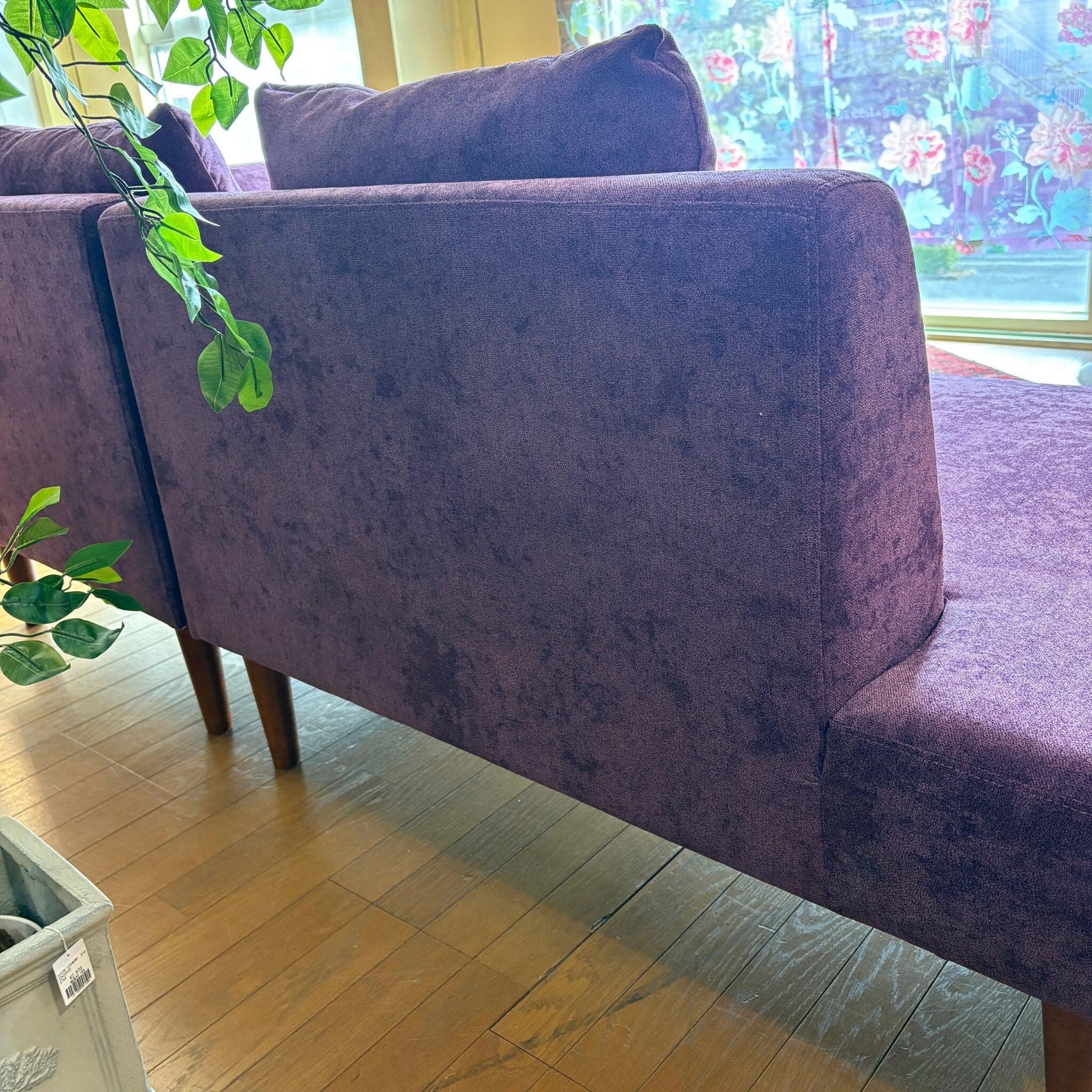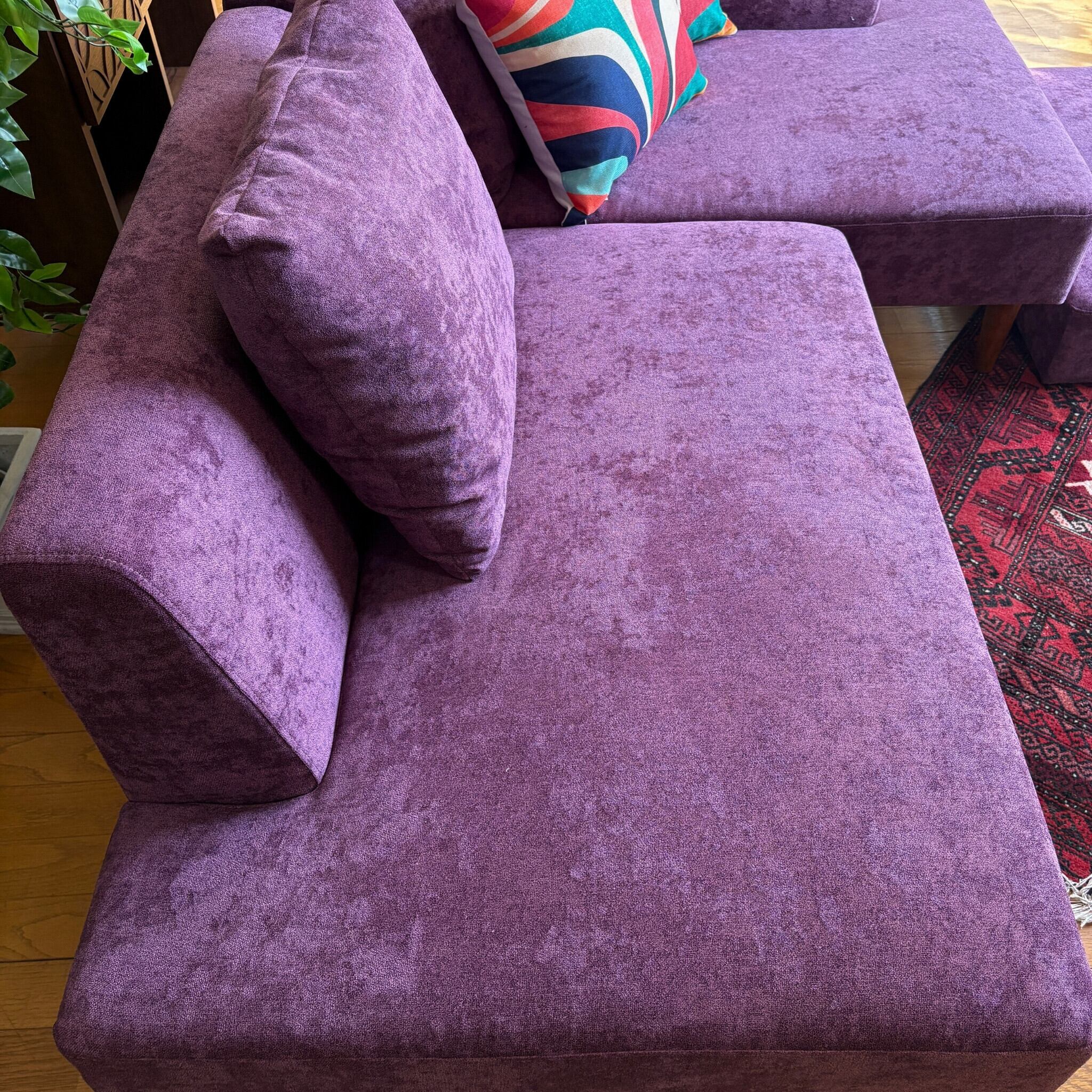 パープルが空間に映えるソファセットです。ソファ2本とオットマンの計3点で構成されています。この価格帯で紫のソファは珍しく、人と違うものをお探しの方へおすすめです。※画像1枚目に写っているクッション2個は撮影用小物で別売りです※