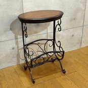 天板は使い込まれたような風合いの木製で小物を置いたり、飲み物を楽しんだりするのに最適なサイズ感です。フレーム下部には雑誌や新聞などを美しく収納できるデザイン性の高いマガジンラックが一体化しています。散らかりがちなリビングや書斎をすっきりと見せながらインテリアのアクセントとしても機能します。