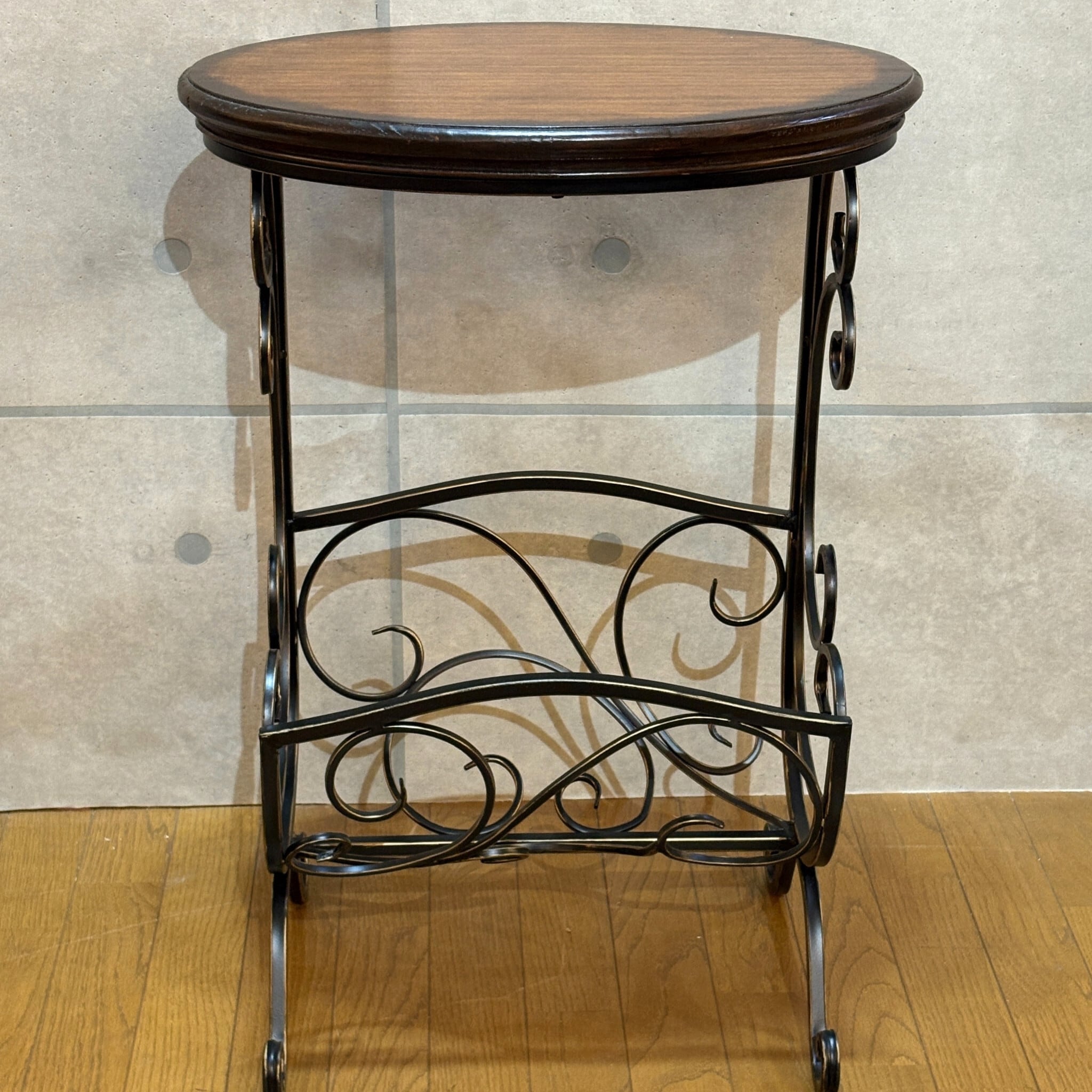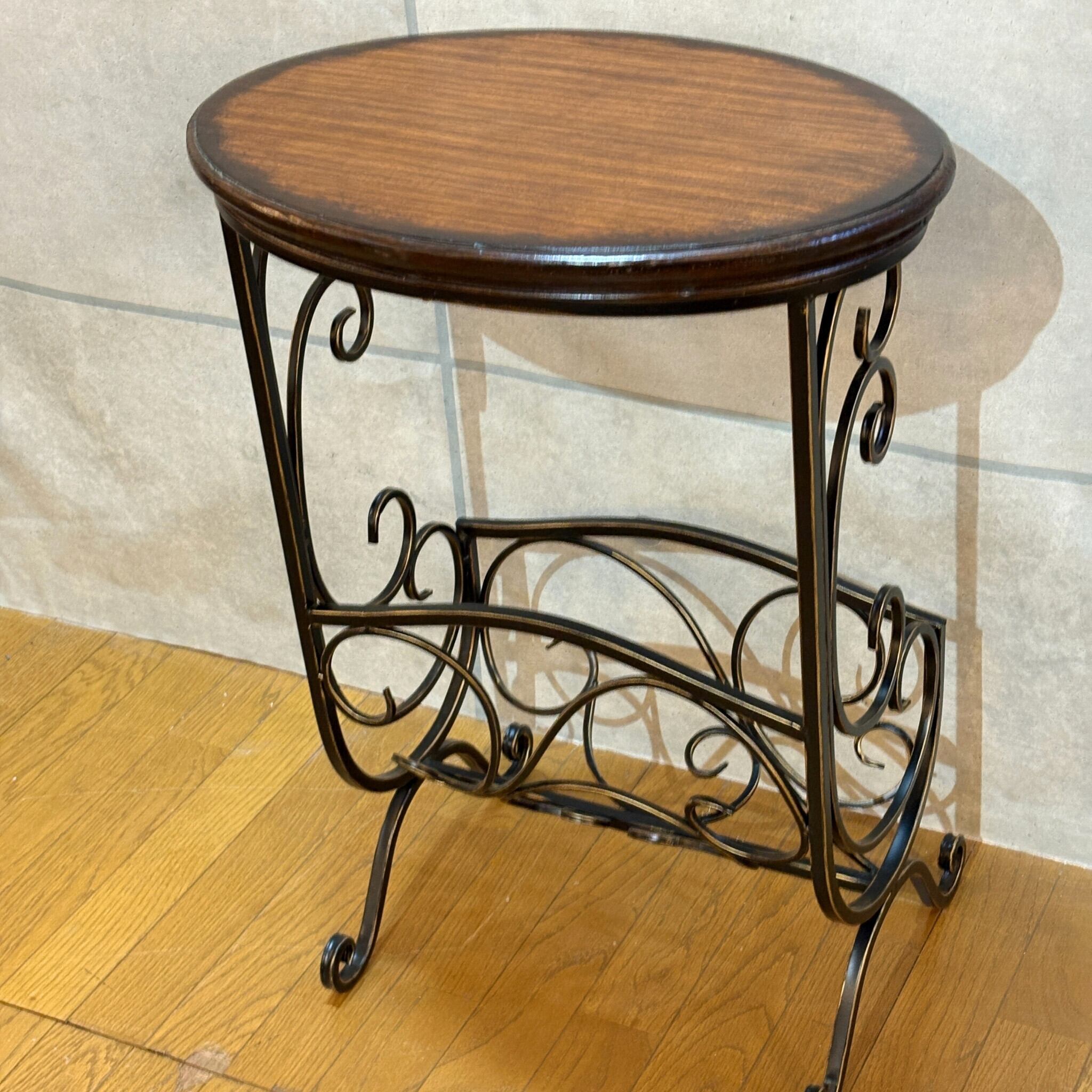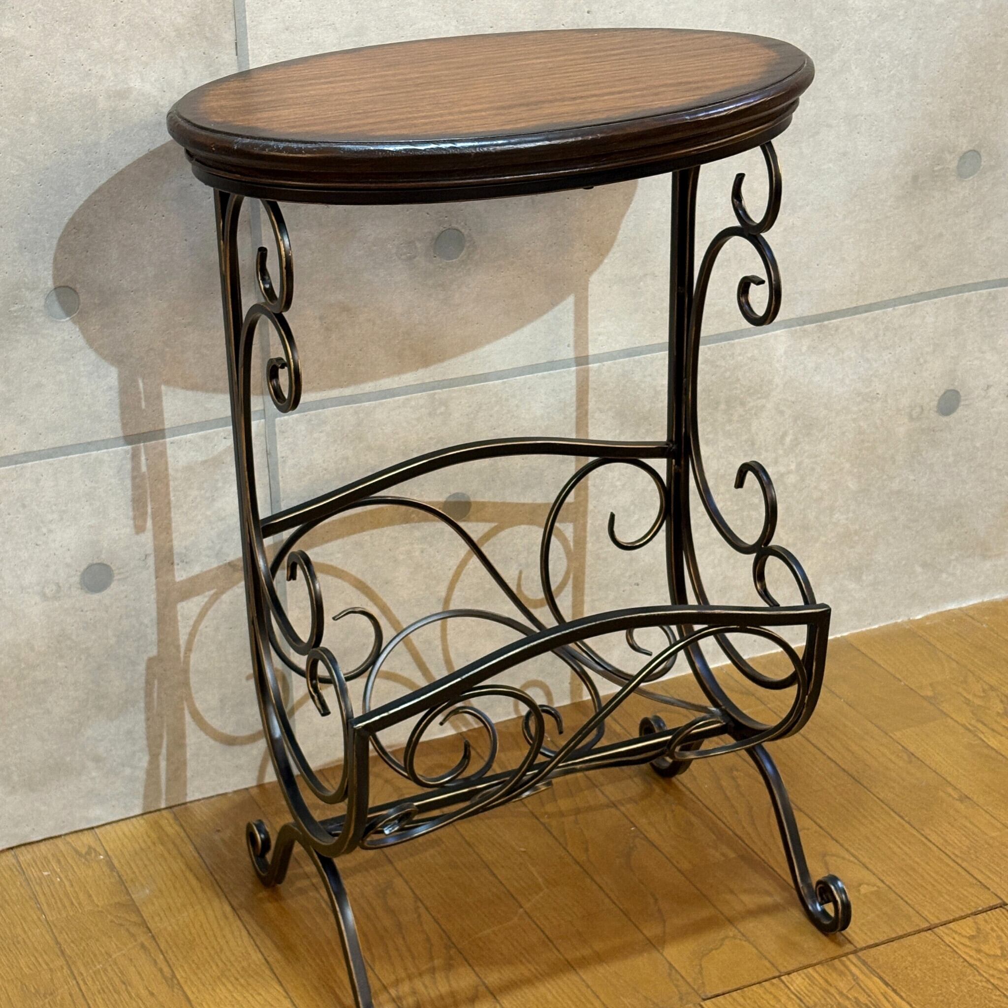 クラシカルな曲線美が目を引くマガジンラック付きサイドテーブルです。ヴィンテージやアンティークの家具とも相性抜群です。