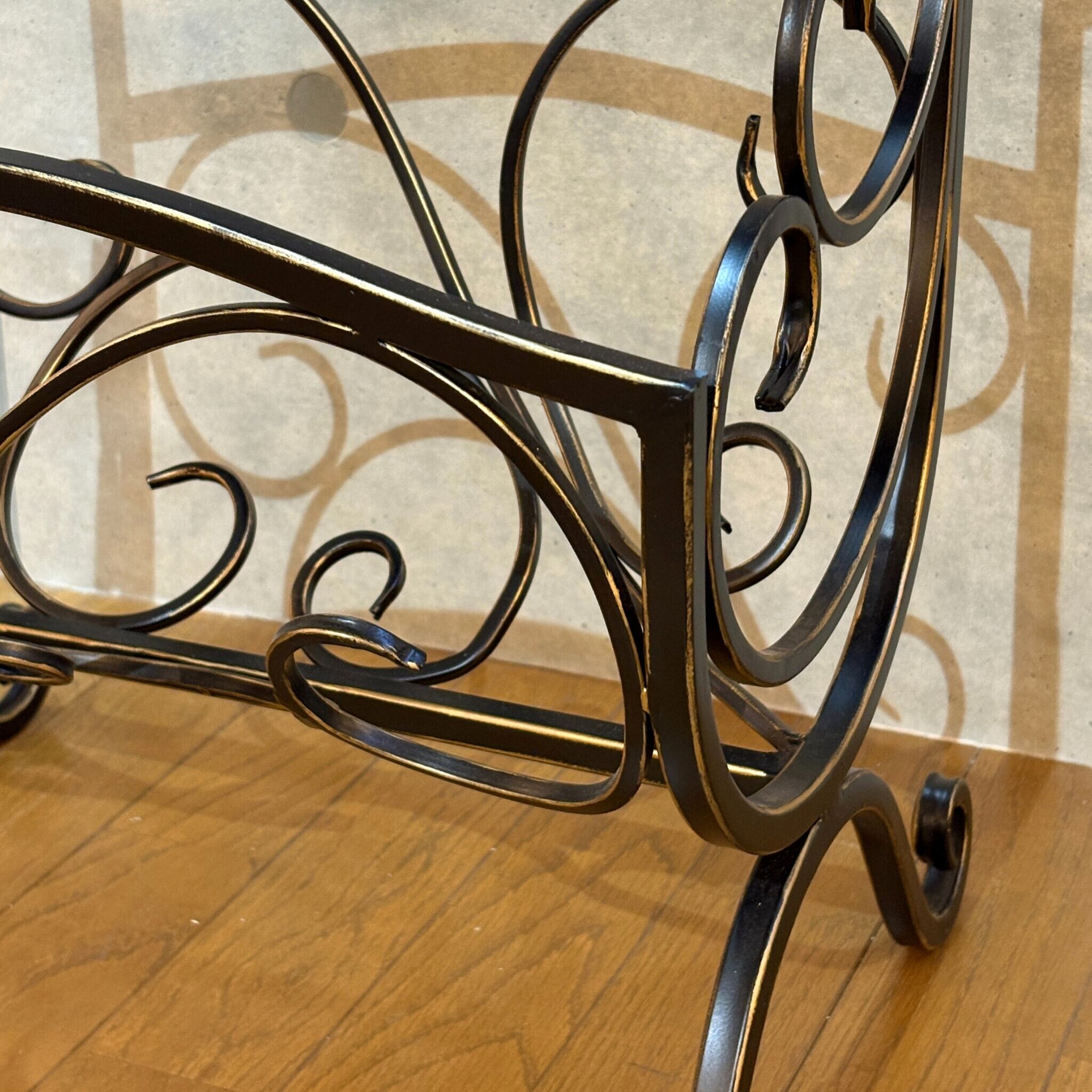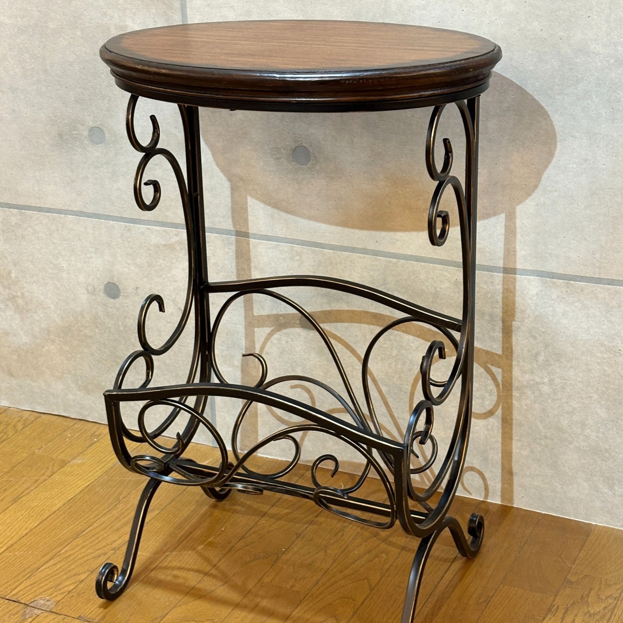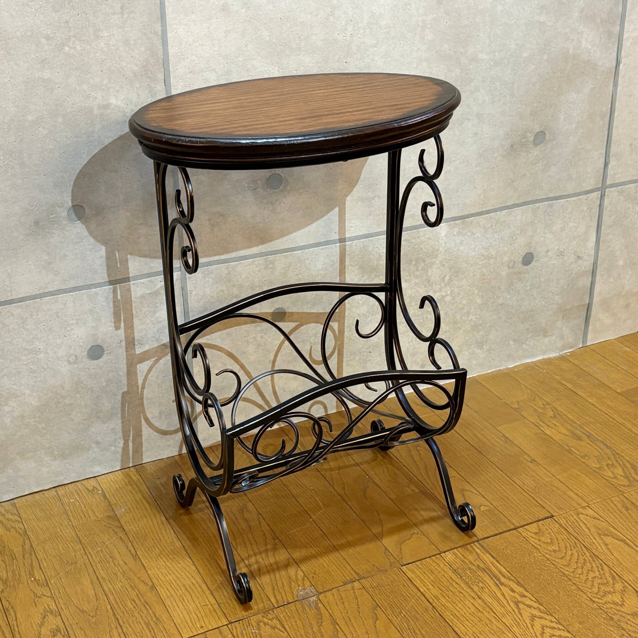 クラシカルな曲線美が目を引くマガジンラック付きサイドテーブルです。ヴィンテージやアンティークの家具とも相性抜群です。