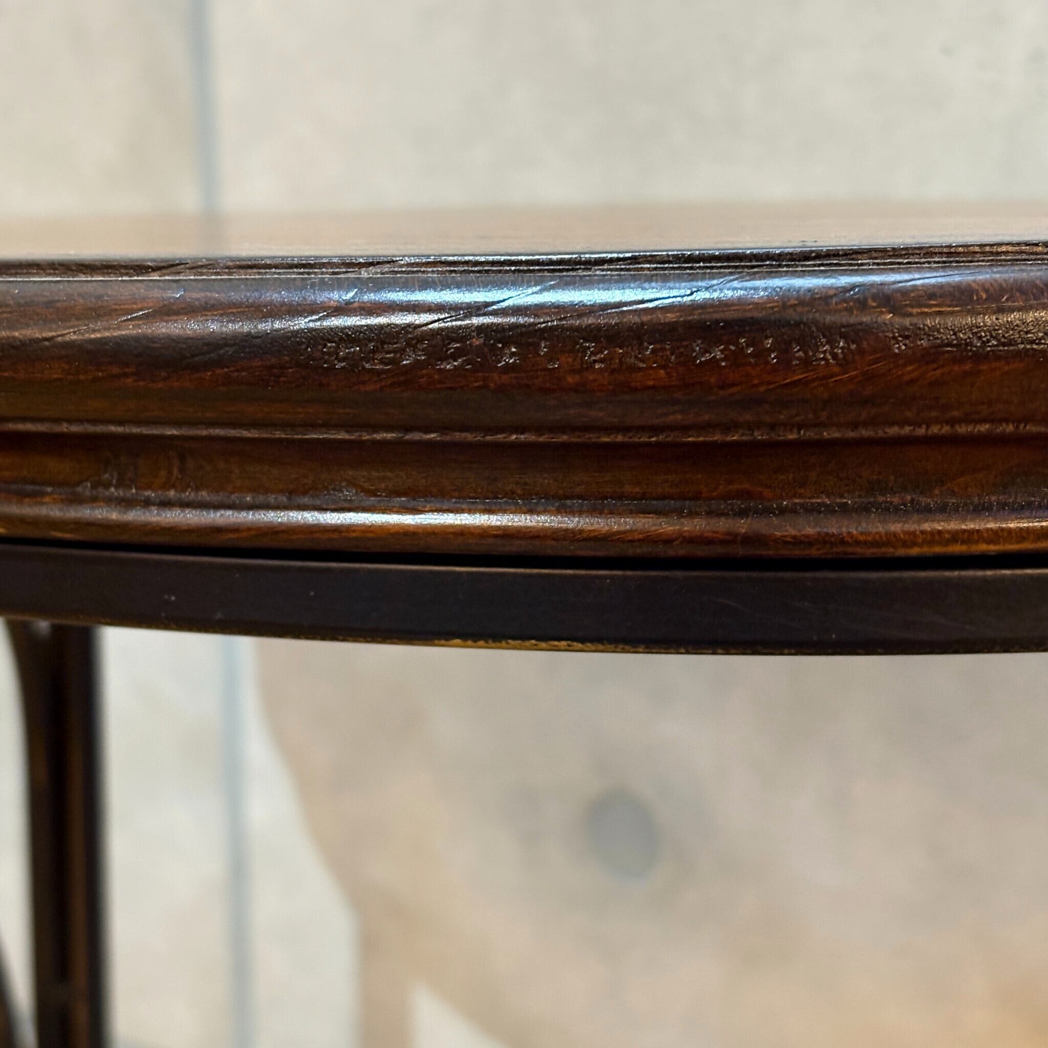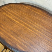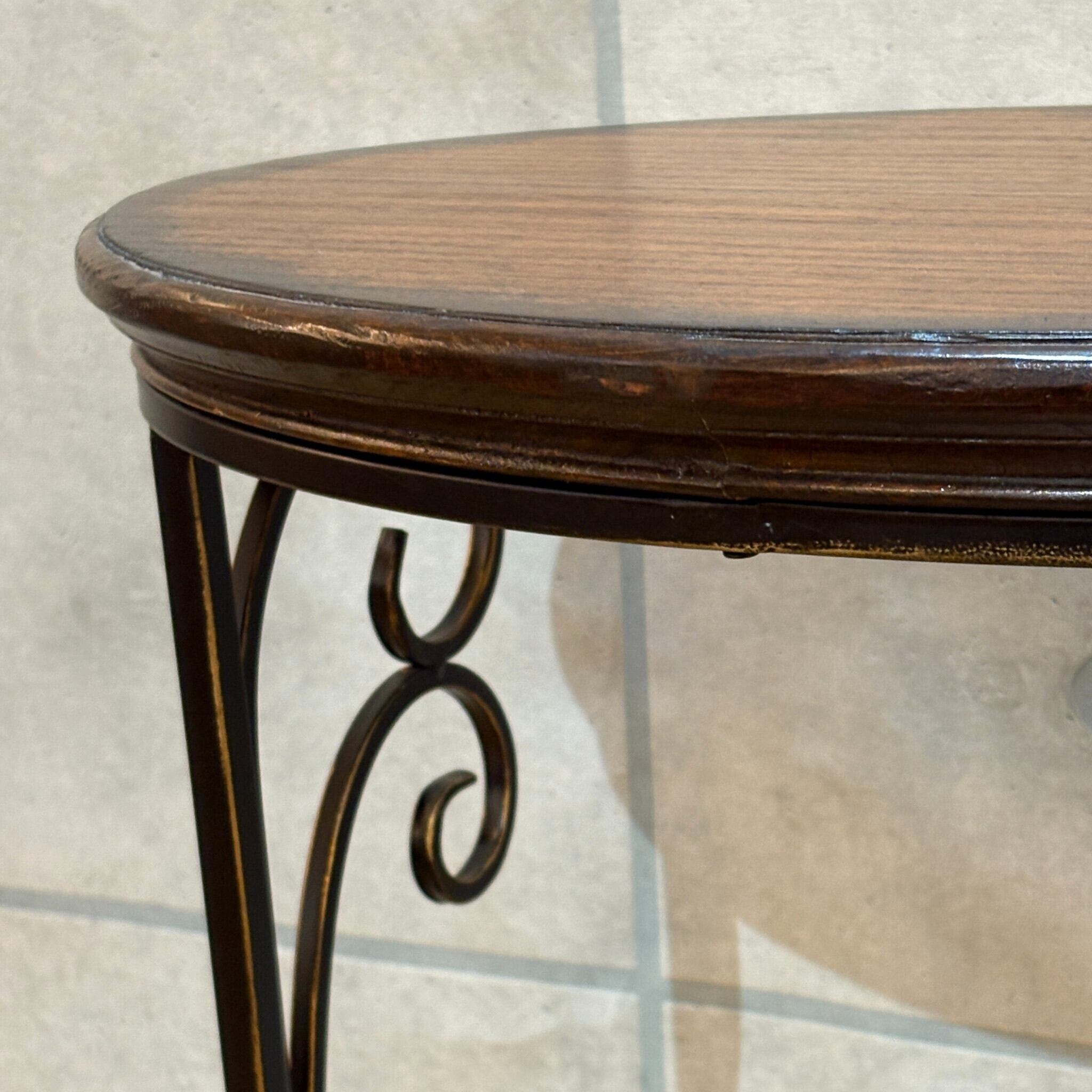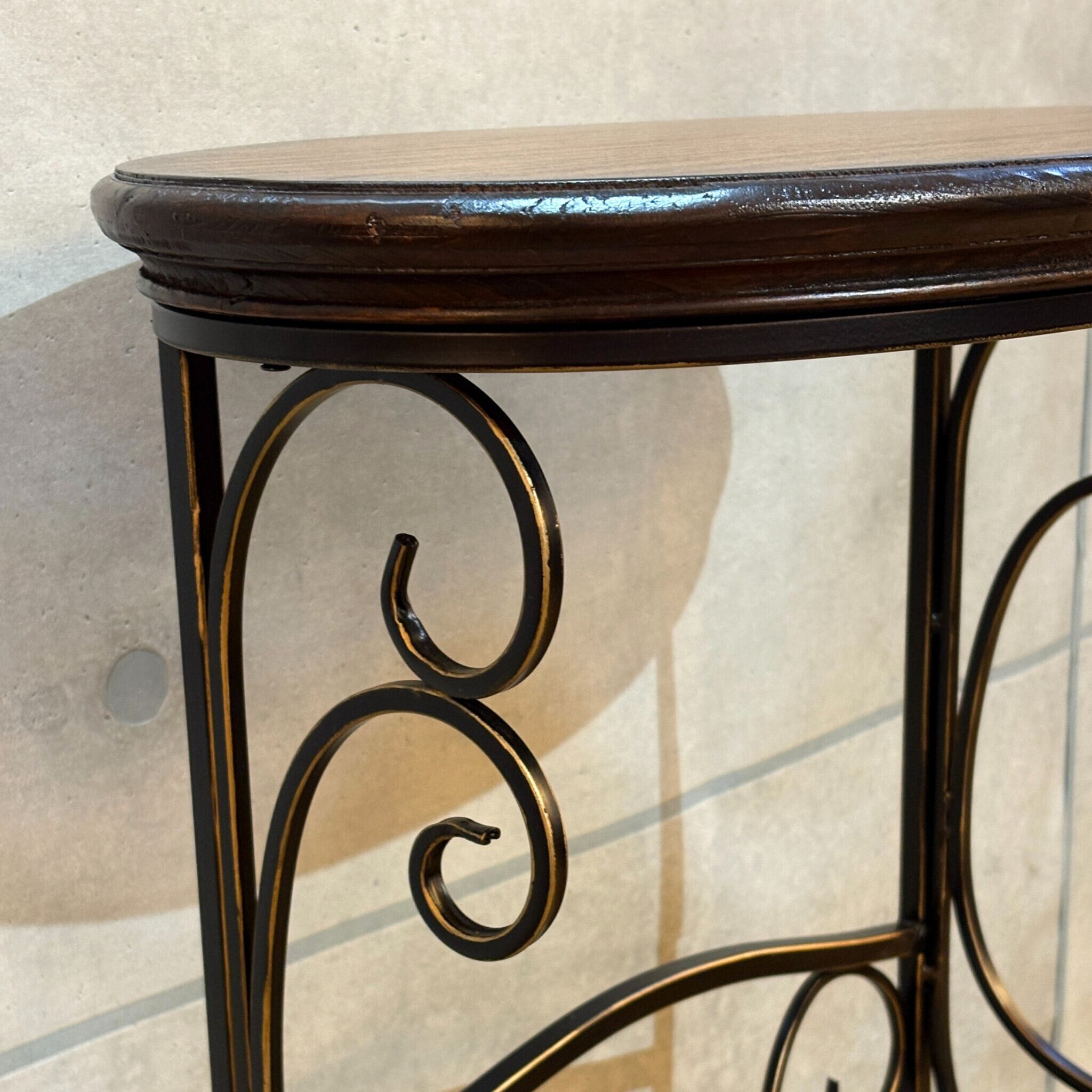 アイアンフレームの優雅な曲線と温かみのある木製天板の組み合わせが特徴。洗練されたデザインはどんな空間にも上品さと落ち着きを添えてくれます。