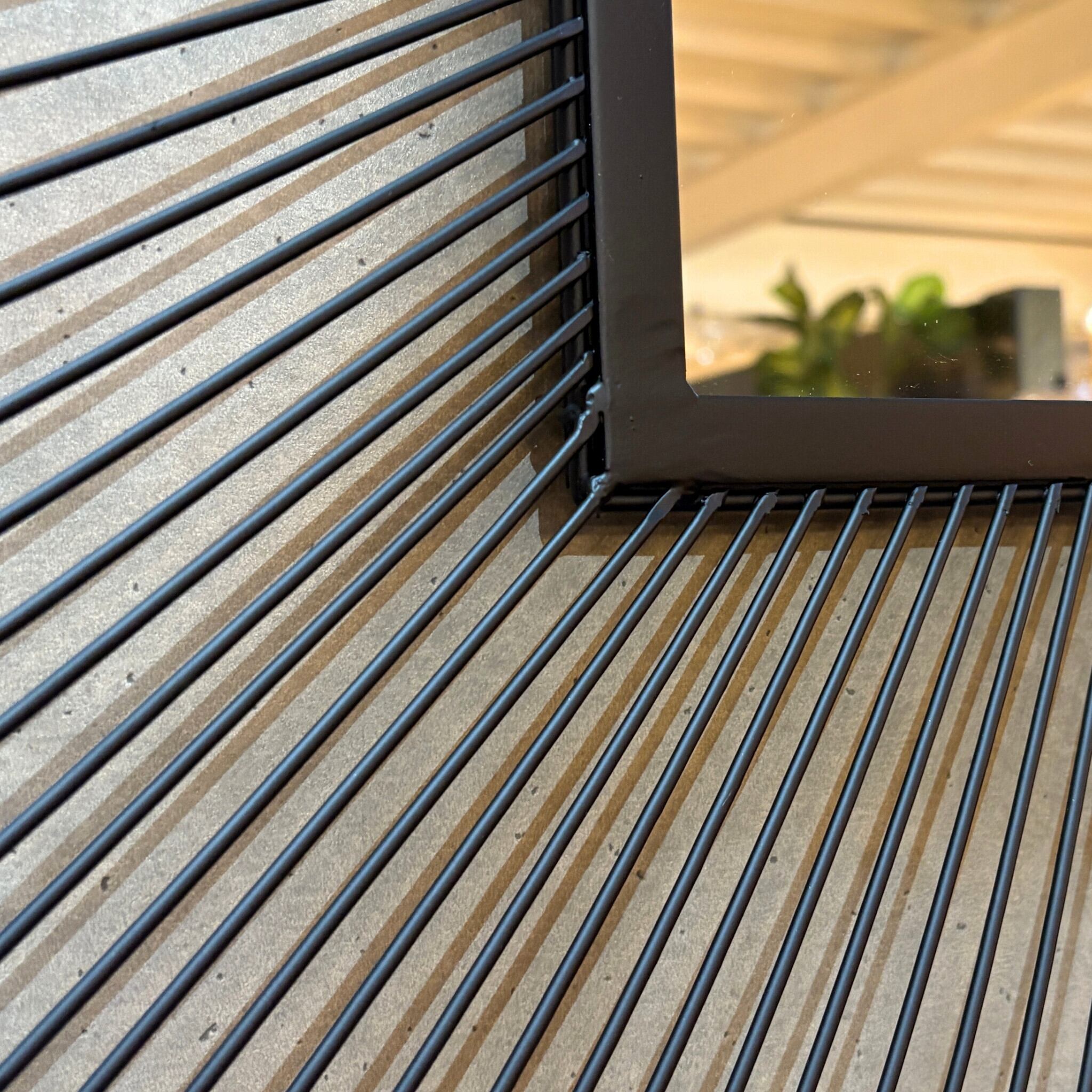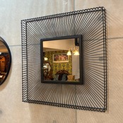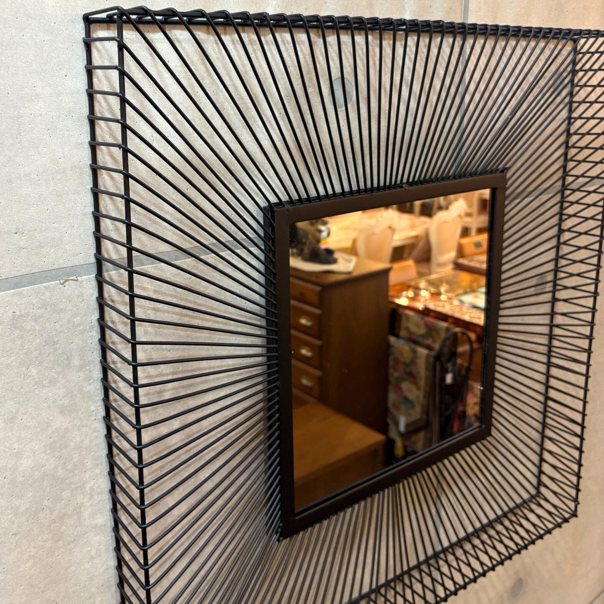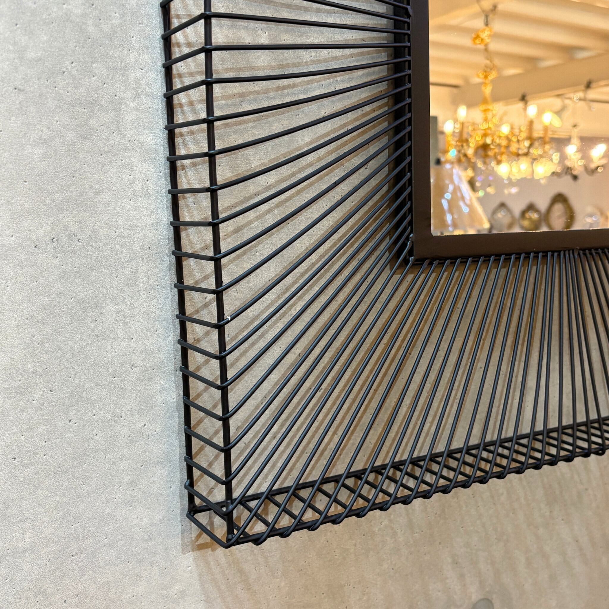 シャープなブラックアイアンのワイヤーがまるで太陽の光が放射状に広がるように、力強くも繊細なデザインを創り出しています。鏡面を中心に広がるこのワイヤーフレームは見る角度によって表情を変え、空間に奥行きとモダンなリズムを与えてくれます。