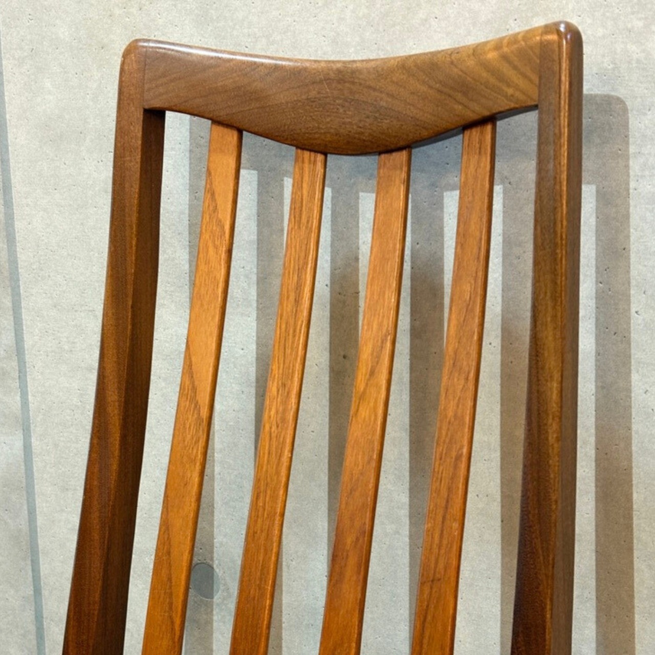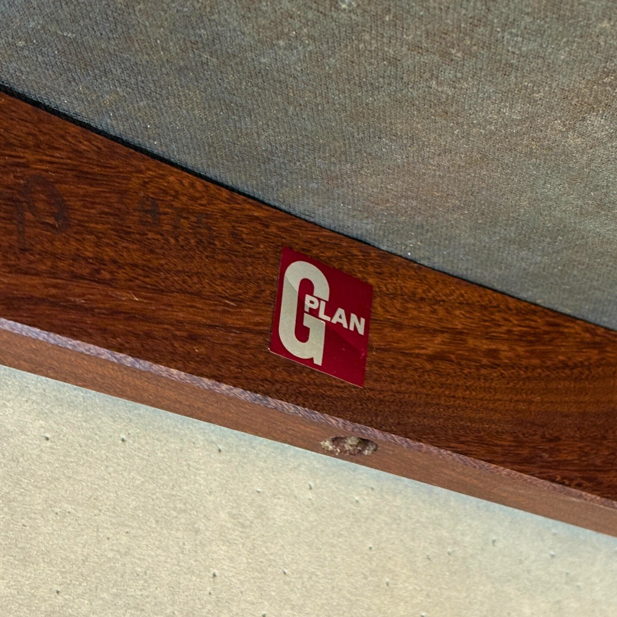 特徴: 背もたれの美しいカーブ、チーク材の木目、G-PLANロゴシール残存