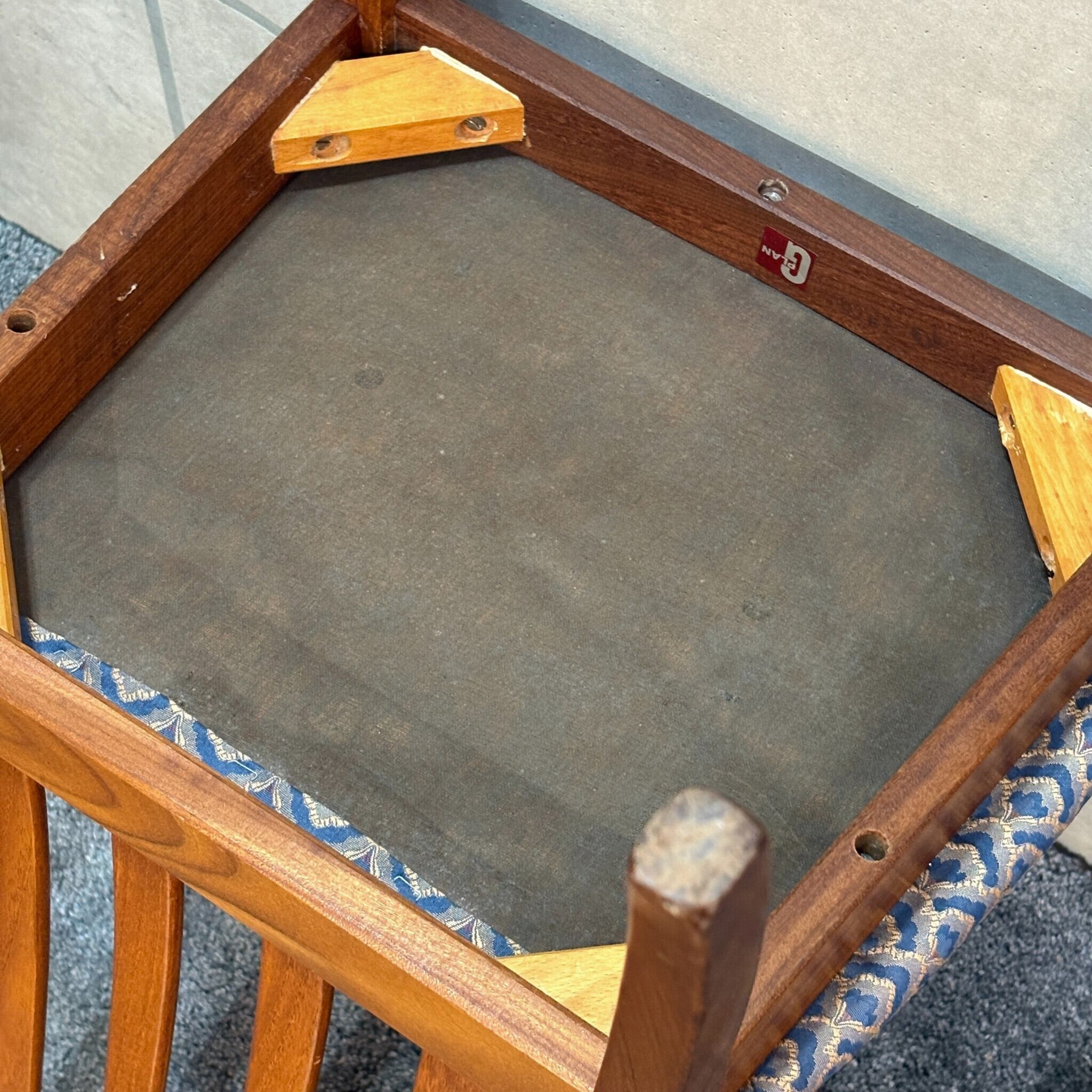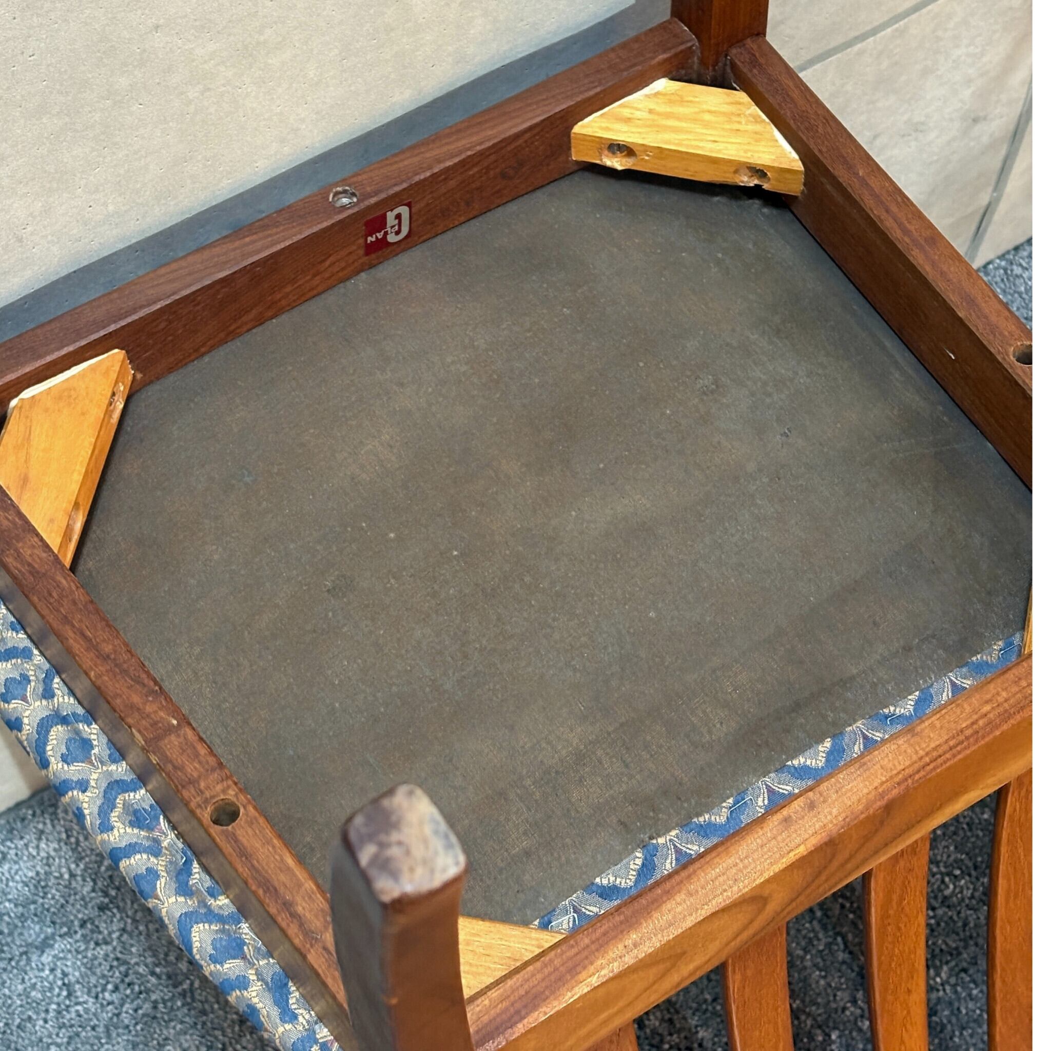G-PLANが1960年代後半から1970年代にかけて製造していたことを示す赤色のロゴシールが残されており、その確かな出自と歴史を物語っています。半世紀以上の時を経て使い込まれたチーク材の風合いが新品にはない深みと物語性を感じさせます。