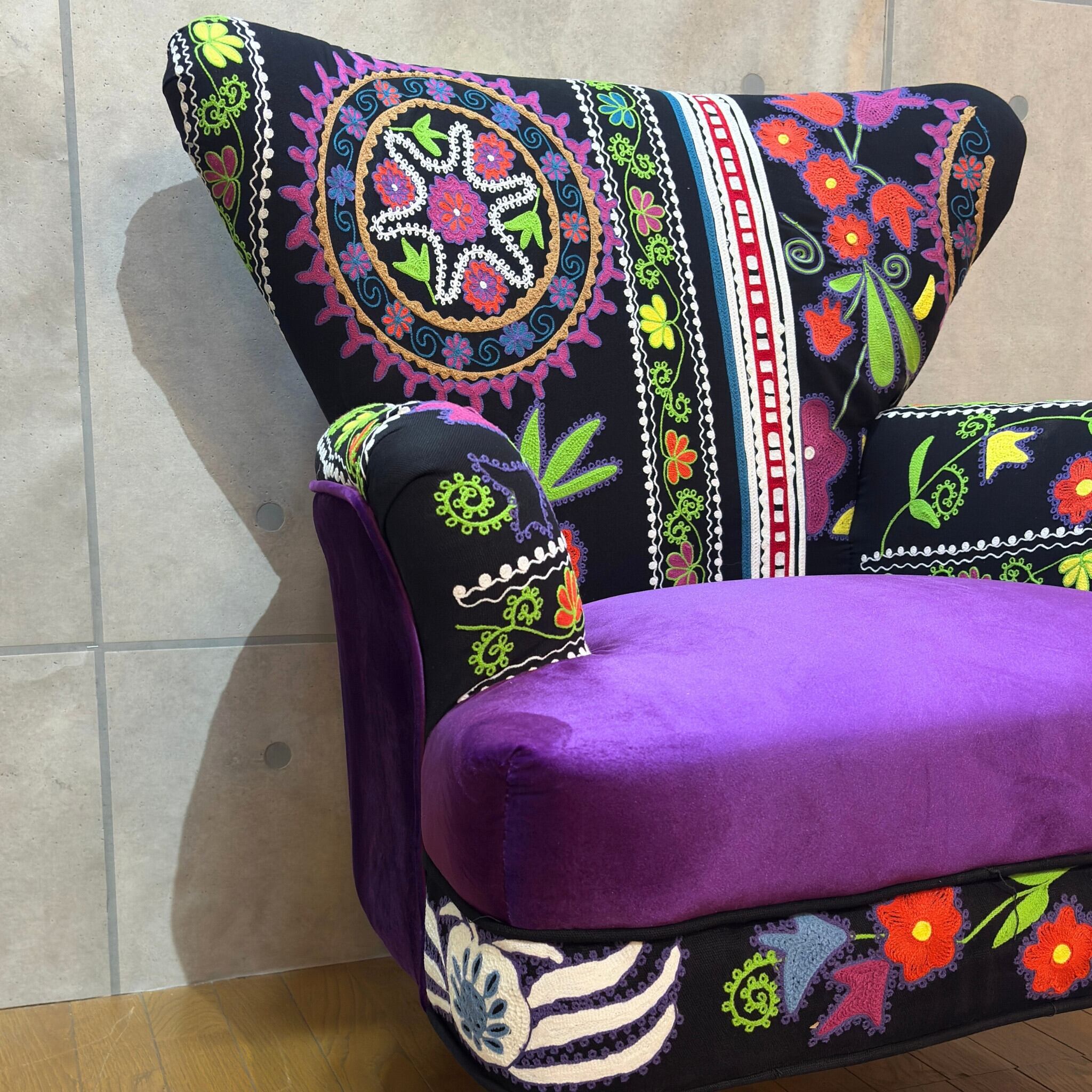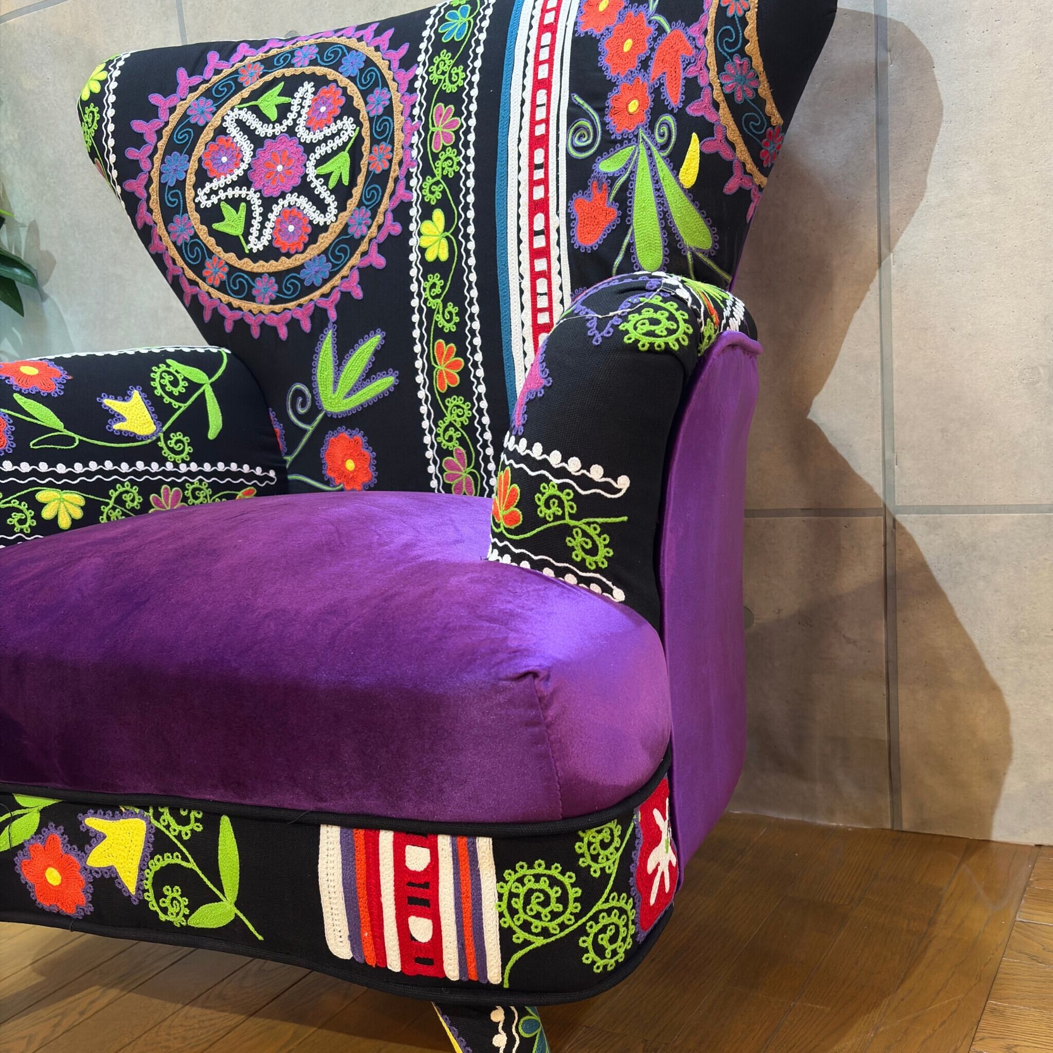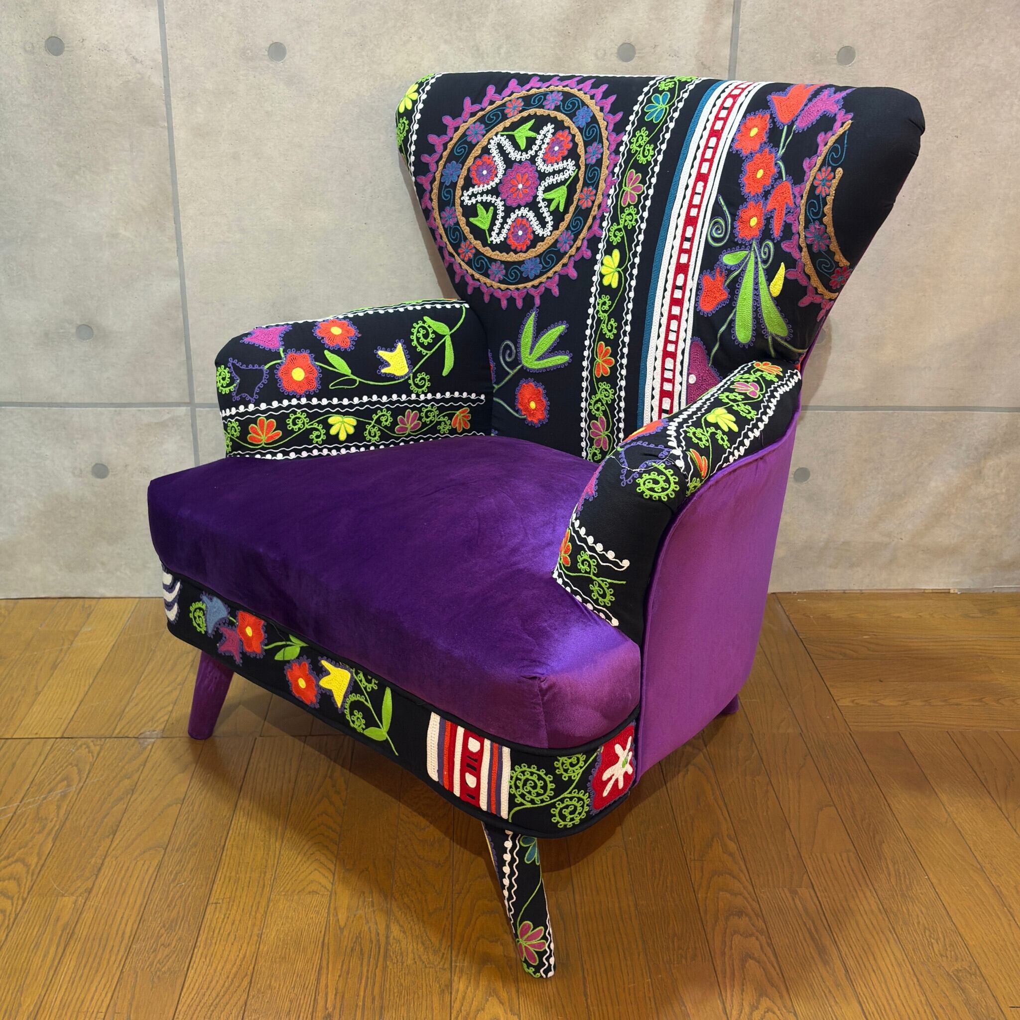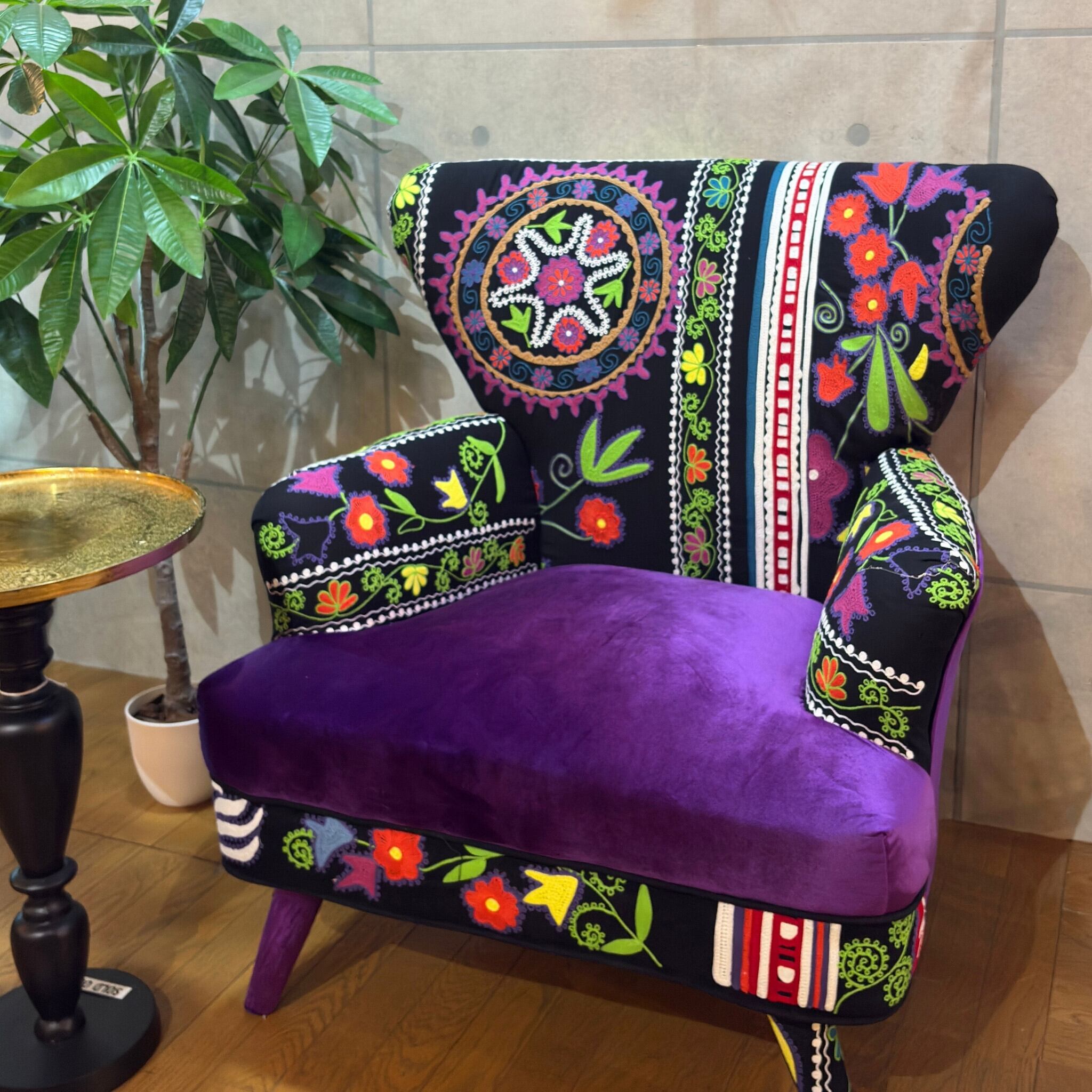 【新品】個性派アームチェア ブラック系 エキゾチック| 一人掛け 1Pソファ ラウンジチェア | ベルベット調×刺繍ファブリック | 民族調デザイン |