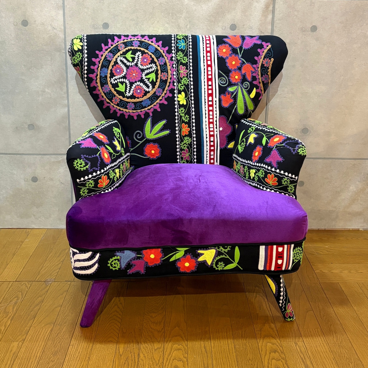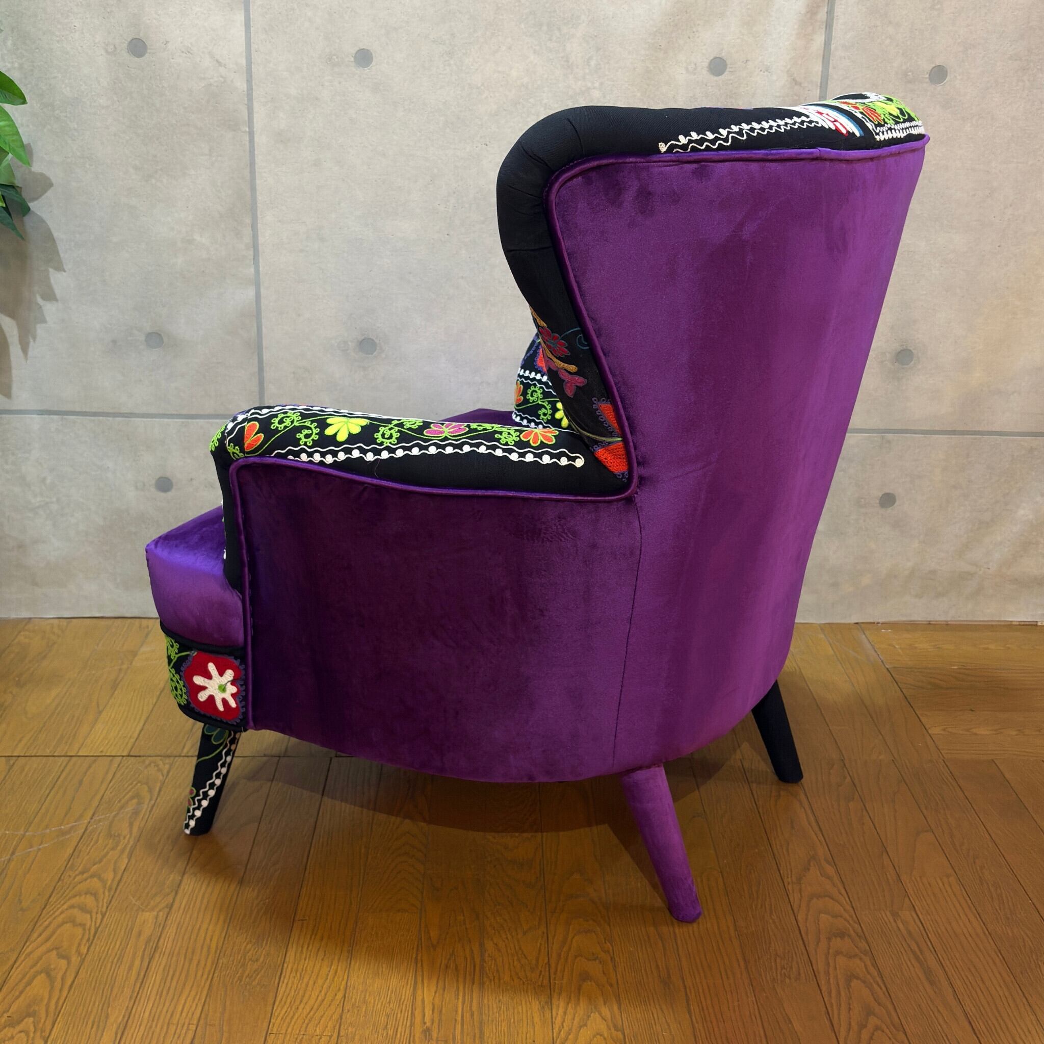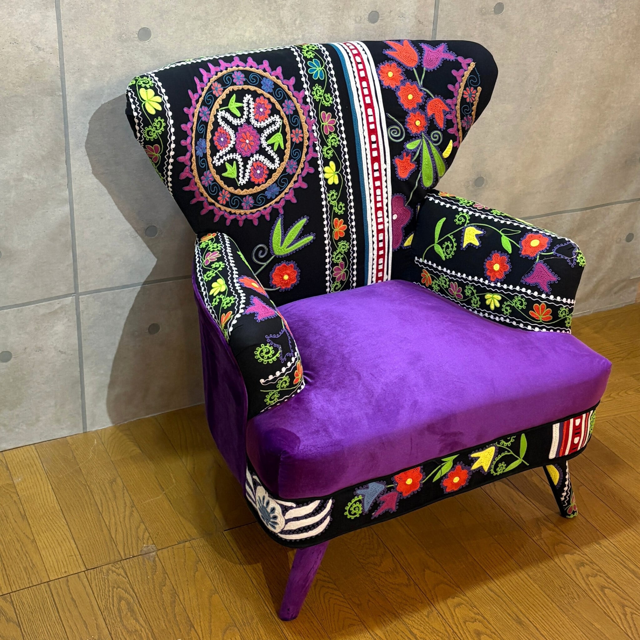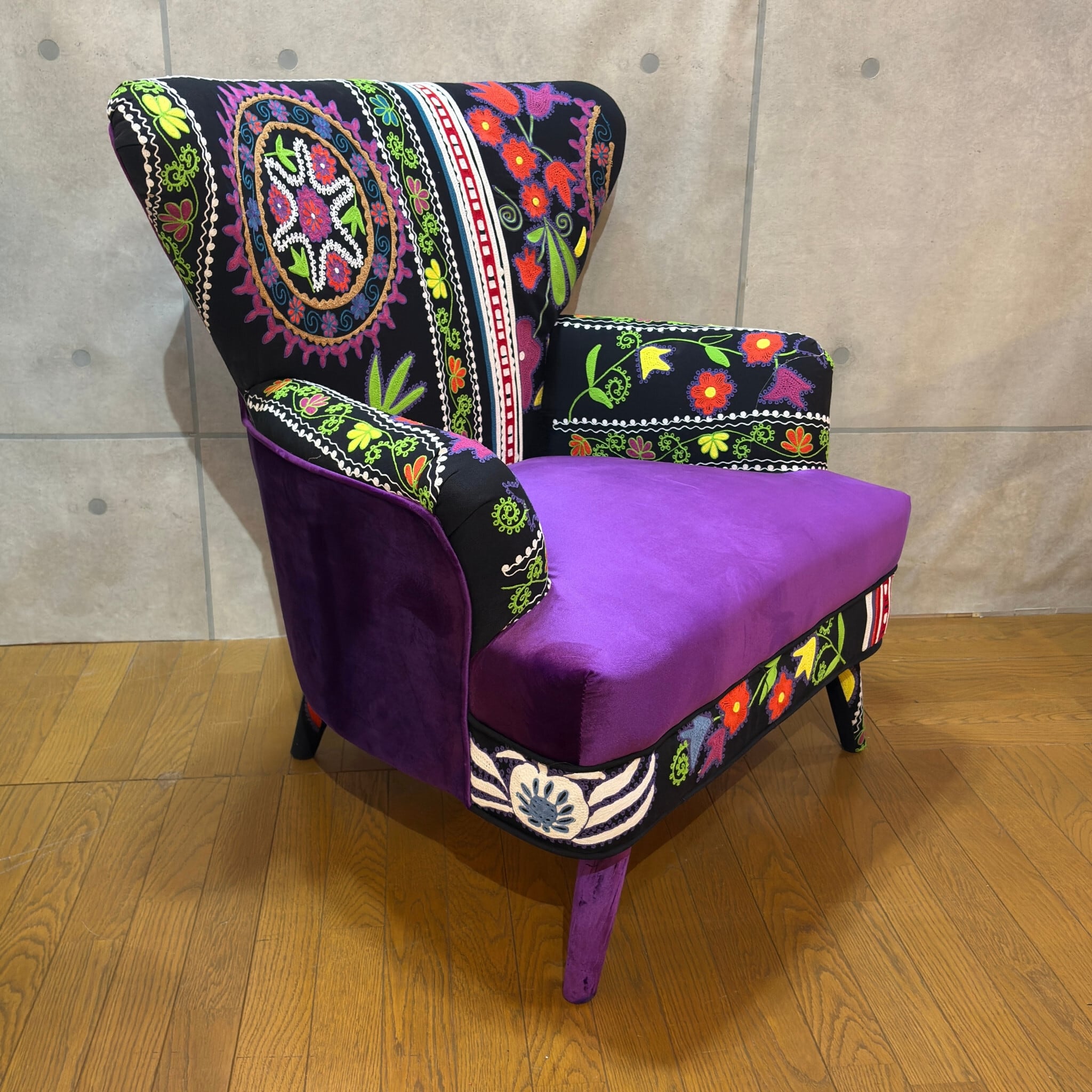 【新品】個性派アームチェア ブラック系 エキゾチック| 一人掛け 1Pソファ ラウンジチェア | ベルベット調×刺繍ファブリック | 民族調デザイン |