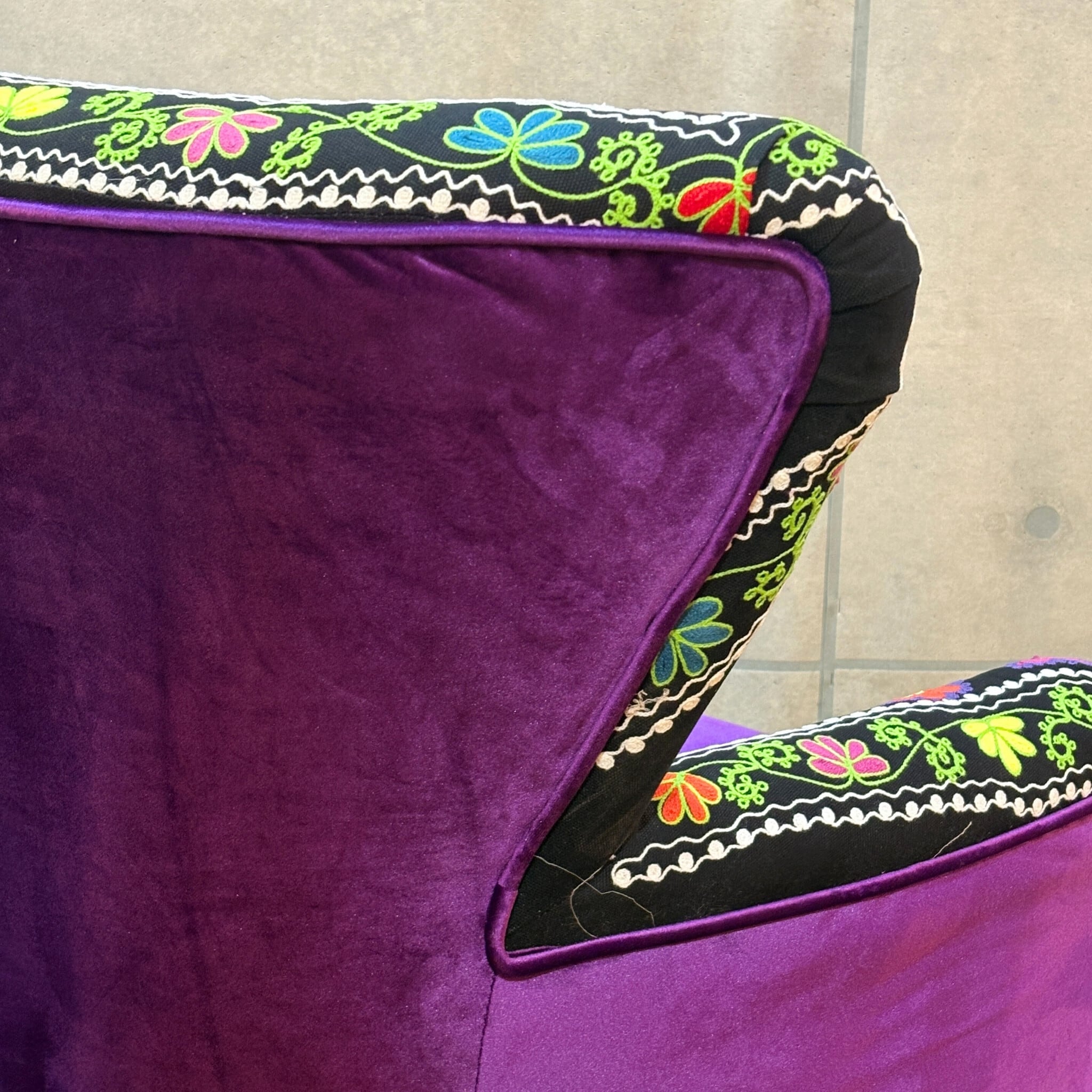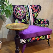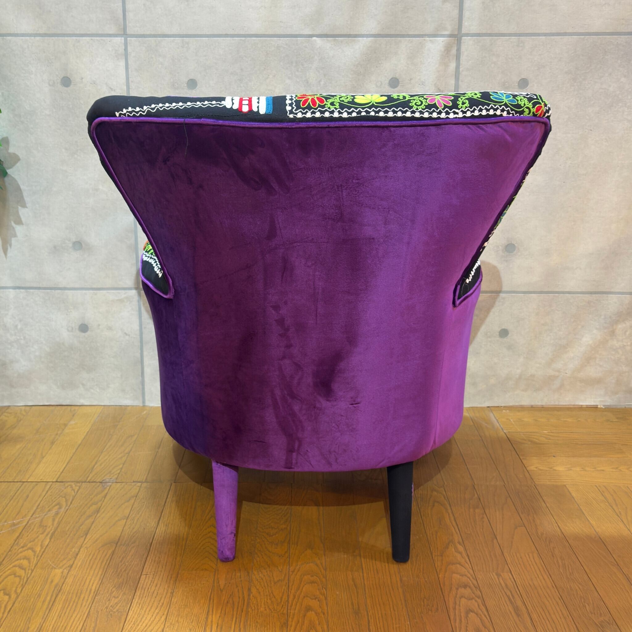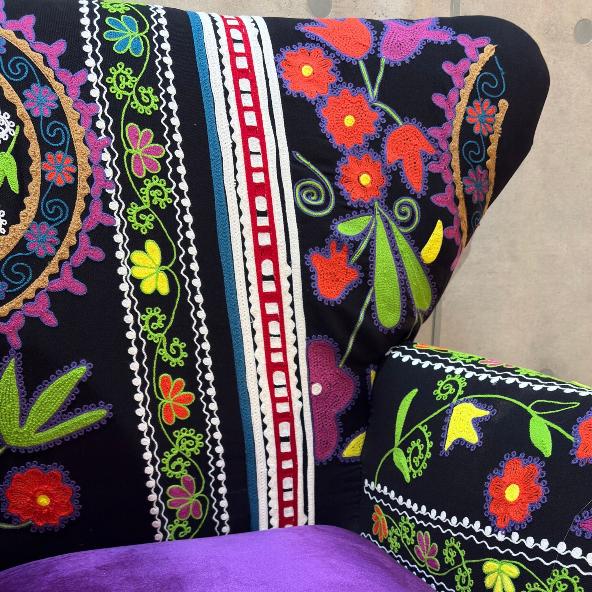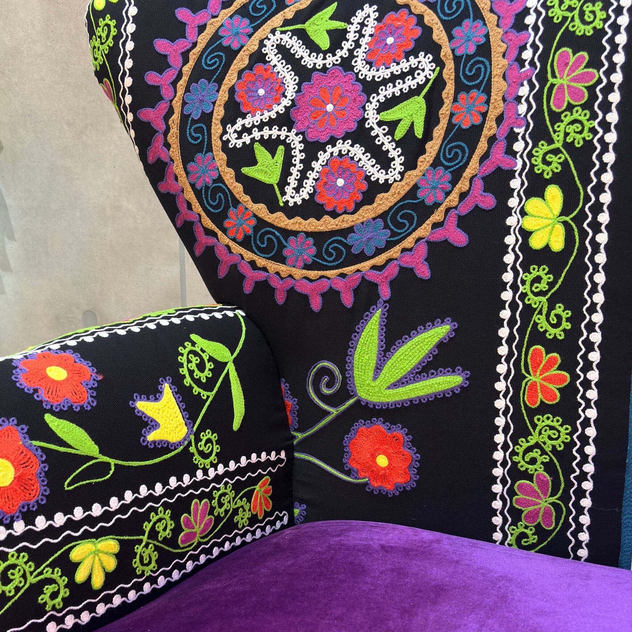 【新品】個性派アームチェア ブラック系 エキゾチック| 一人掛け 1Pソファ ラウンジチェア | ベルベット調×刺繍ファブリック | 民族調デザイン |