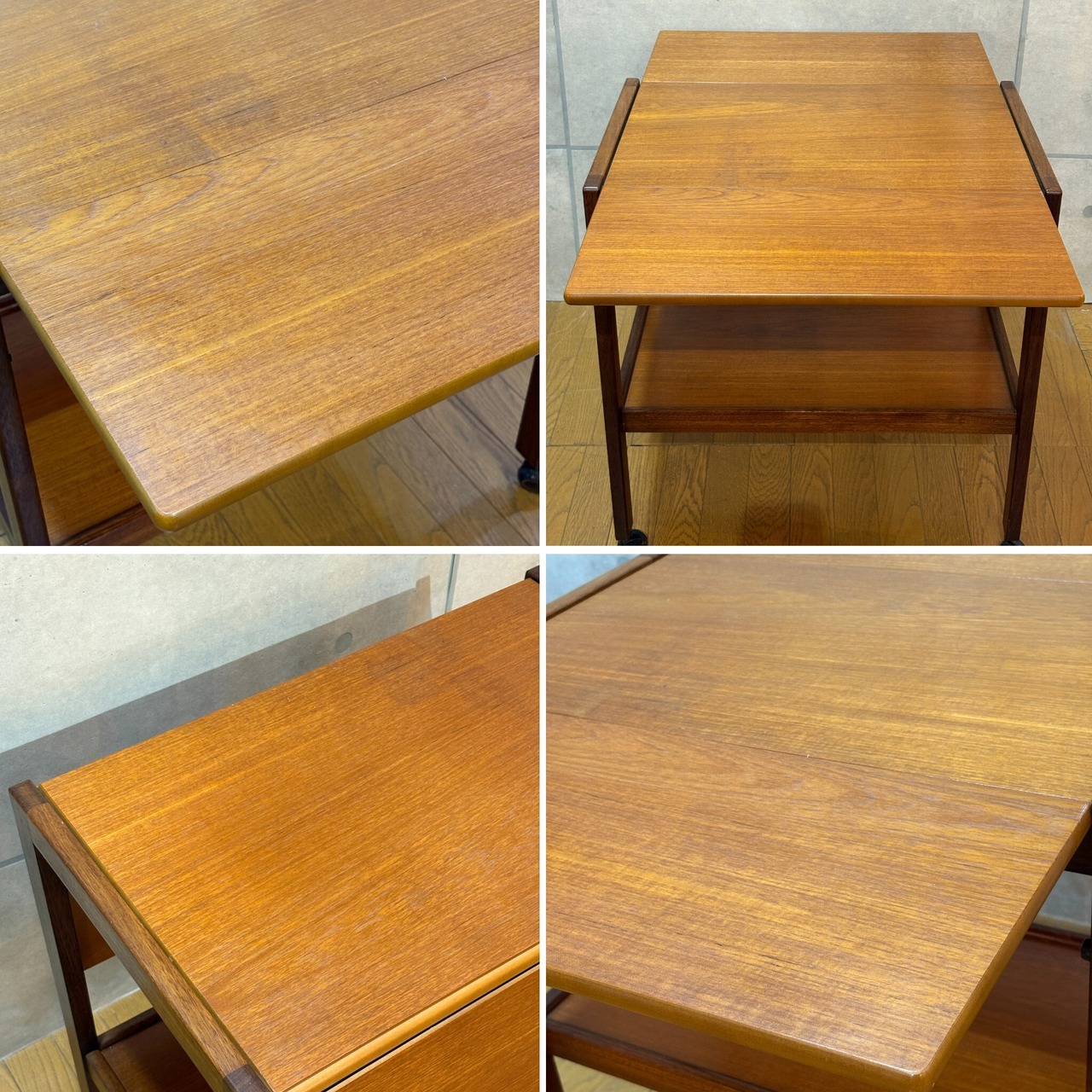 特徴: 英国製ヴィンテージ、希少なチーク材、伸長式天板、キャスター付き、ミッドセンチュリーデザイン