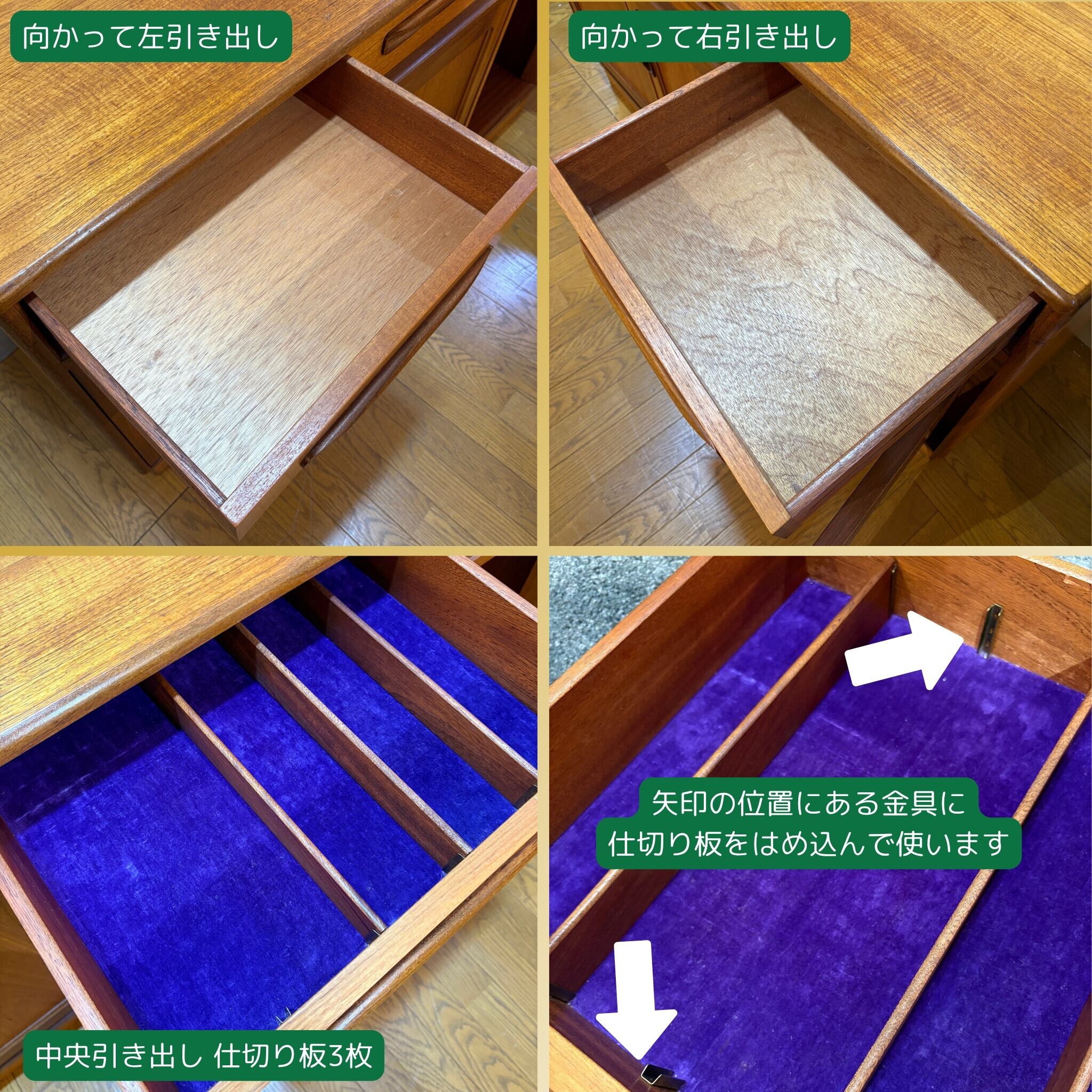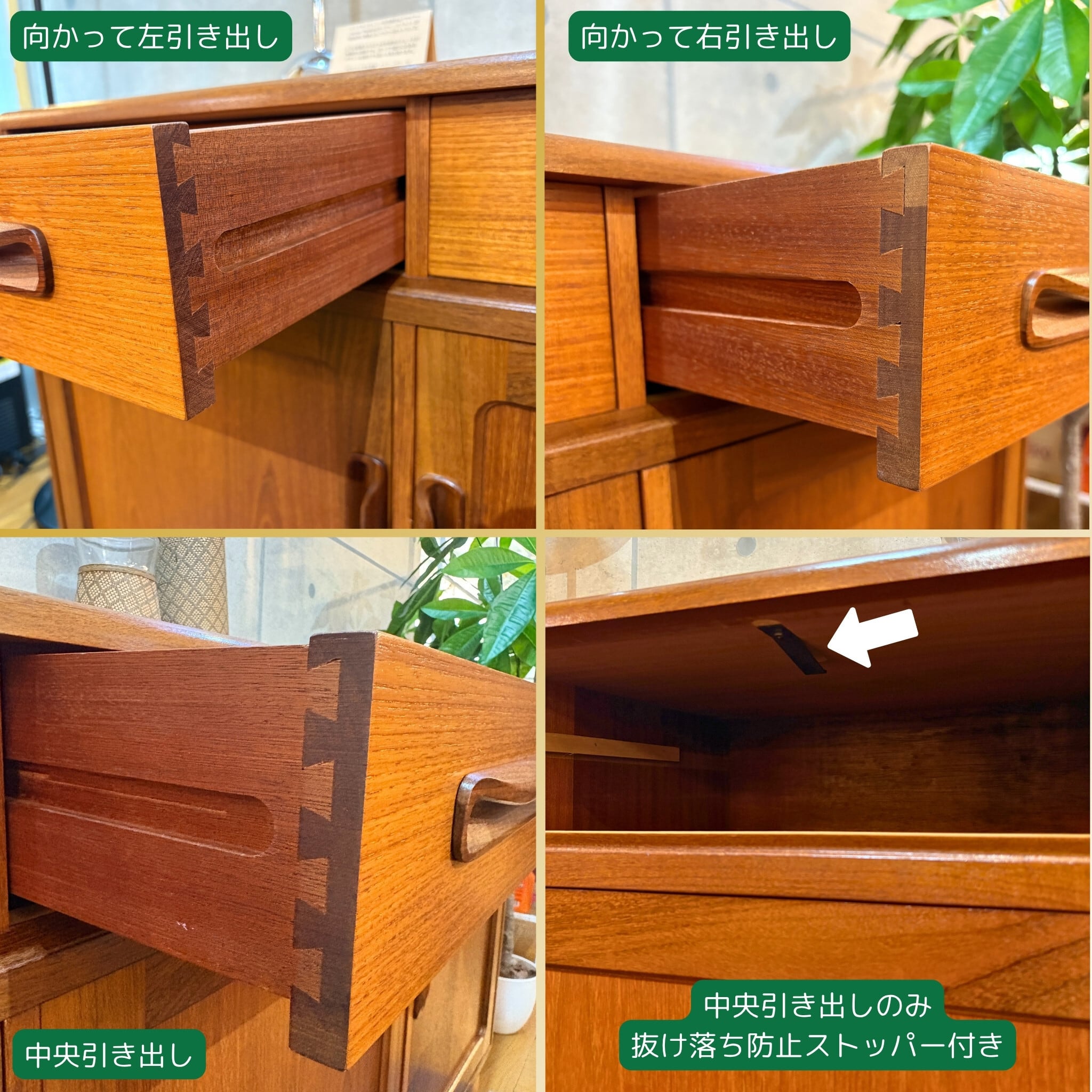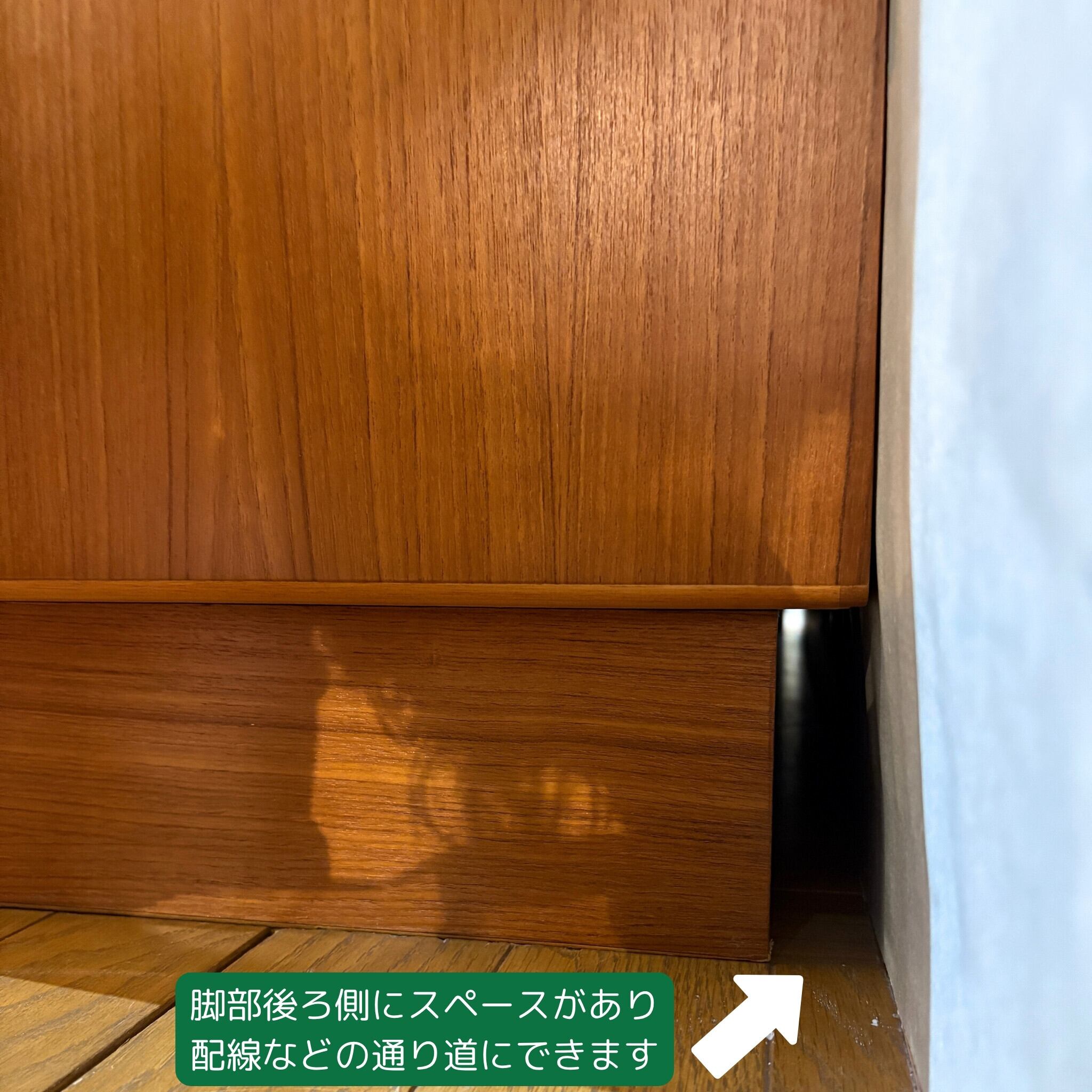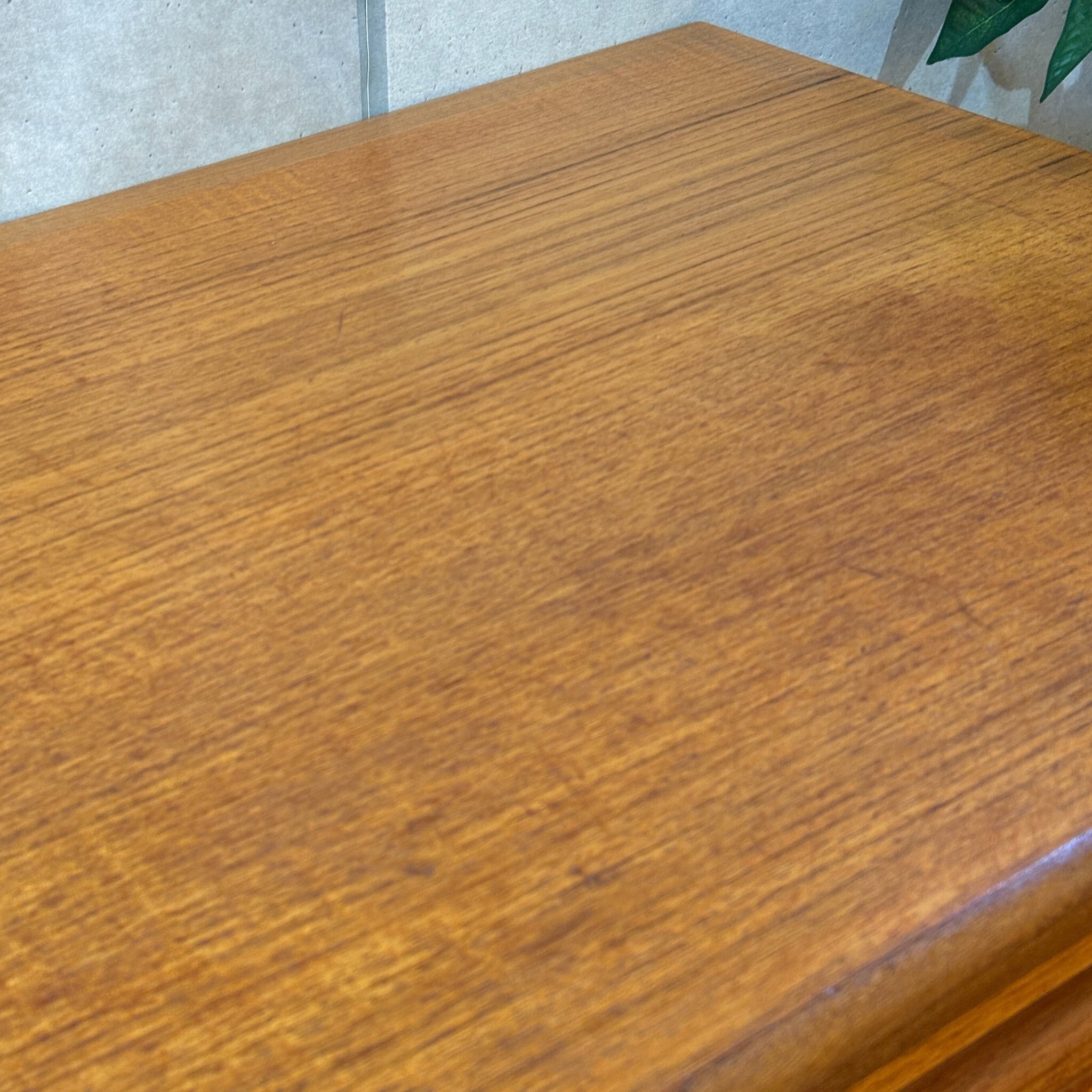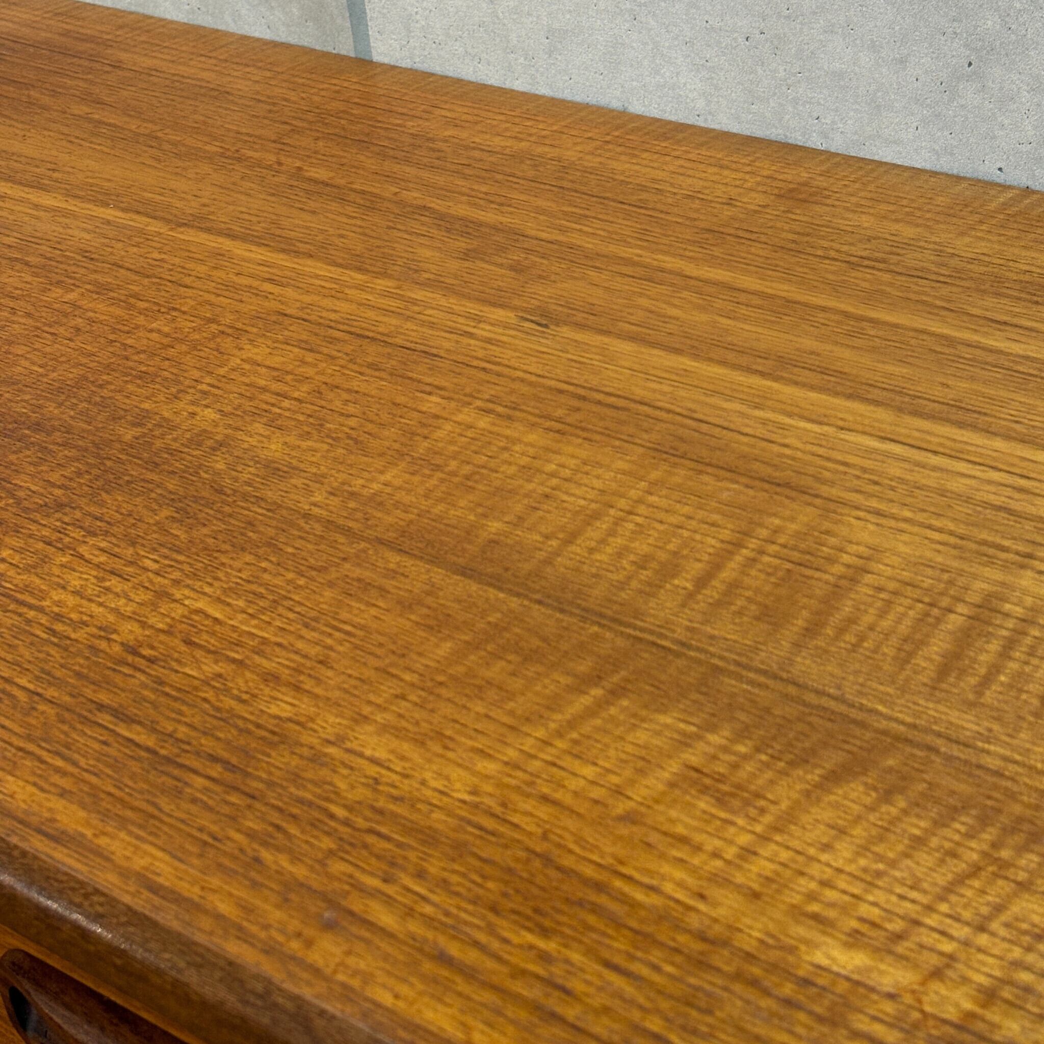 当時、高級家具の素材として多用された希少なチーク材が使用されています。時を経るごとに深みを増した飴色の木肌はヴィンテージならではの温かい雰囲気を醸し出し、見る角度によって様々な表情を楽しませてくれます。