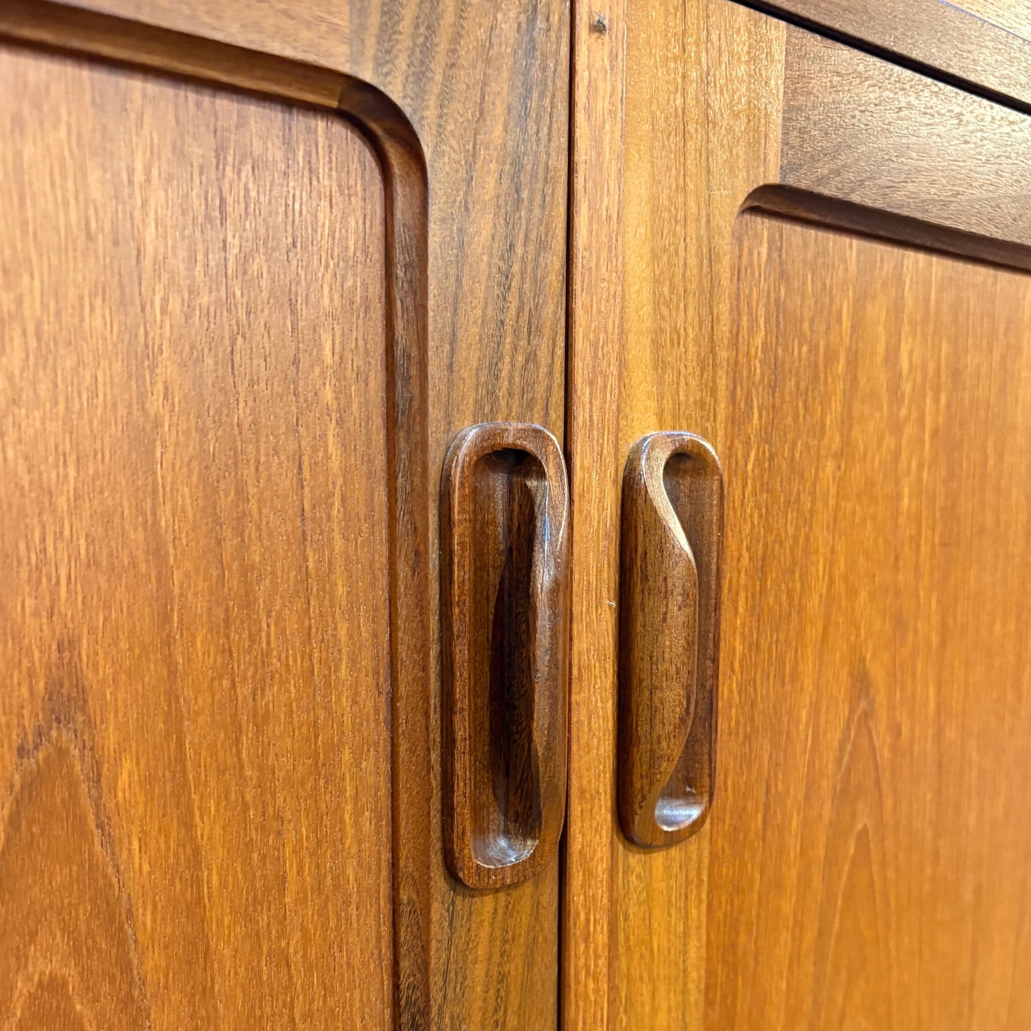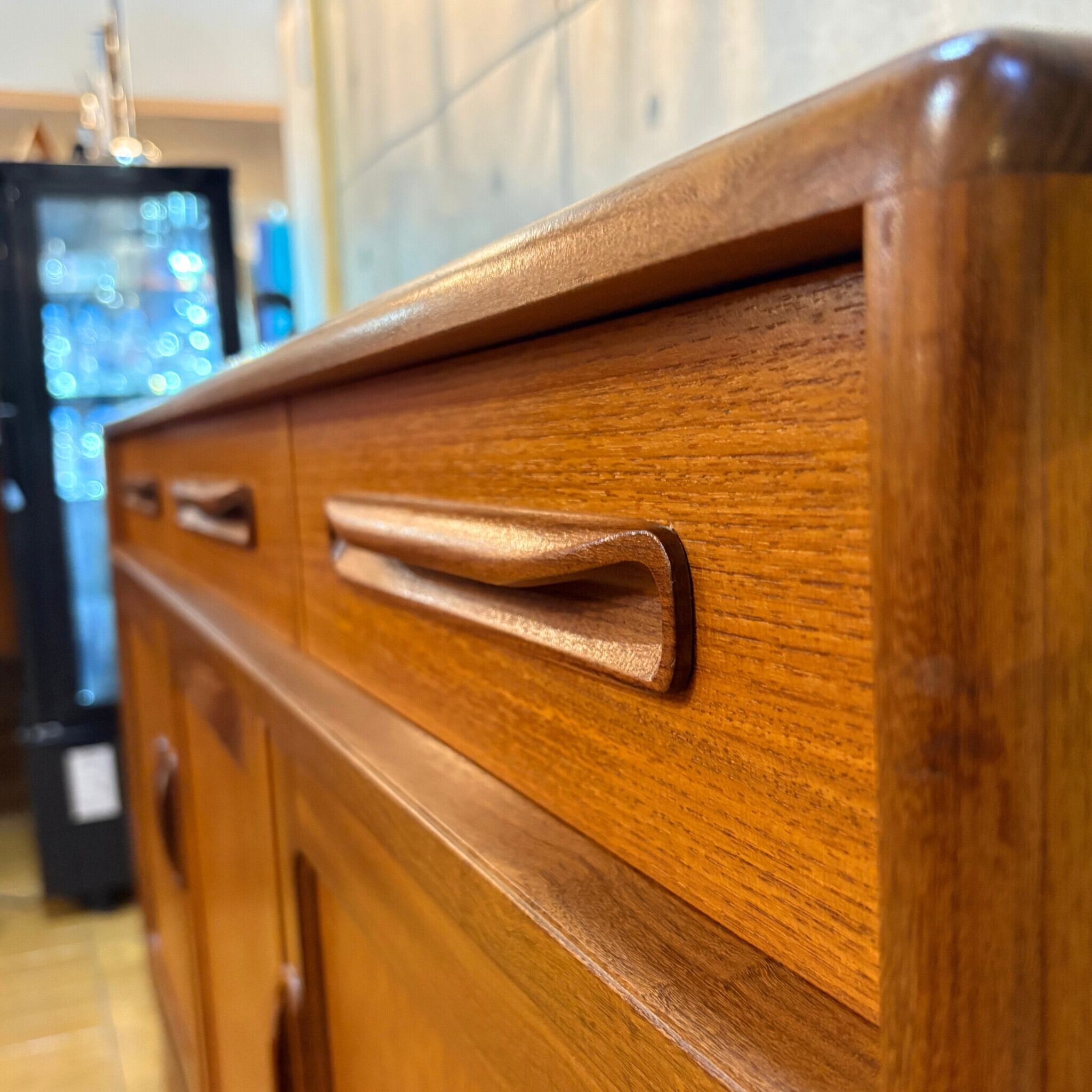 特徴: G-PLAN Frescoシリーズ、チーク材、彫刻的な取っ手、UKミッドセンチュリー