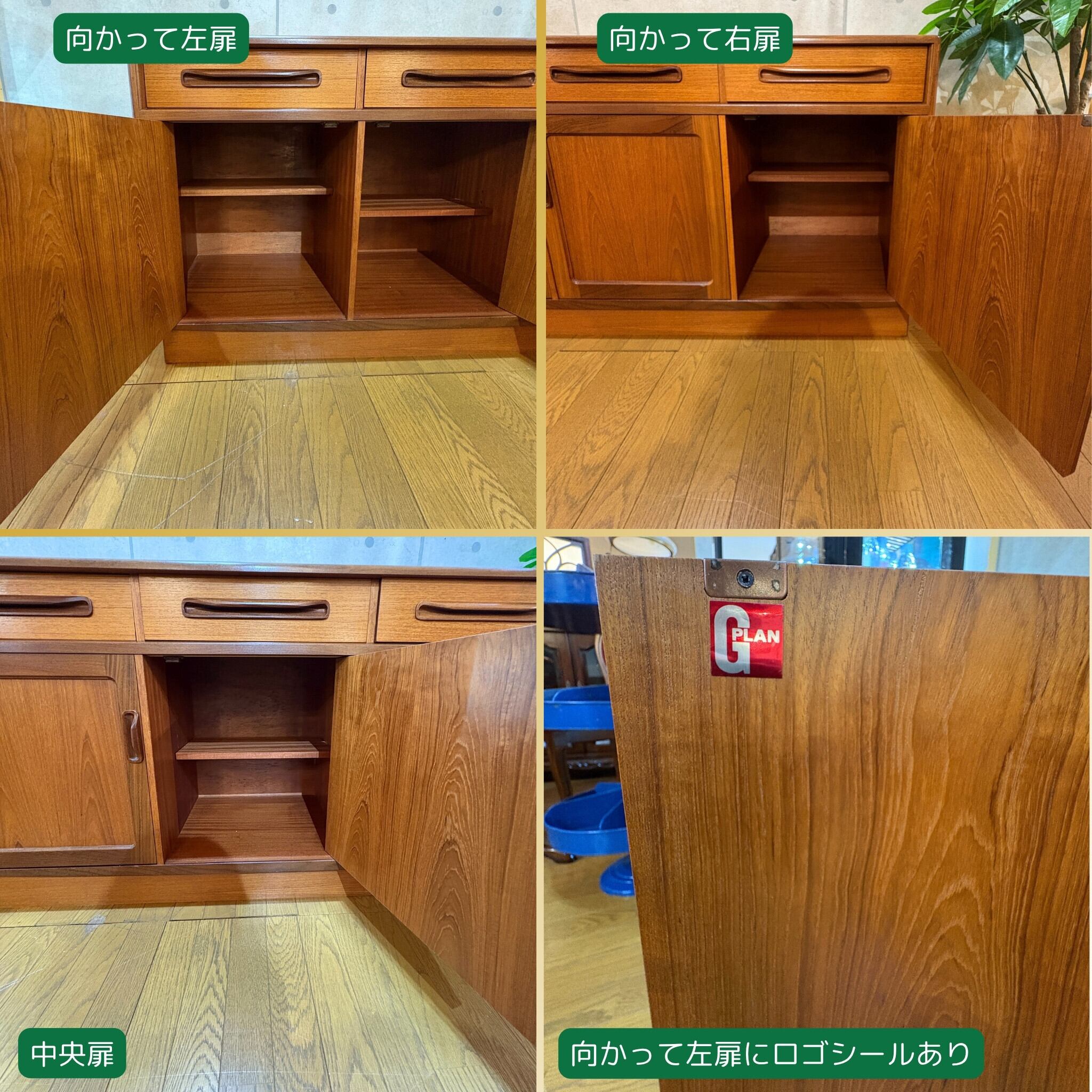 こちらの個体は裏面に当時の情報を知る希少なシールが残っており、1976年6月18日に製造された後期モデルであることを示しています。扉内側には同年代のG-PLANロゴシールもあり、半世紀以上の時を経てきた歴史を感じさせます。