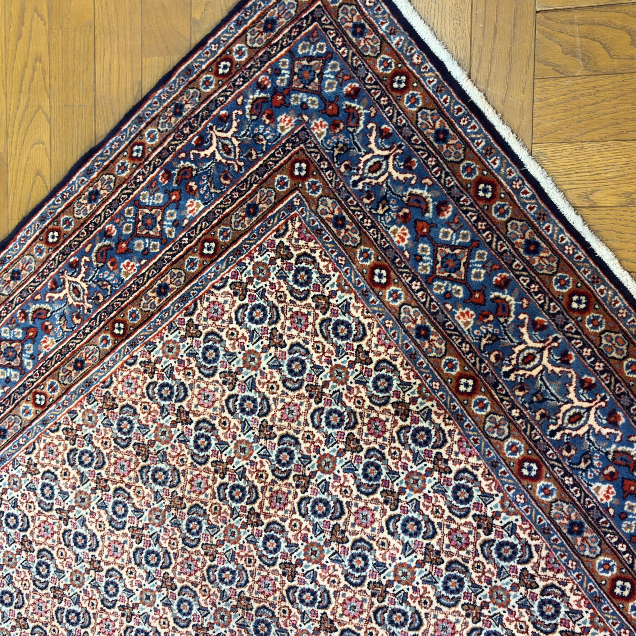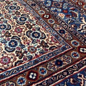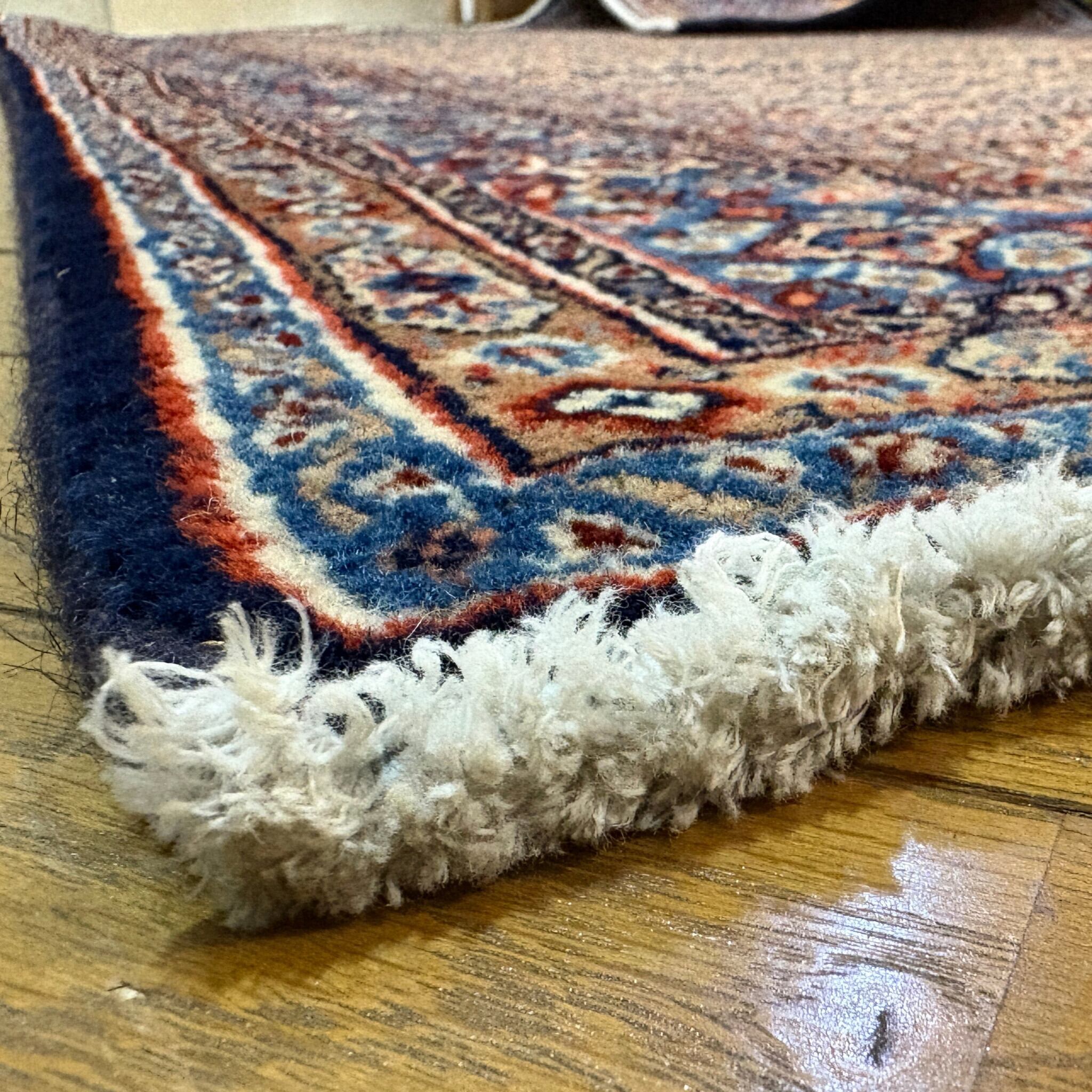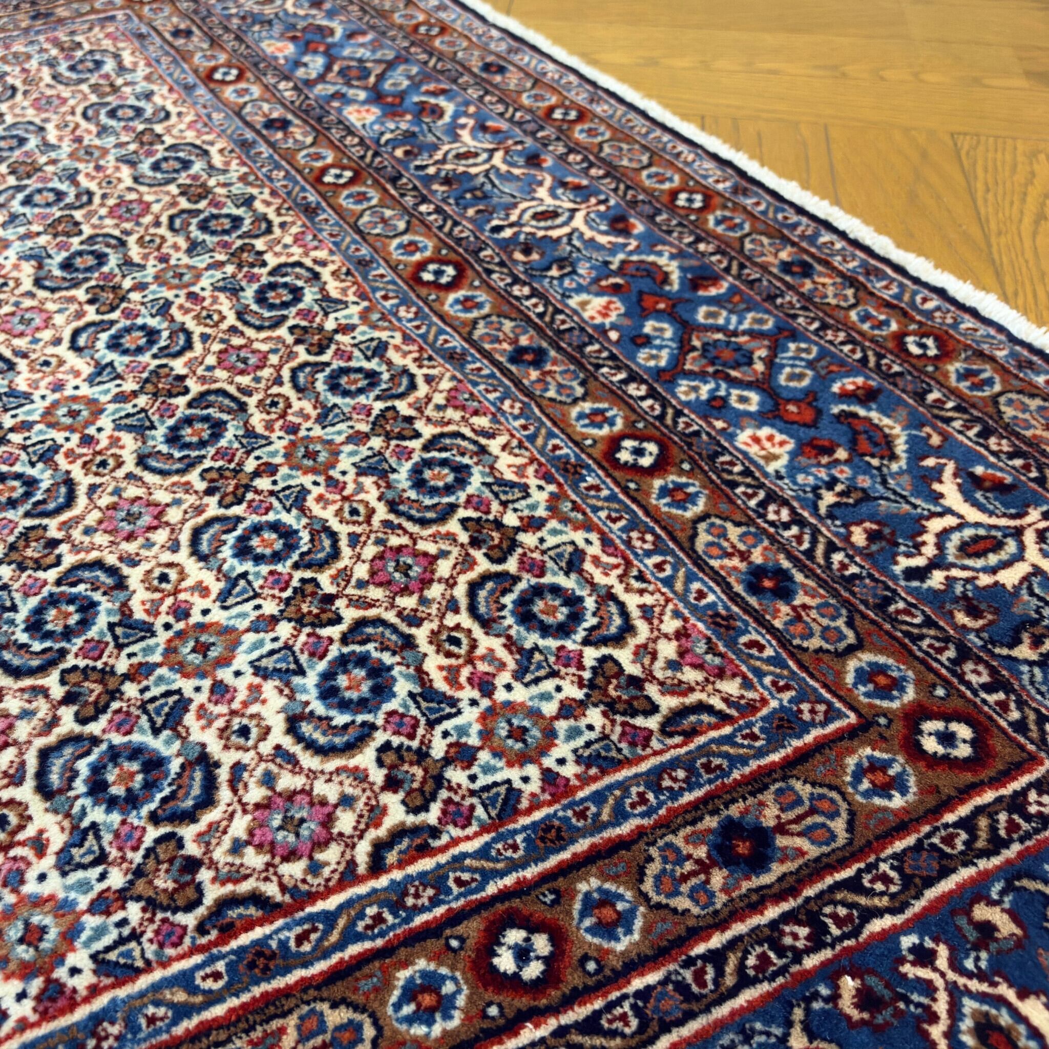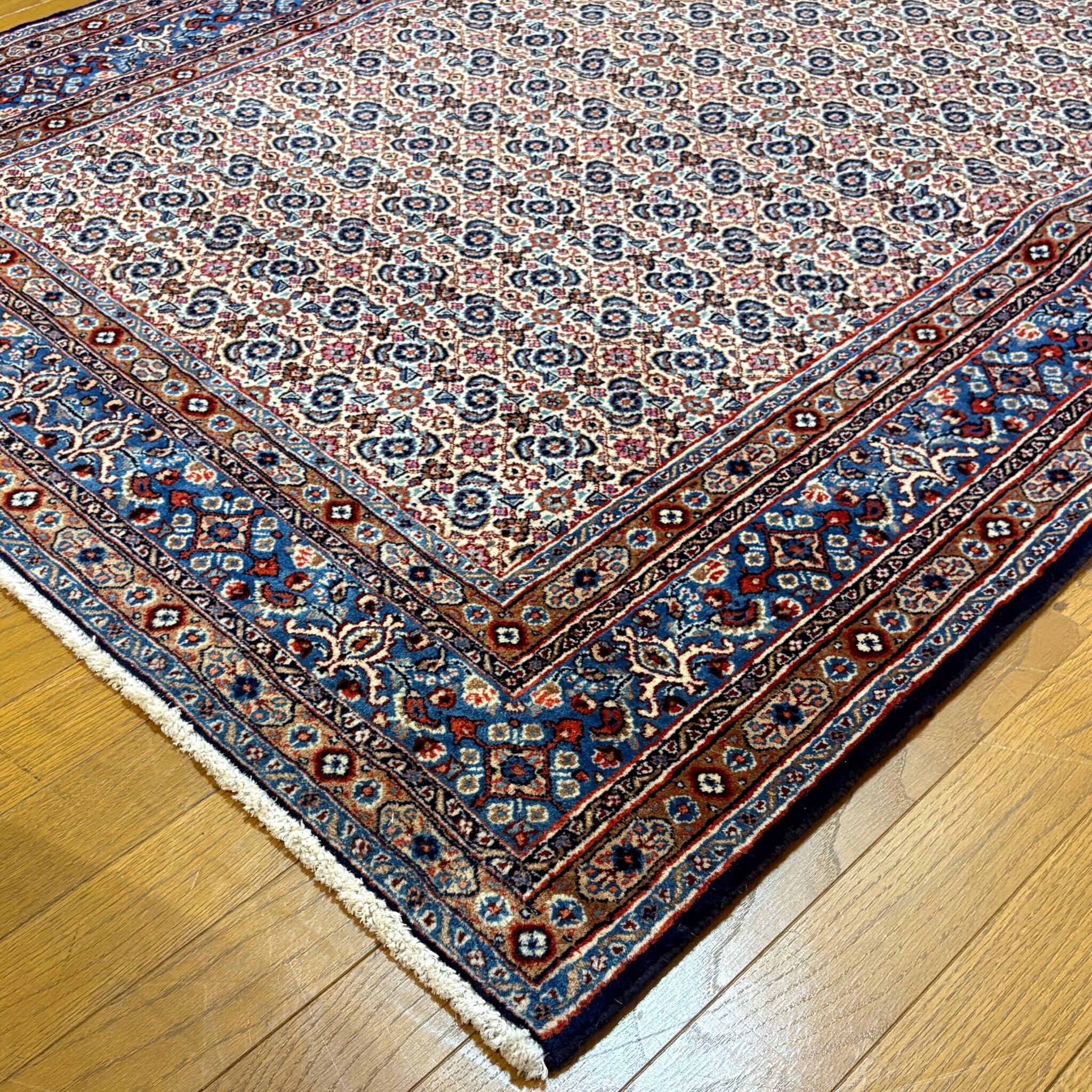 熟練した職人が一つひとつ手作業で織り上げた温かみのある手触りが魅力です。機械織りにはない手仕事ならではのわずかな不揃いさや、深みのある色合いはこの絨毯が持つ唯一無二の個性です。