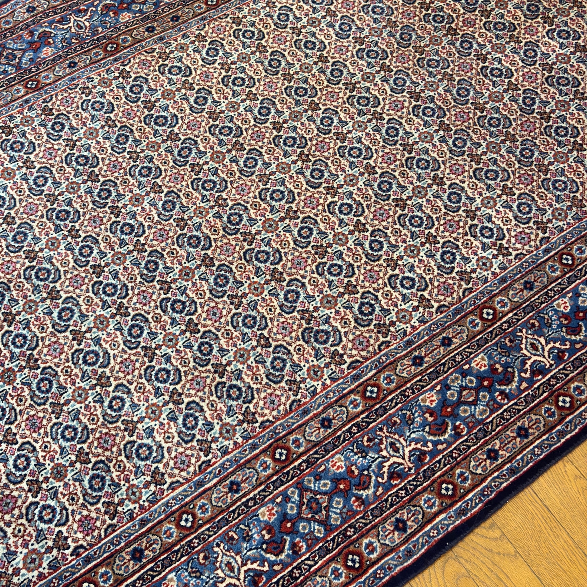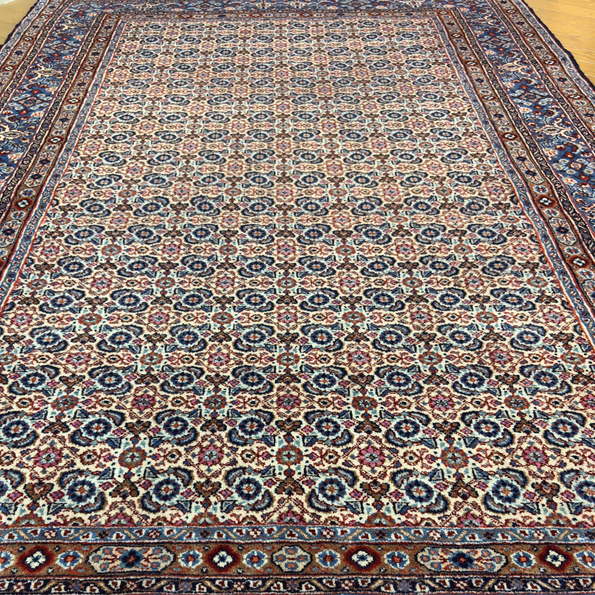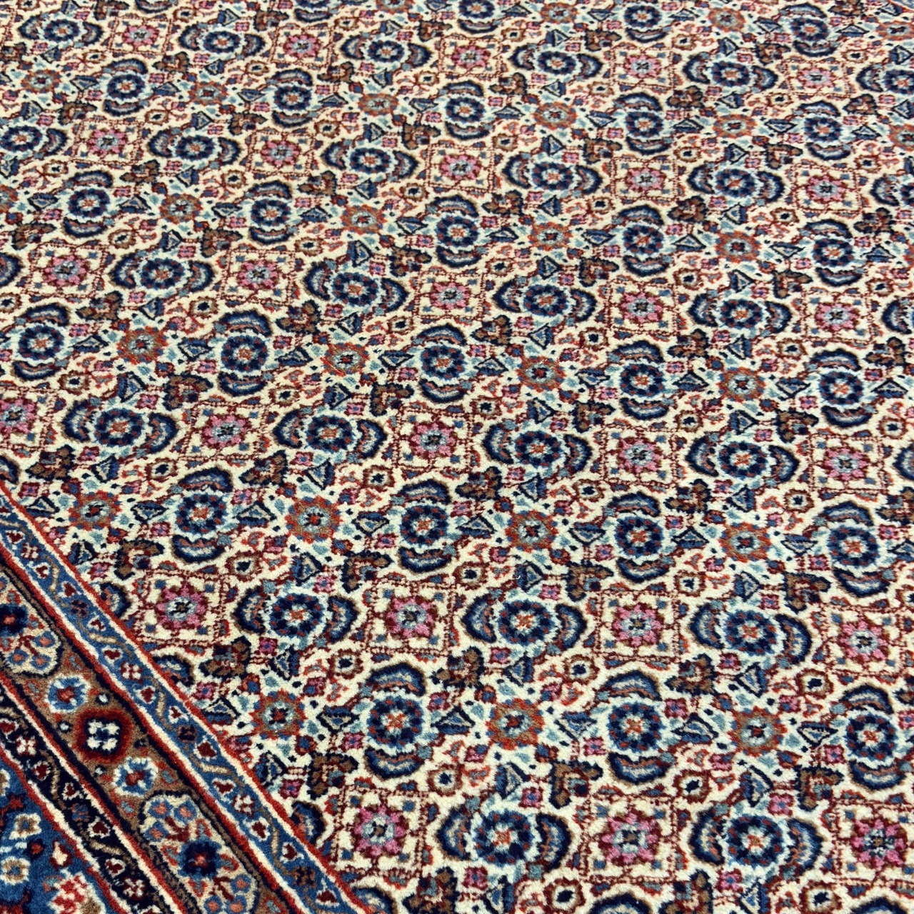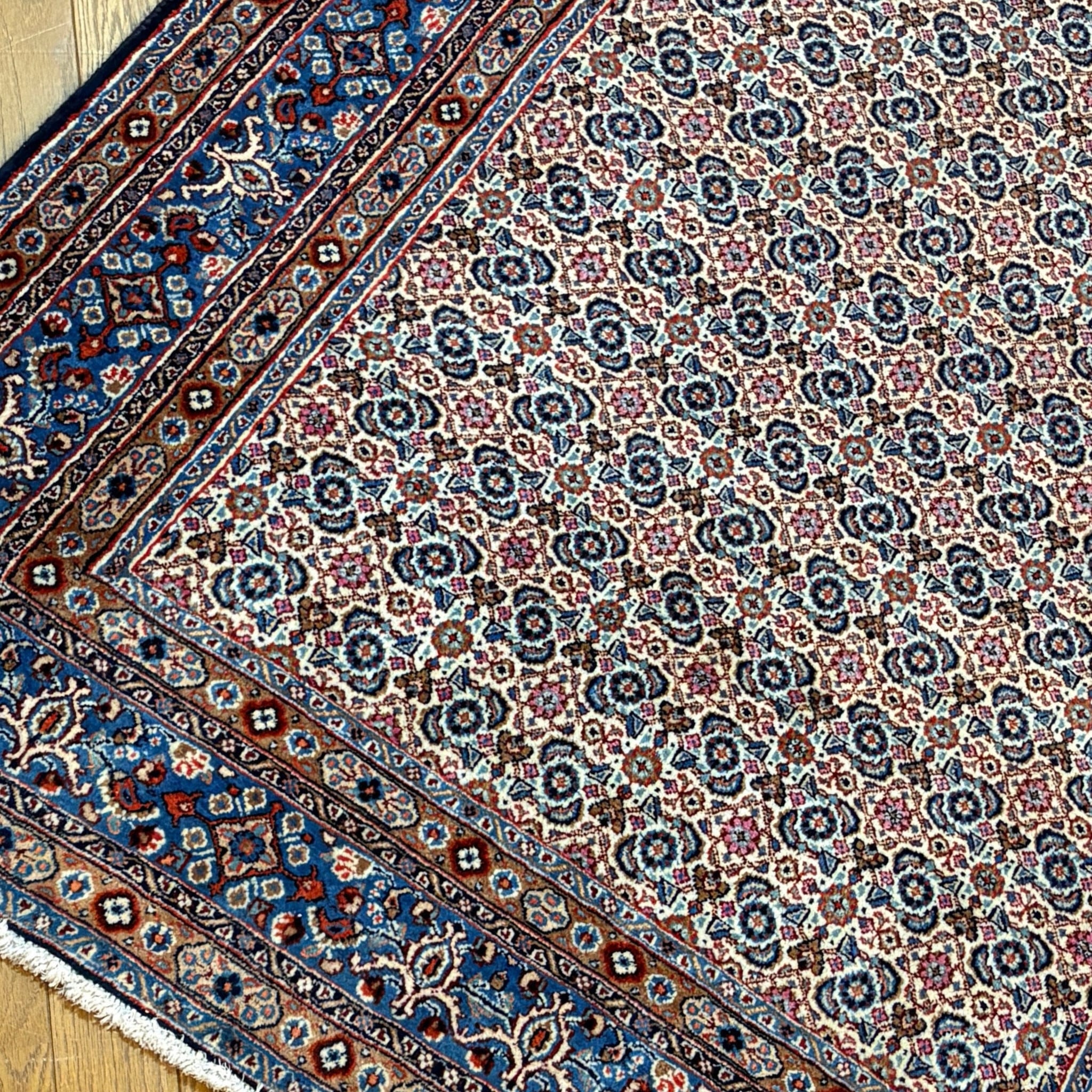 熟練した職人が一つひとつ手作業で織り上げた温かみのある手触りが魅力です。機械織りにはない手仕事ならではのわずかな不揃いさや、深みのある色合いはこの絨毯が持つ唯一無二の個性です。