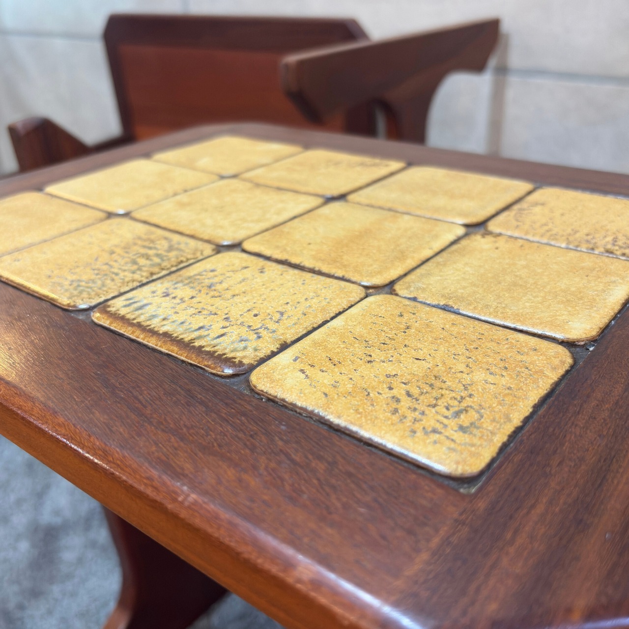 チーク材のフレームに落ち着いた色合いのタイルを埋め込んだ「タイルトップ」のデザインが特徴です。木材だけのテーブルと比べて素朴で温かみのある雰囲気を醸し出しています。