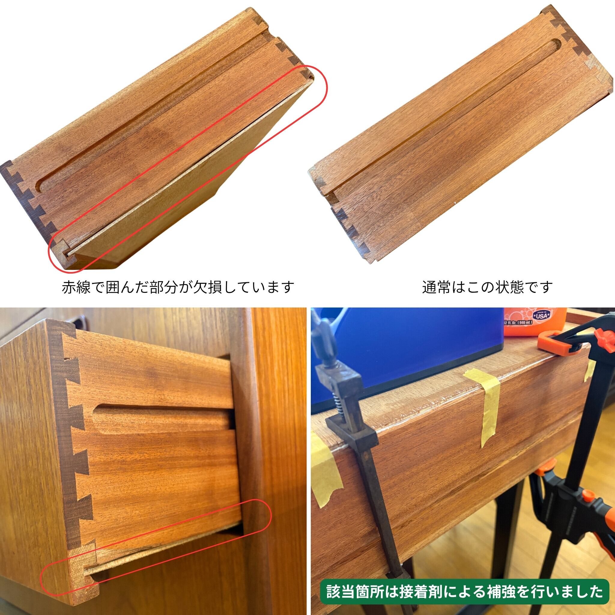 ・上から3段目の引き出し 向かって右側の側面に欠損部分があり、外観では分かりませんが引き出しの底板を上から押すと隙間ができてしまっていました。この部分は接着剤による補強を行う事で修復しています。画像をご参照ください。