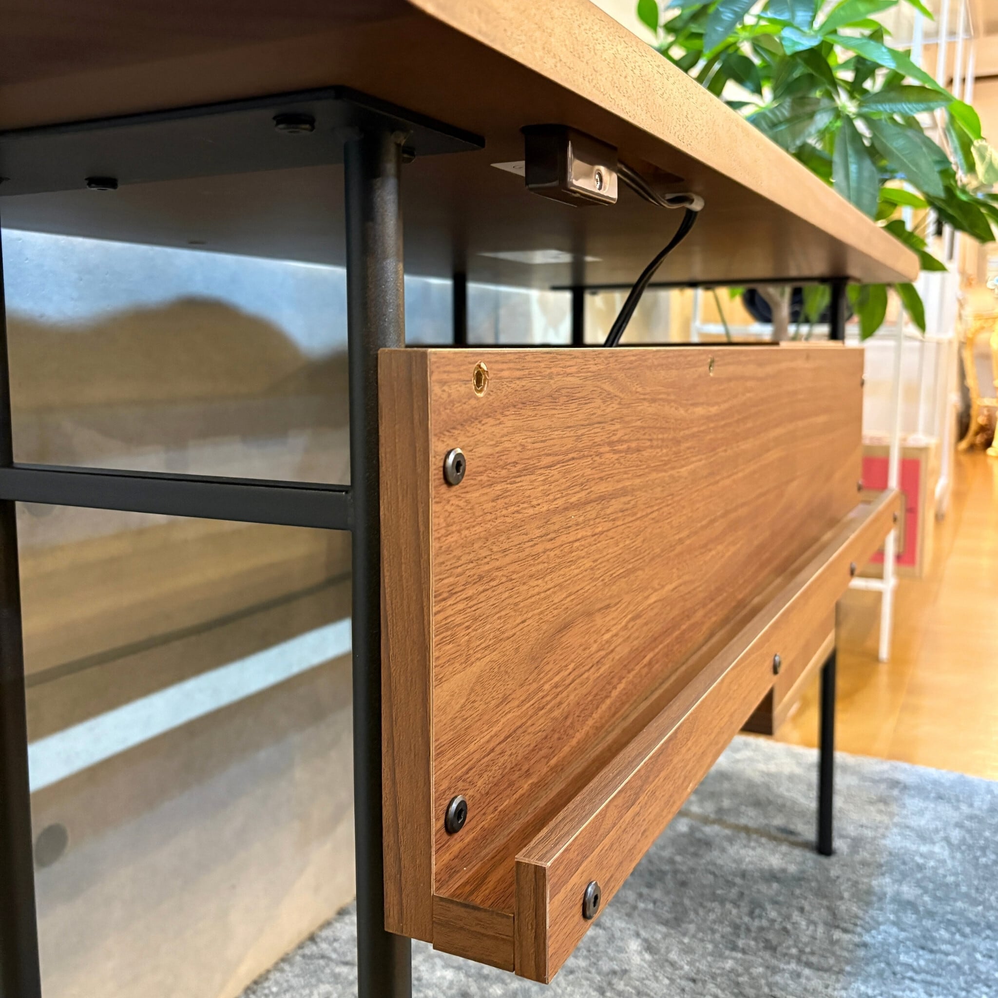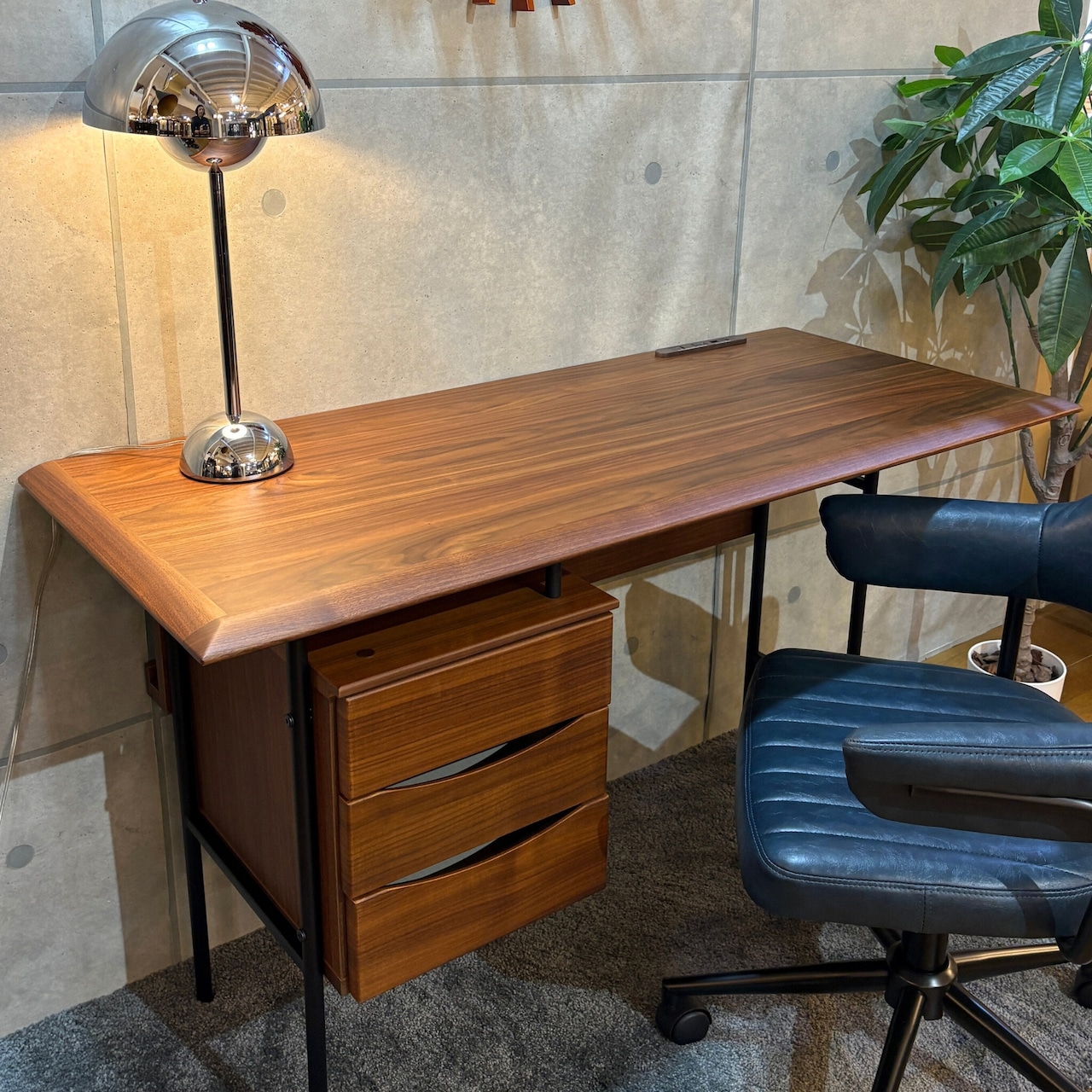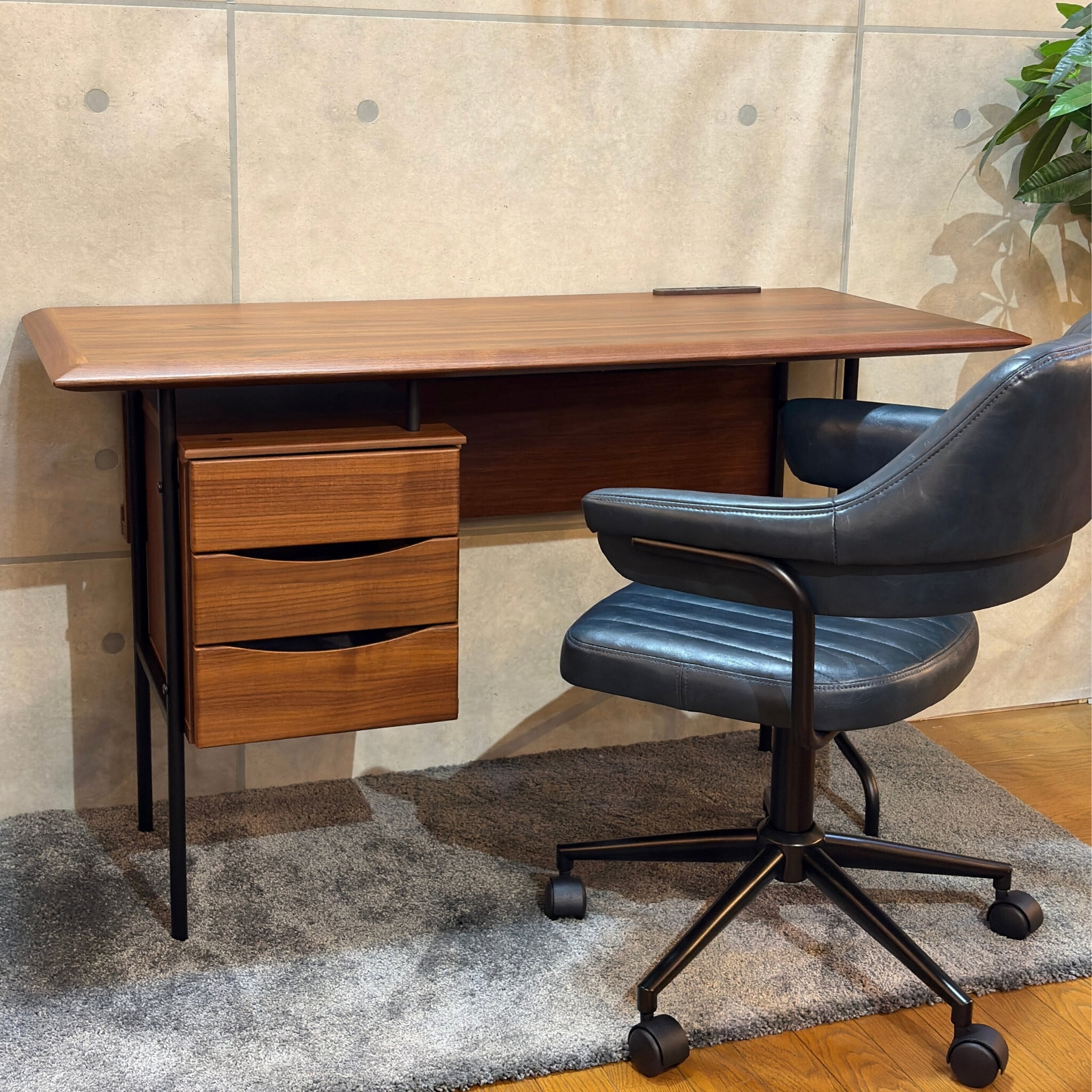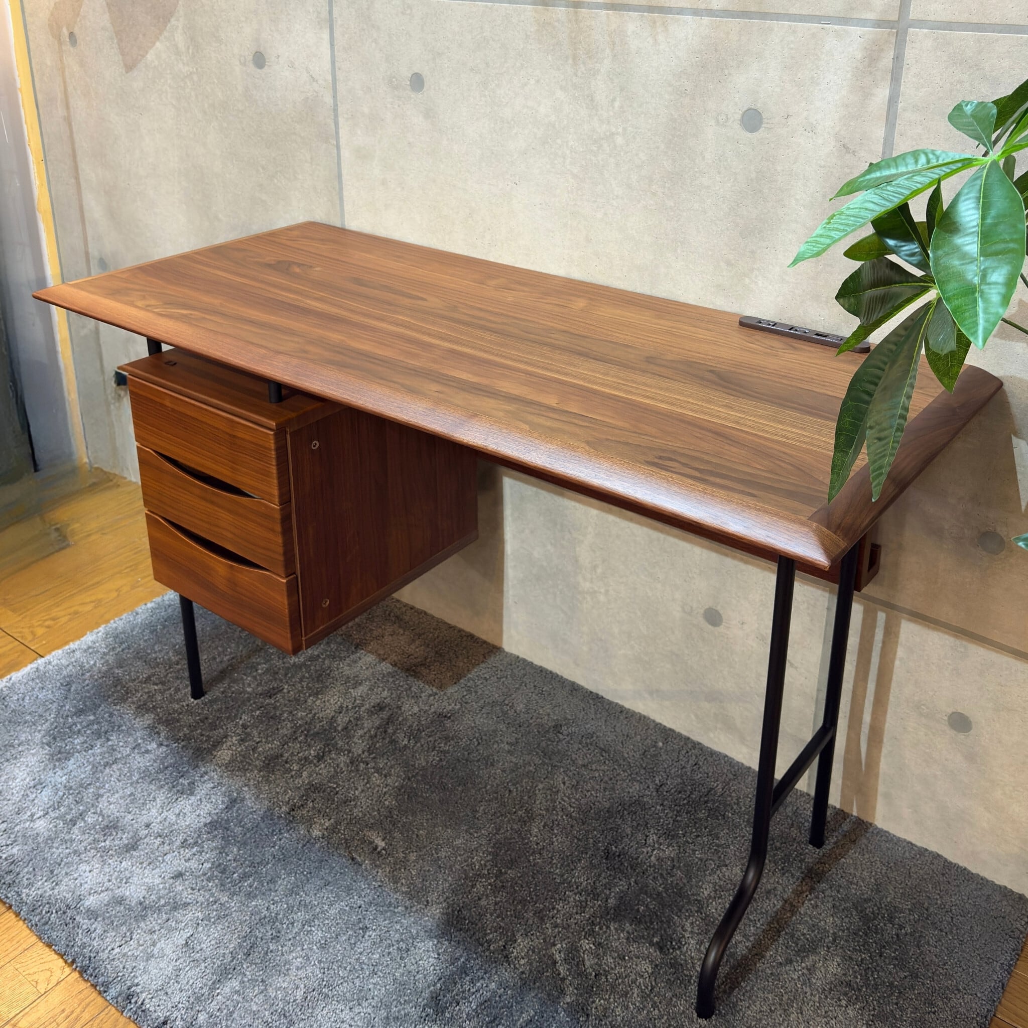 ウォールナット突板とブラックアイアンの組み合わせが美しいワークデスクです。ヴィンテージ家具やミッドセンチュリーデザインを彷彿とさせる洗練されたスタイルが魅力です。