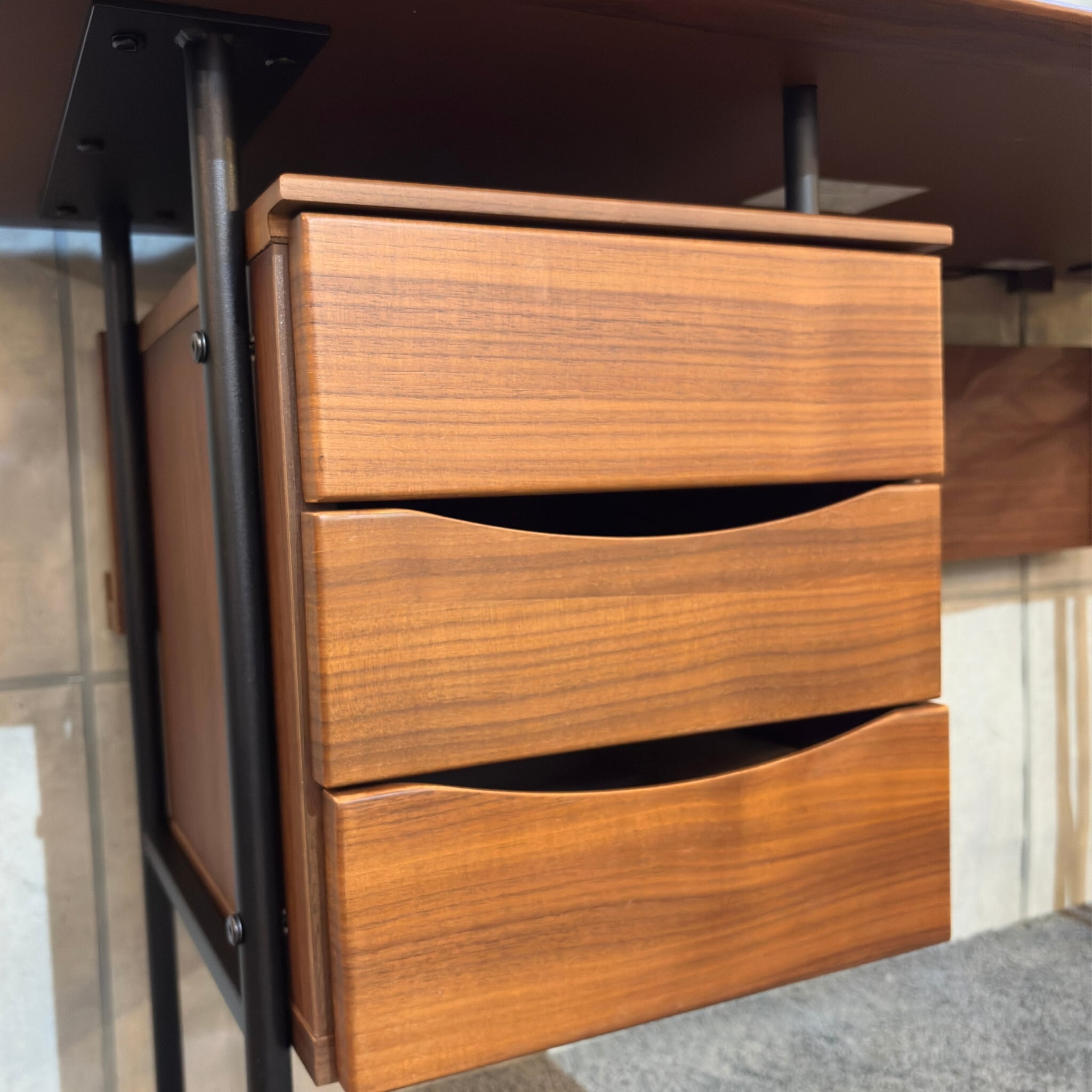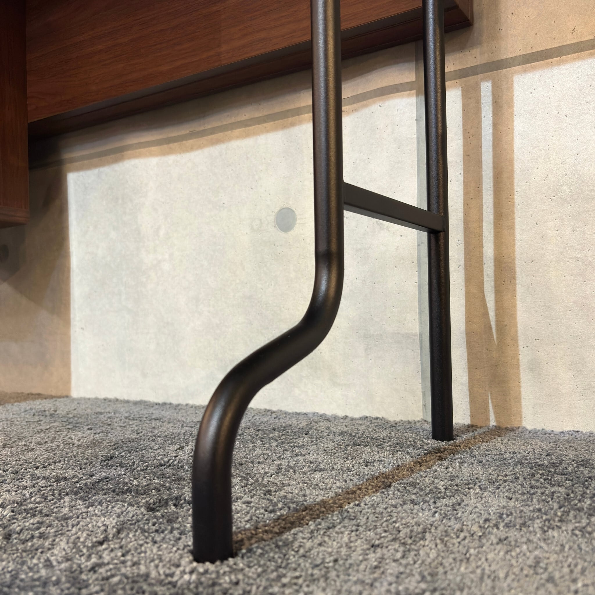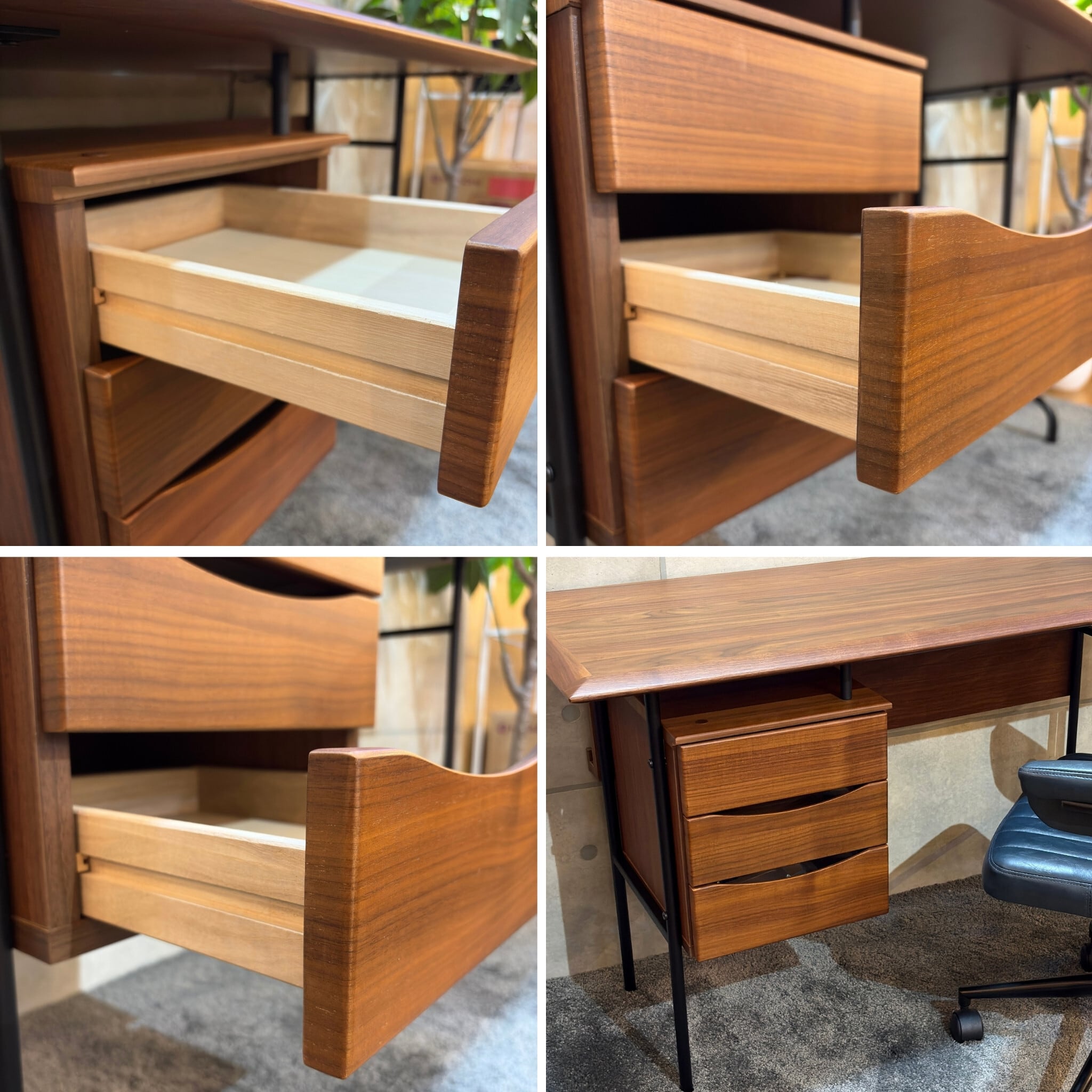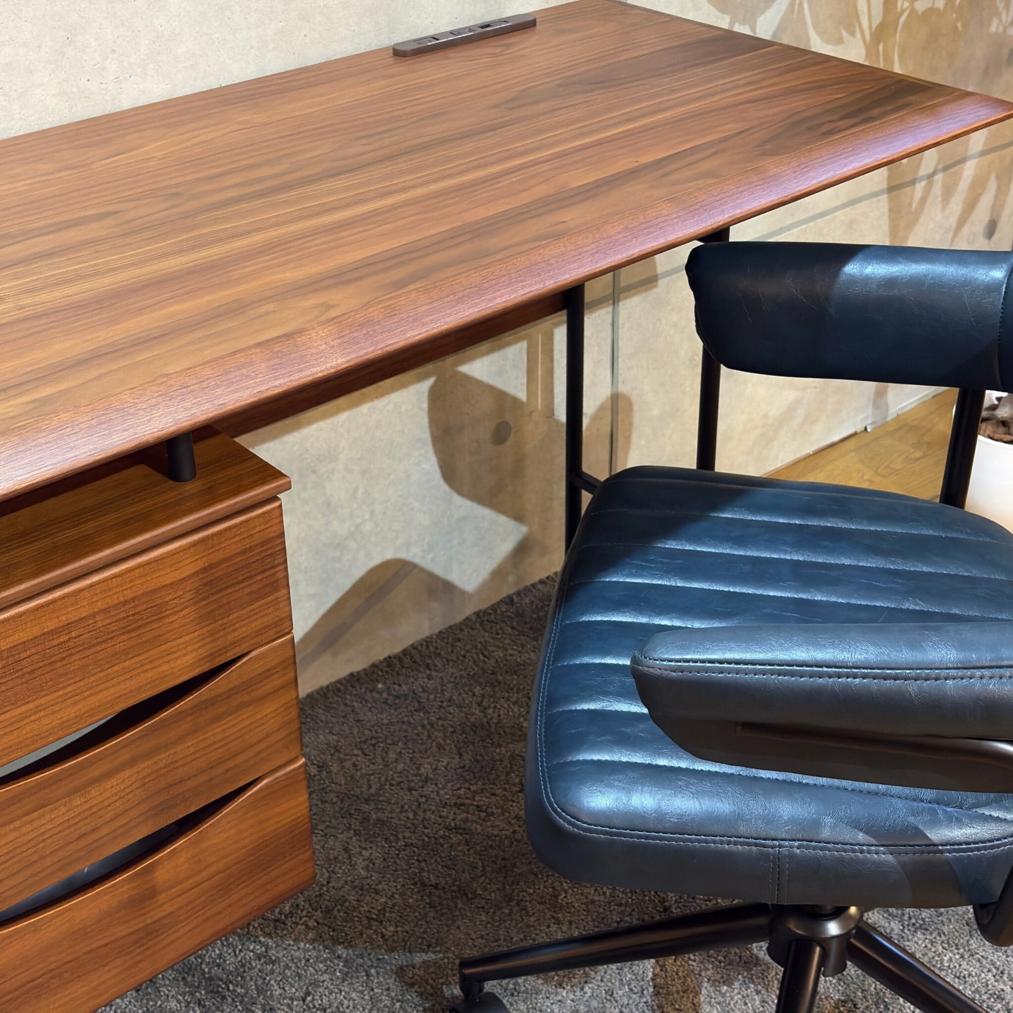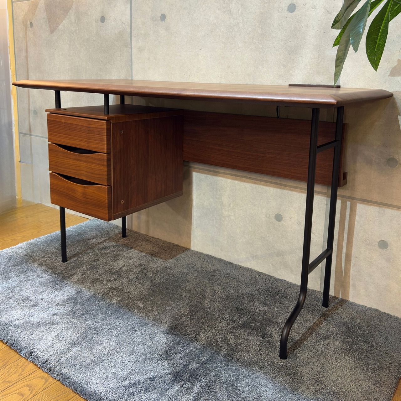 ウォールナット突板とブラックアイアンの組み合わせが美しいワークデスクです。ヴィンテージ家具やミッドセンチュリーデザインを彷彿とさせる洗練されたスタイルが魅力です。