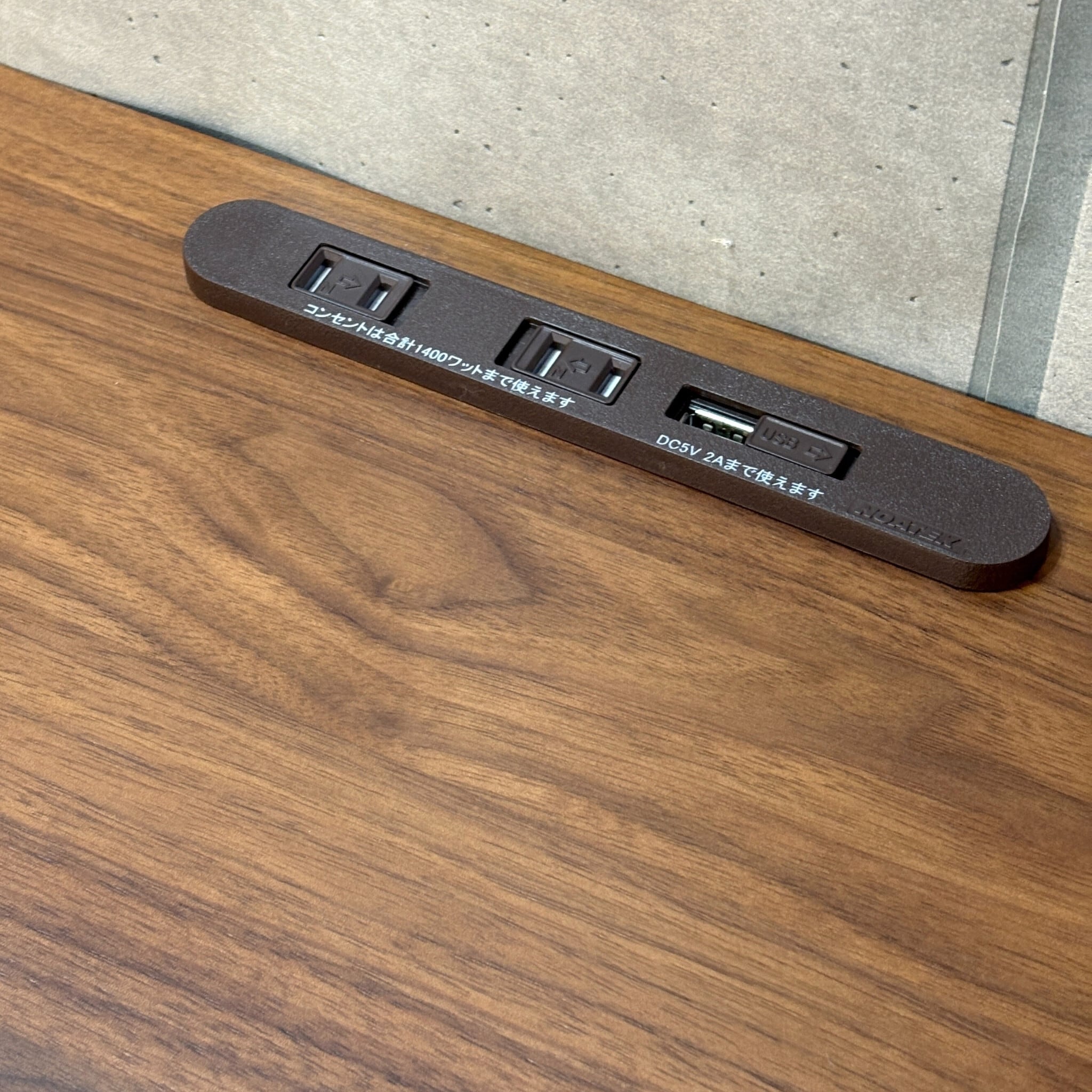 デザイン性だけでなく現代のニーズに応える機能性も兼ね備えています。デスク天板には便利な2個口コンセントとUSBポートを搭載。スマートフォンやPCの充電、デスクライトの使用もスムーズに行えます。配線は天板下にまとめて左右に逃がすことが出来ますので煩雑になりがちなコード類をすっきりと整理し、快適な作業空間を実現します。