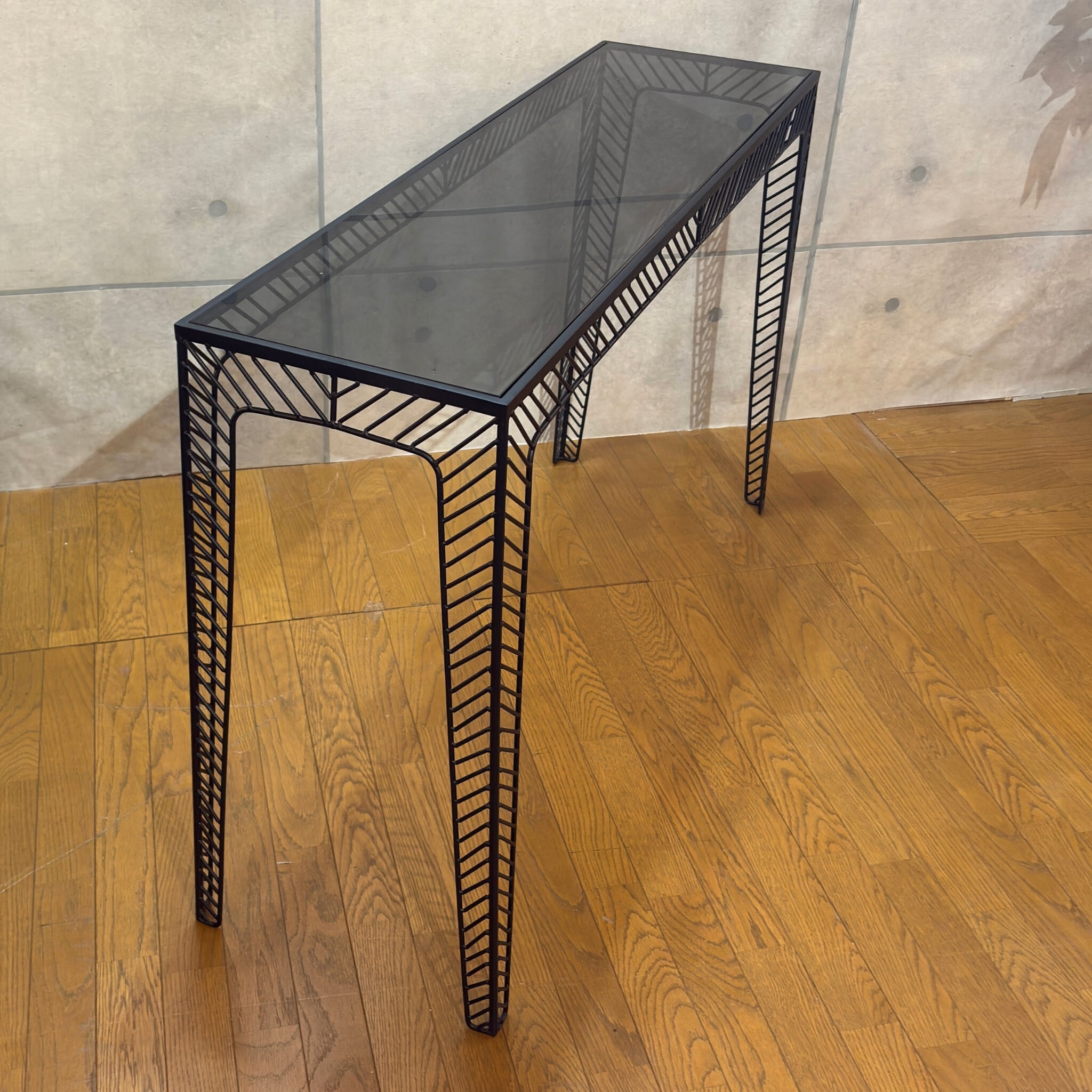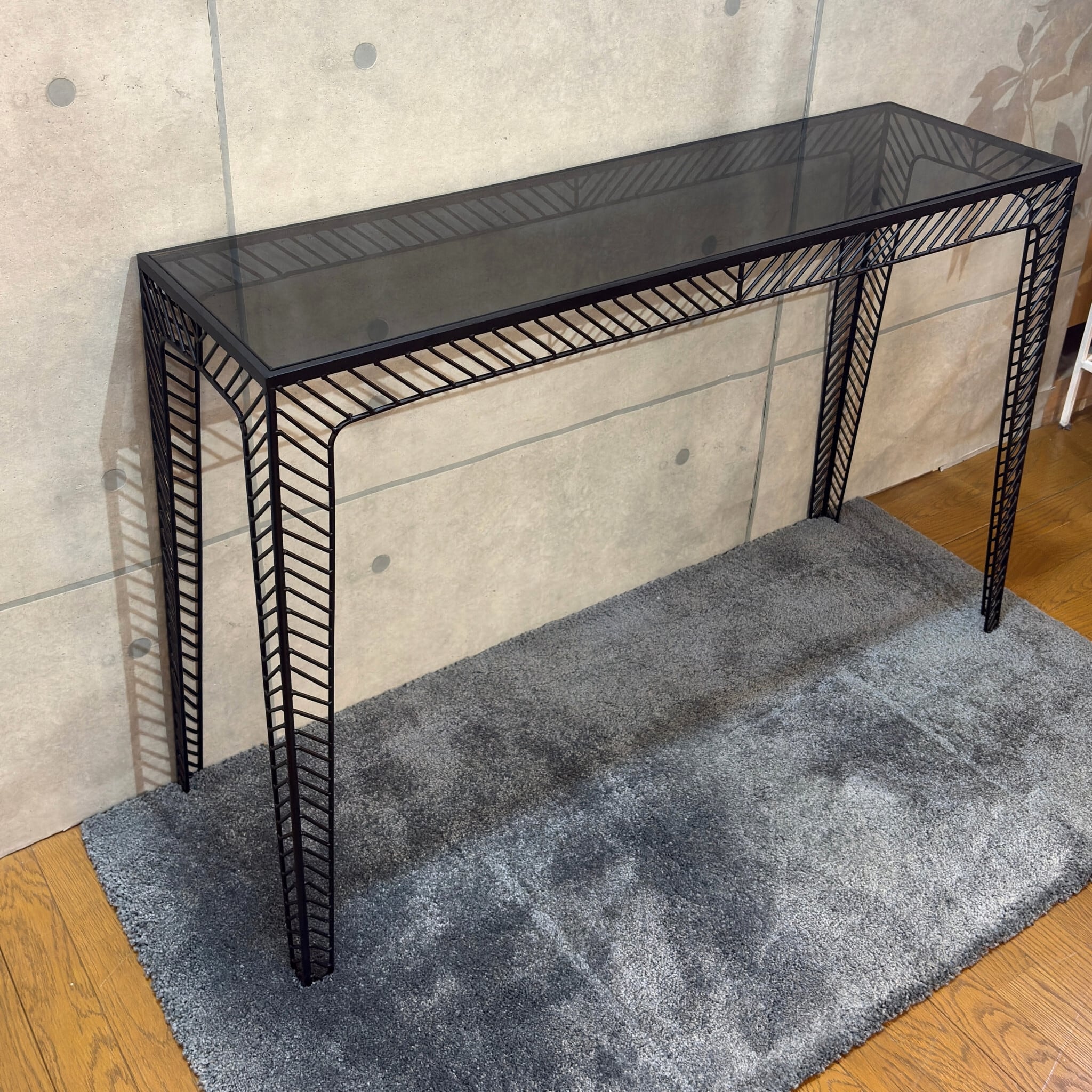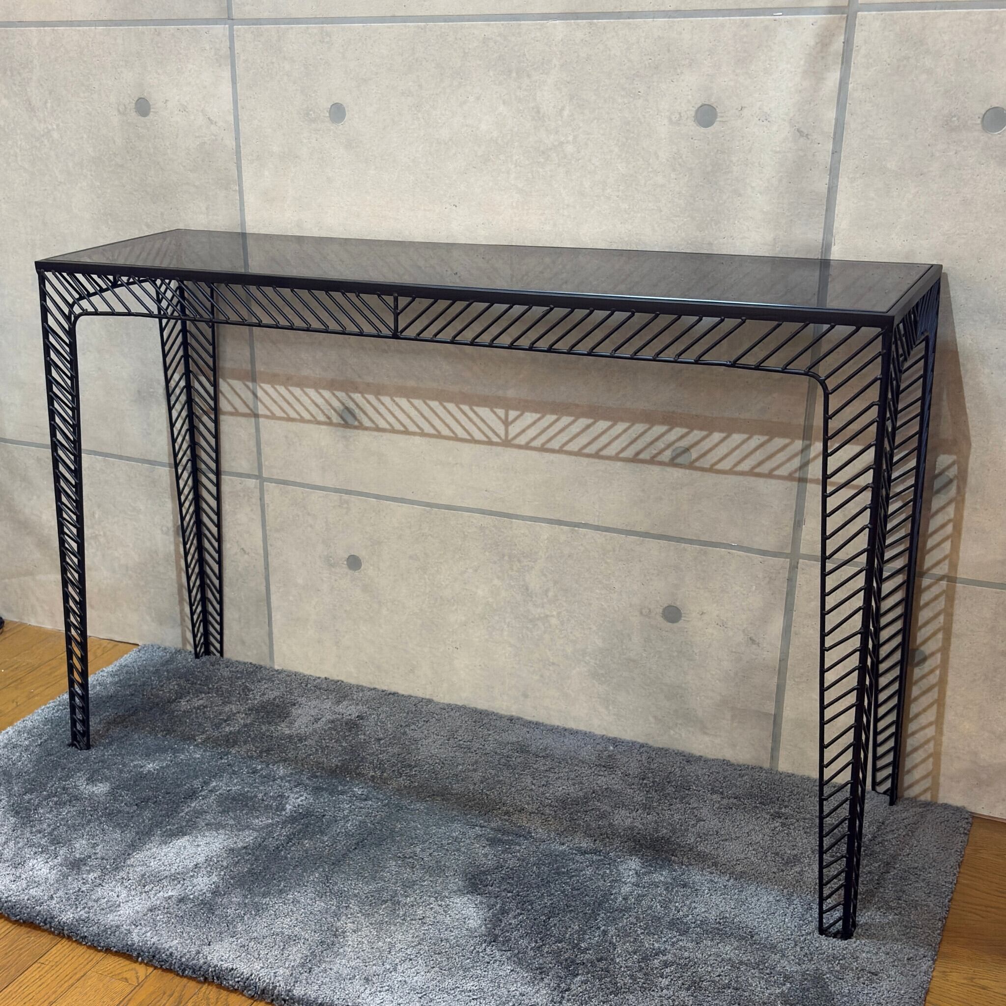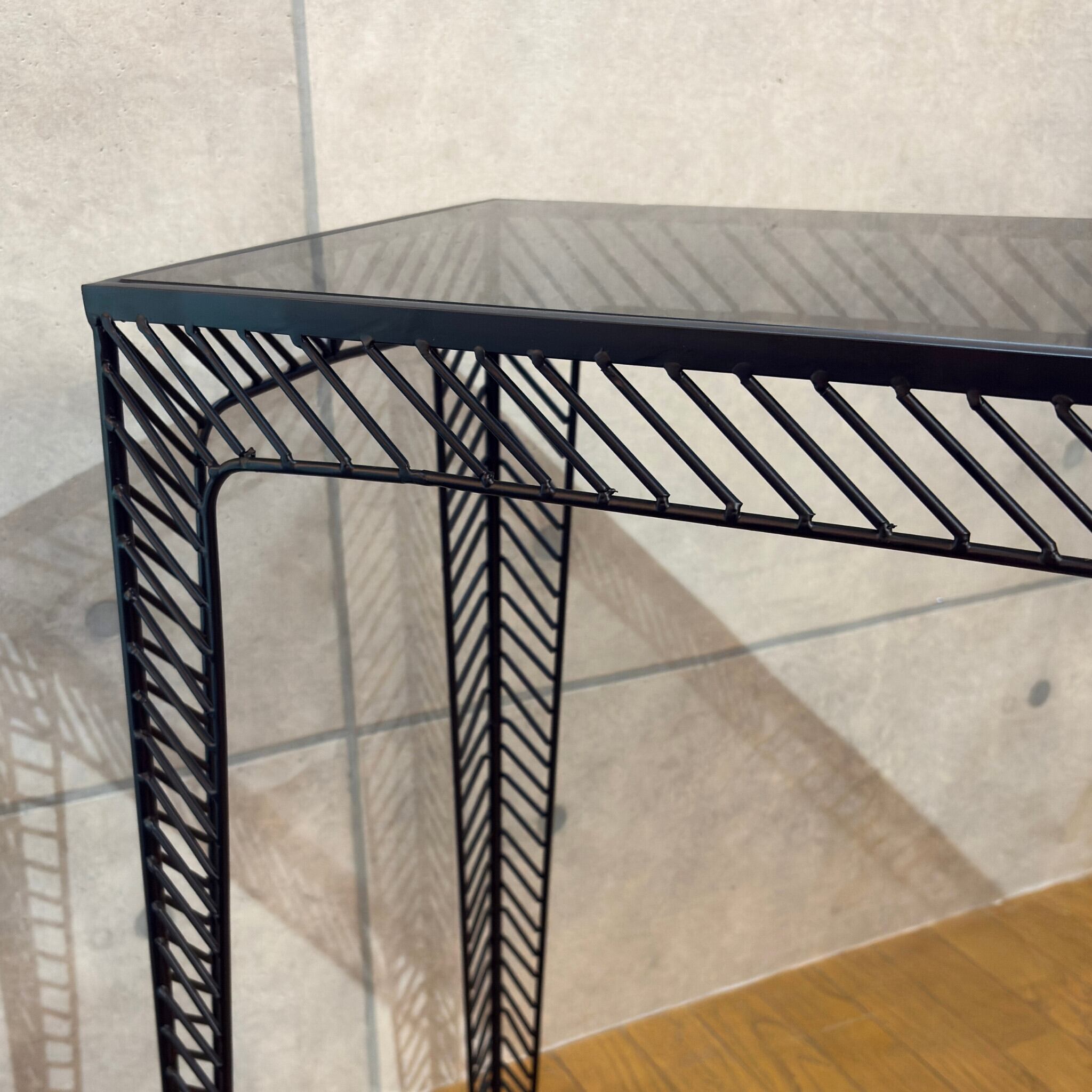 ミニマルなデザインの中に素材の質感が際立つコンソールテーブルです。シャープなブラックアイアンのフレームとスモークガラス天板の組み合わせが空間を洗練された印象へと導きます。ミッドセンチュリーモダンな佇まいは現代のインテリアスタイルにも調和します。