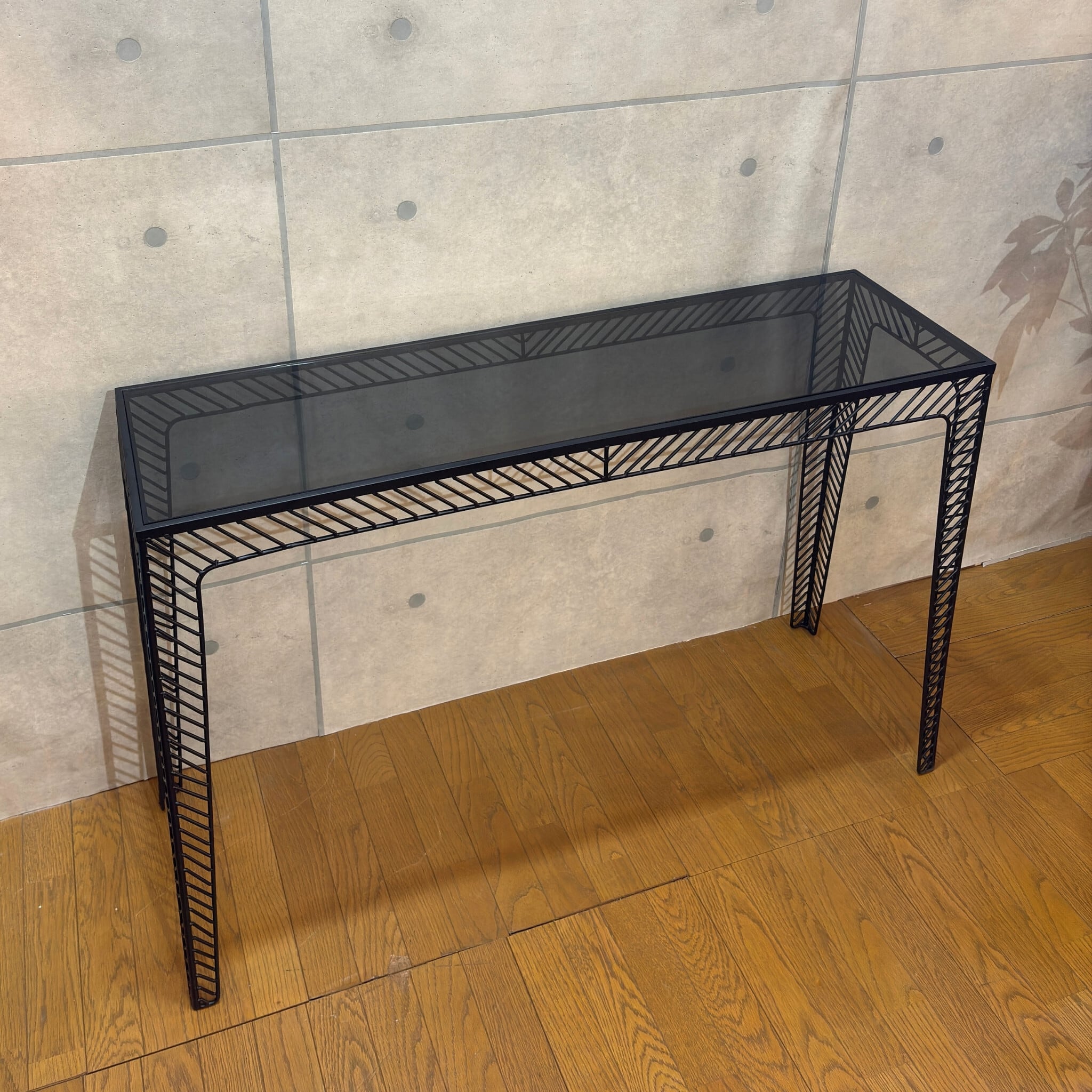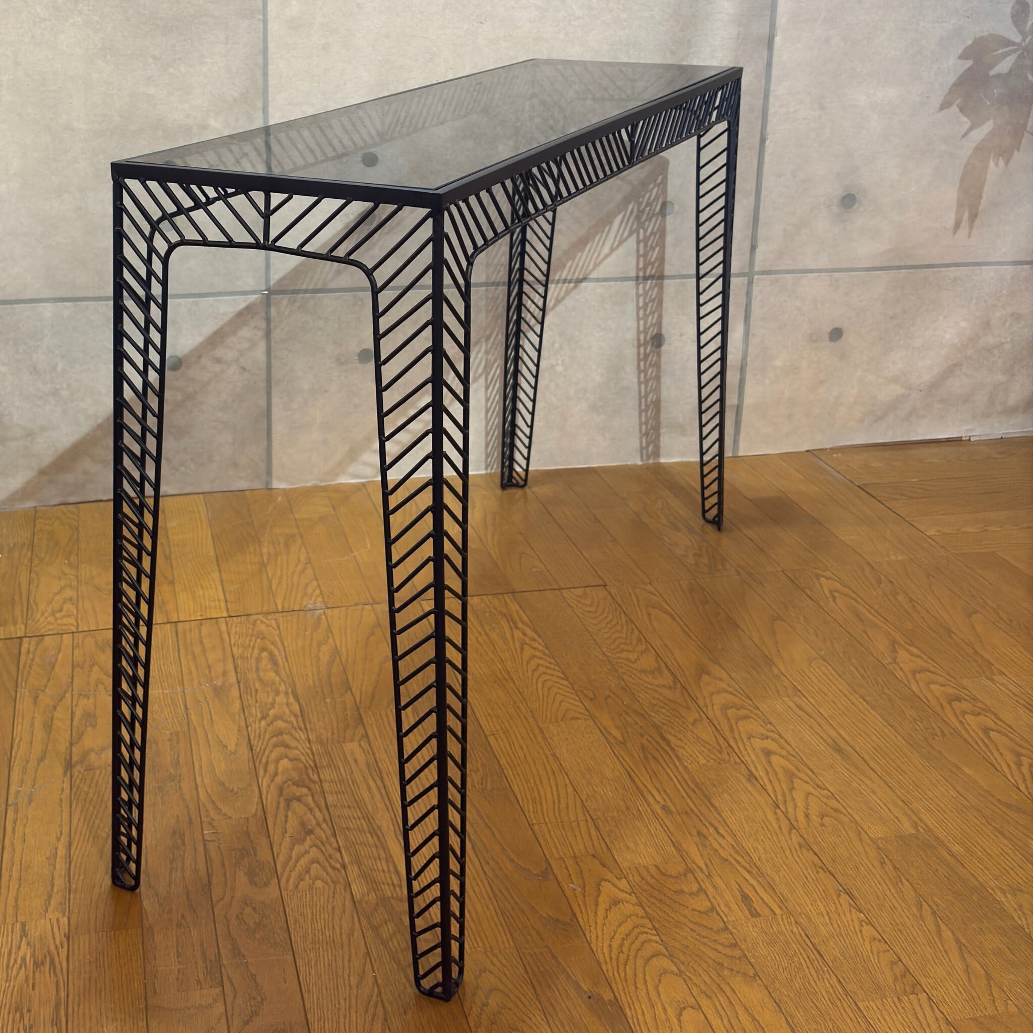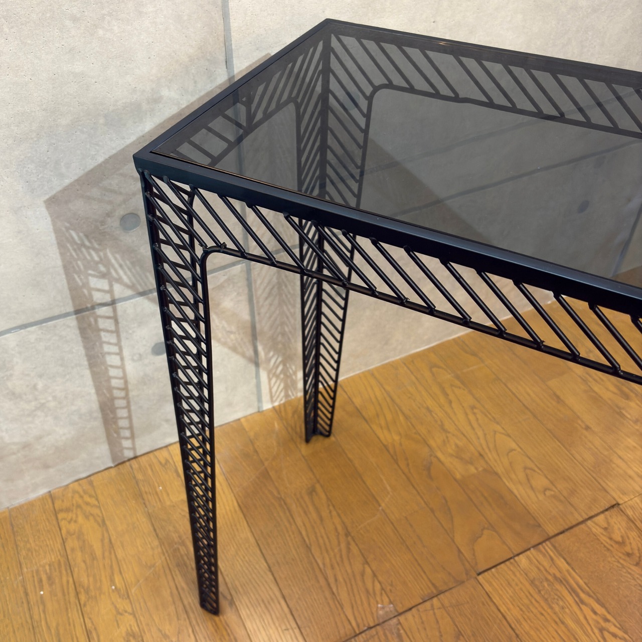 ミニマルなデザインの中に素材の質感が際立つコンソールテーブルです。シャープなブラックアイアンのフレームとスモークガラス天板の組み合わせが空間を洗練された印象へと導きます。ミッドセンチュリーモダンな佇まいは現代のインテリアスタイルにも調和します。