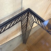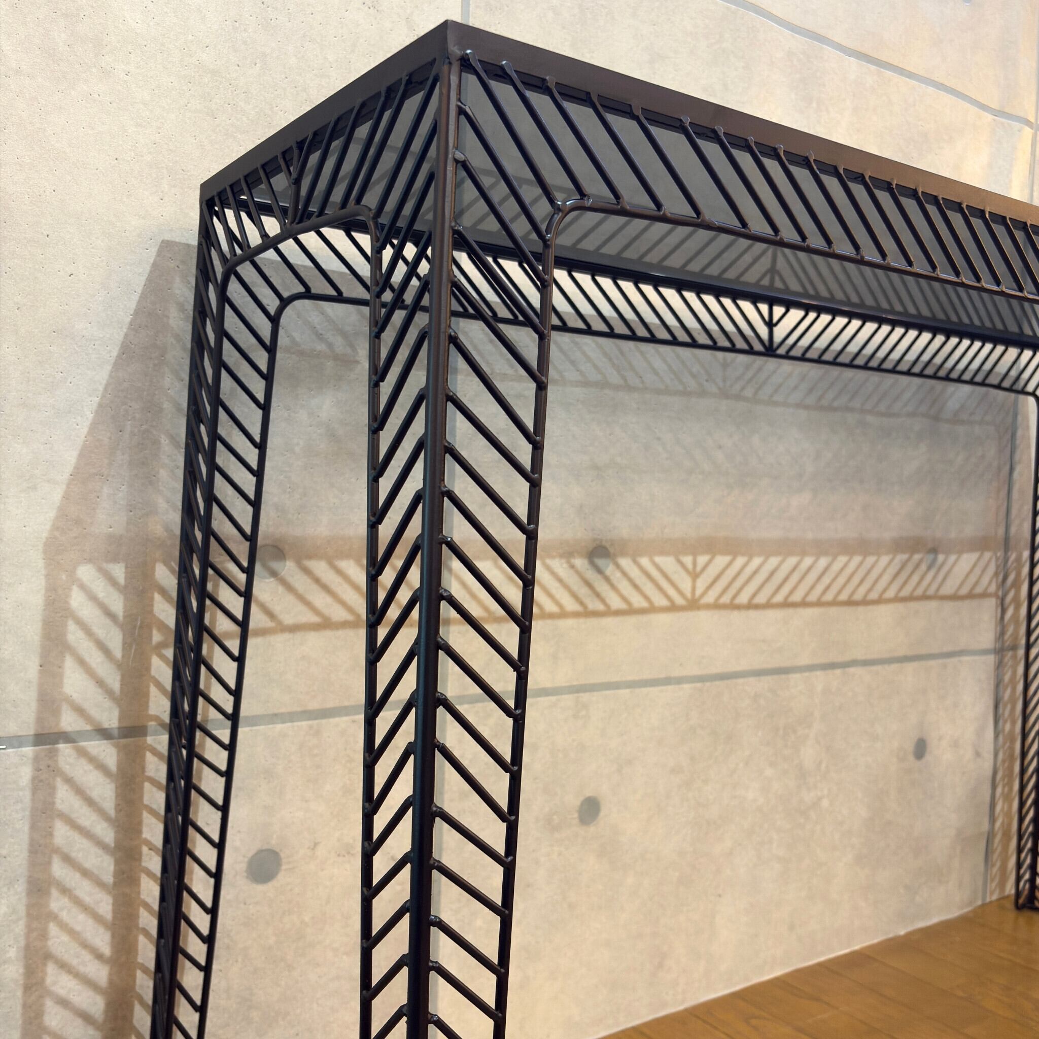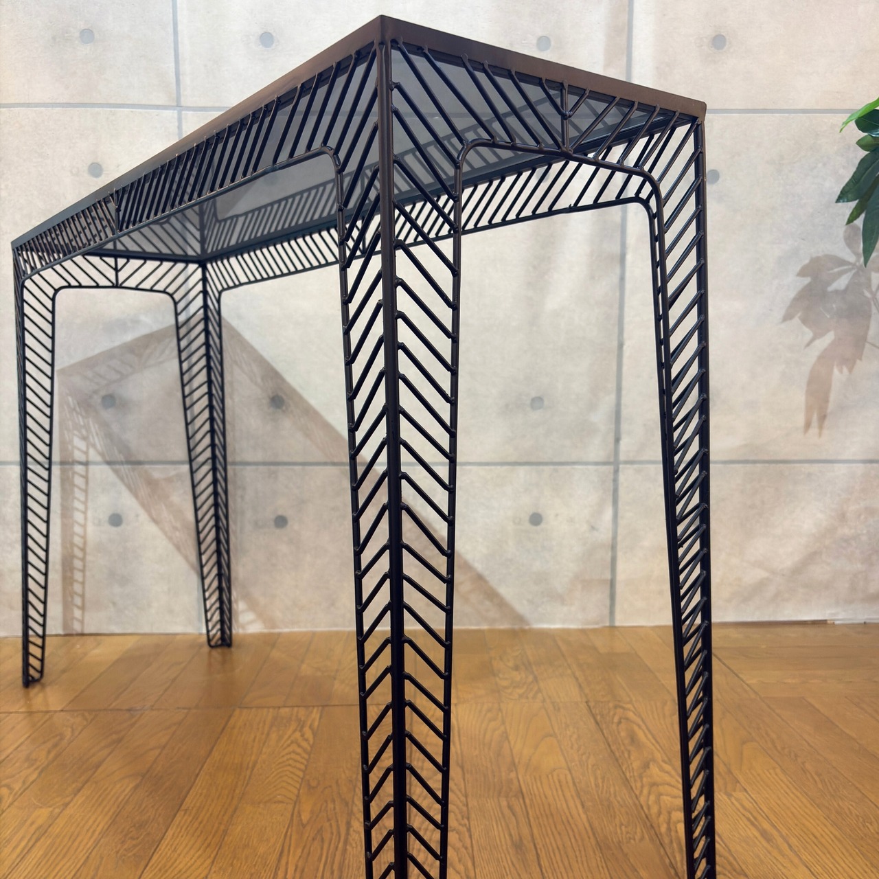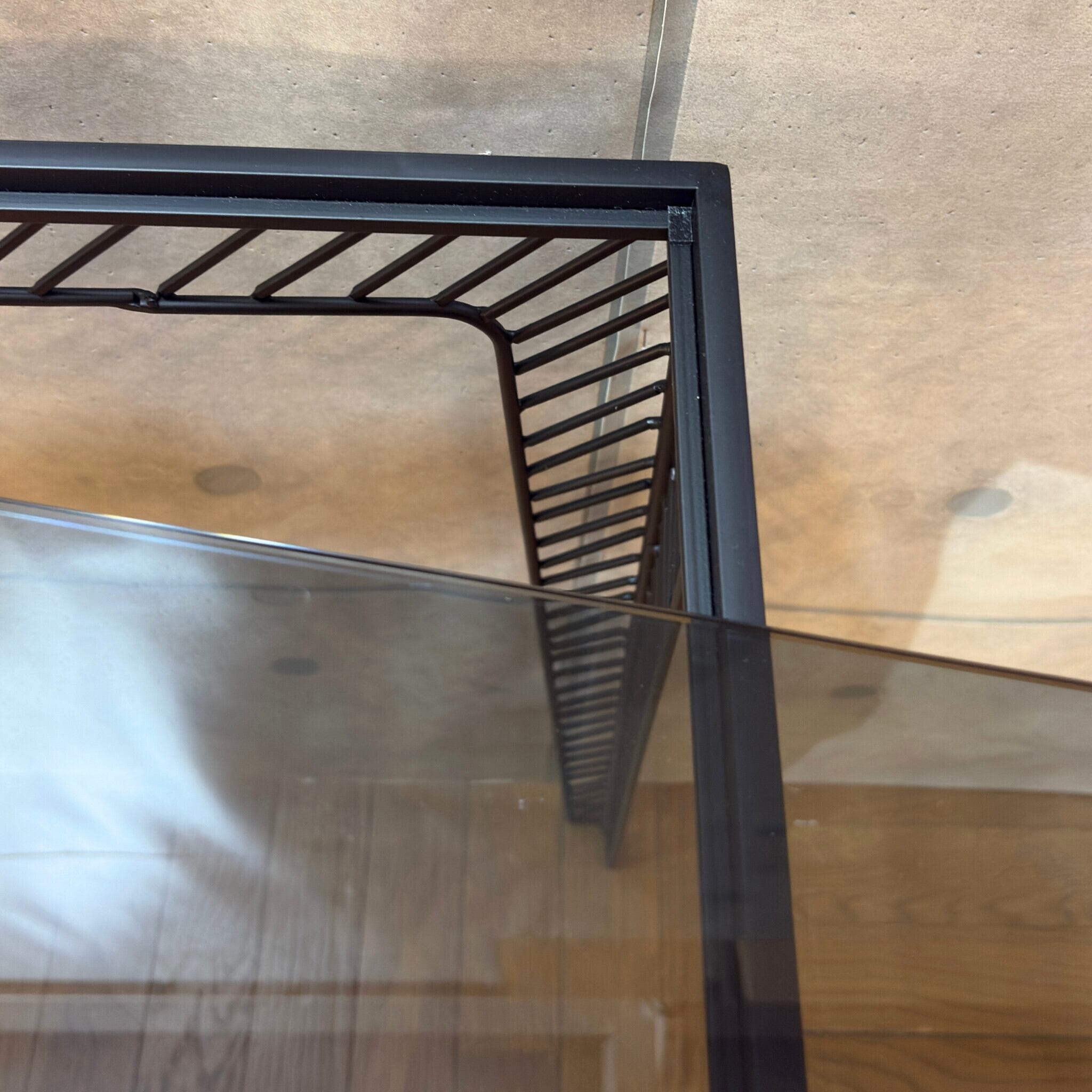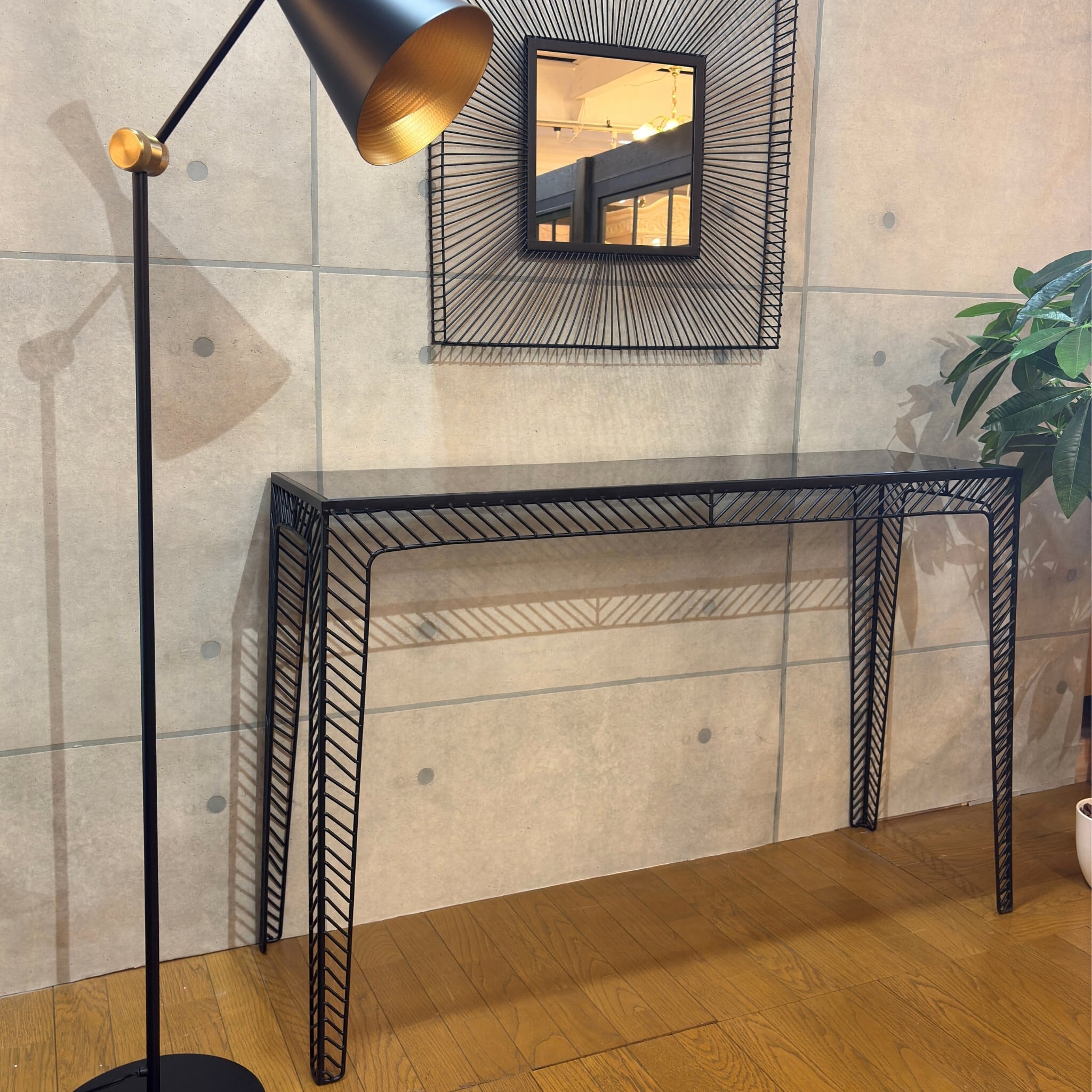 ミニマルなデザインの中に素材の質感が際立つコンソールテーブルです。シャープなブラックアイアンのフレームとスモークガラス天板の組み合わせが空間を洗練された印象へと導きます。ミッドセンチュリーモダンな佇まいは現代のインテリアスタイルにも調和します。
