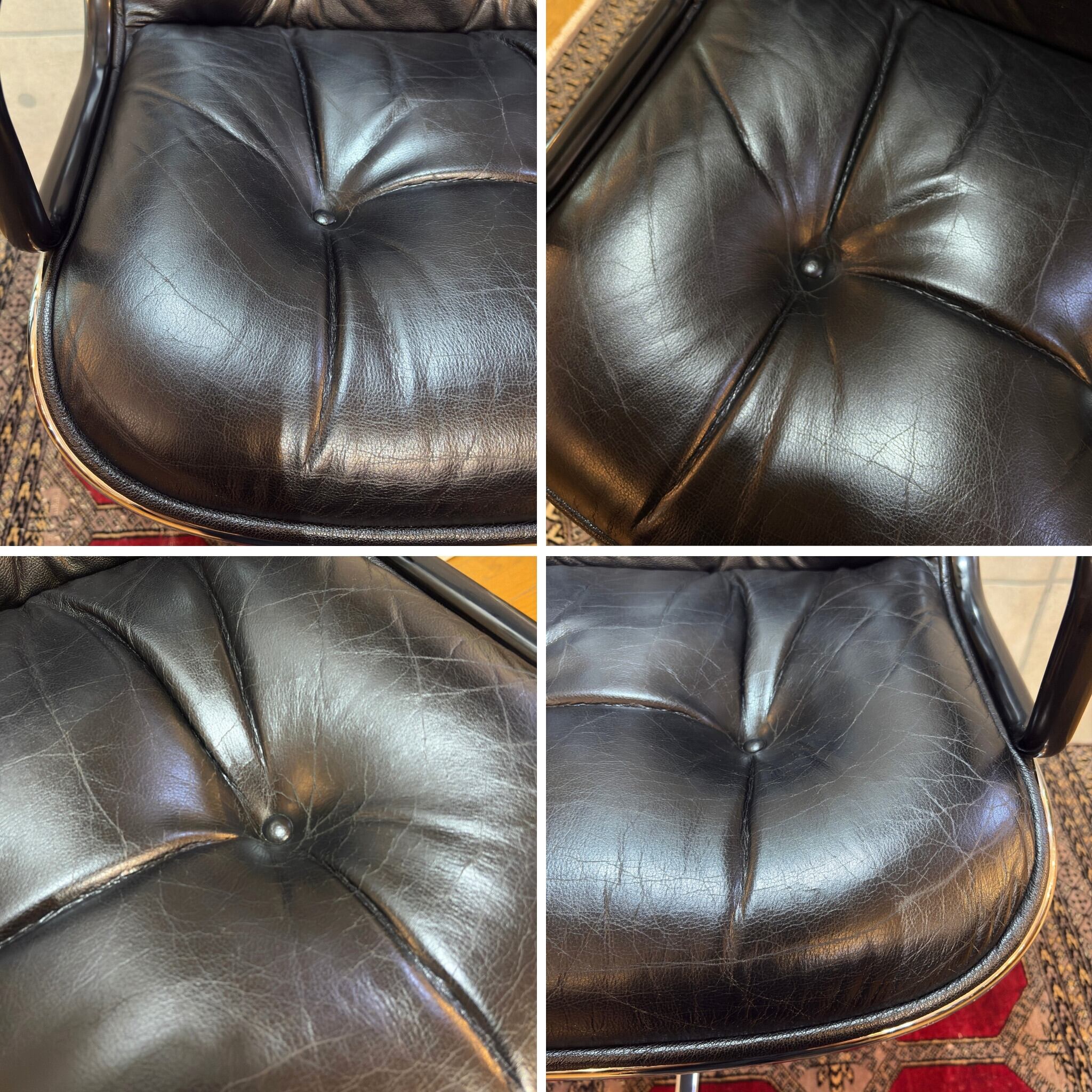 古い年代のポロックチェアにはガス圧昇降機能やリクライニング機能がないものも多い中、この個体は5本脚であることと部品の形状から、比較的年代が新しいモデルと判断できます。現代のオフィスチェアに近い機能を持ちながら重厚な雰囲気を楽しめる希少な一脚です。当然ながら回転機能も備わっています。