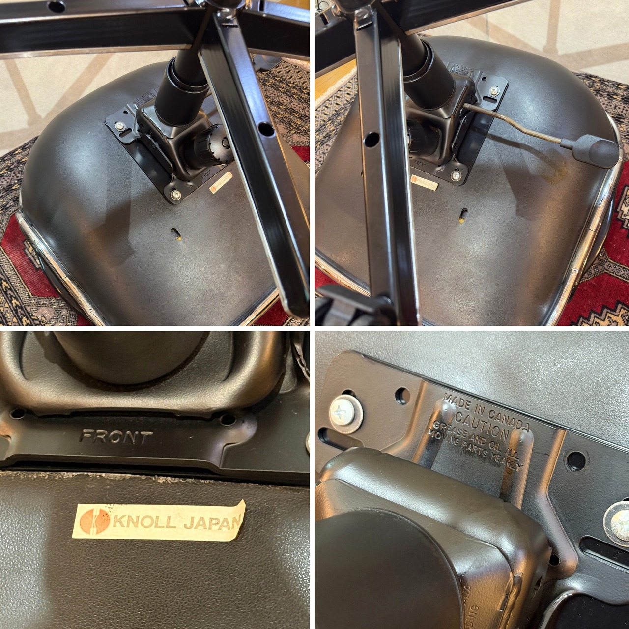 この個体は裏面に「Knoll Japan」のシールが残る、当時の日本法人で販売された正規品です。剥がれている個体が多い中でこのシールが残っていることはコレクターにとっても非常に価値のあるポイントです。また、脚部の金属パーツにはカナダ製の刻印があり確かな品質を裏付けています。