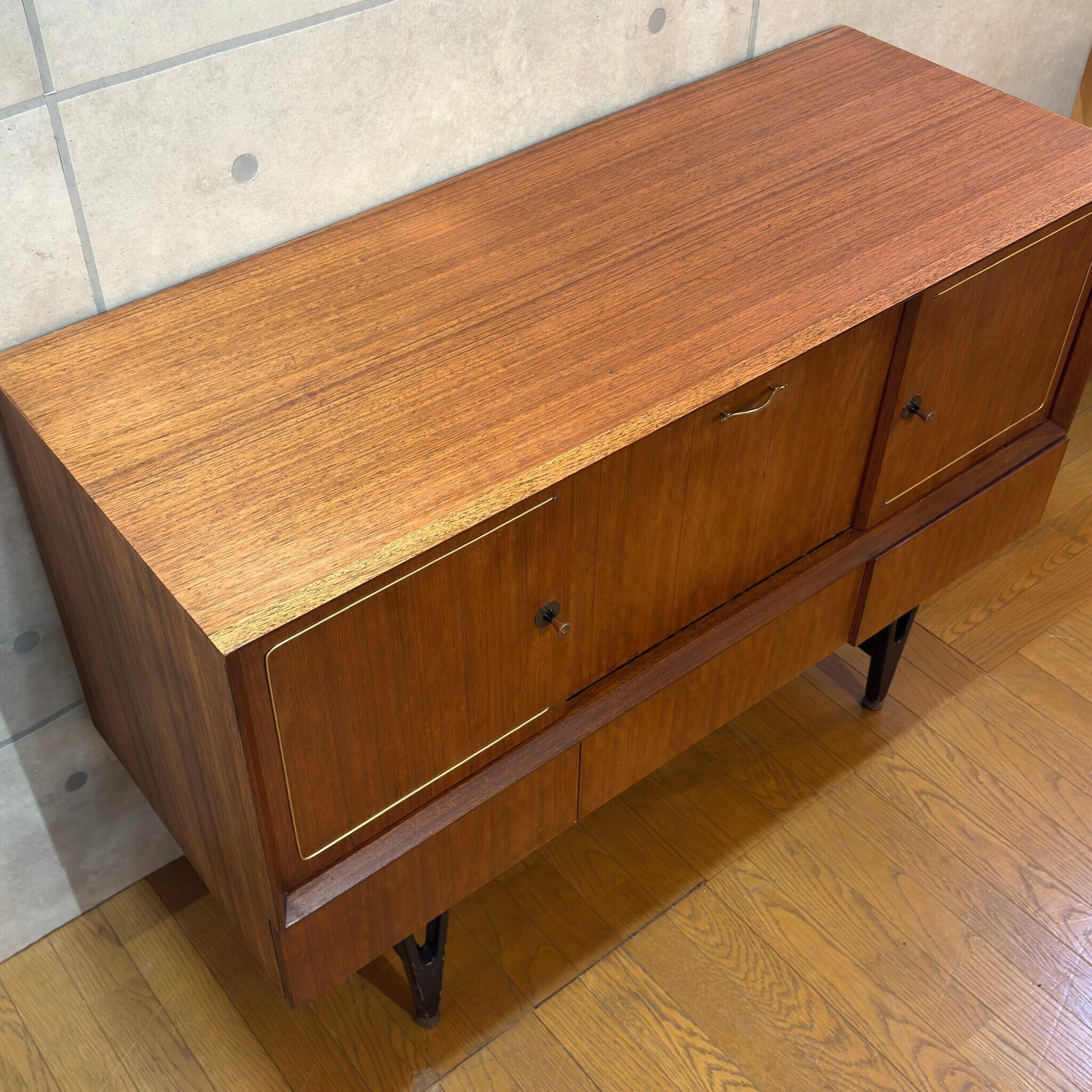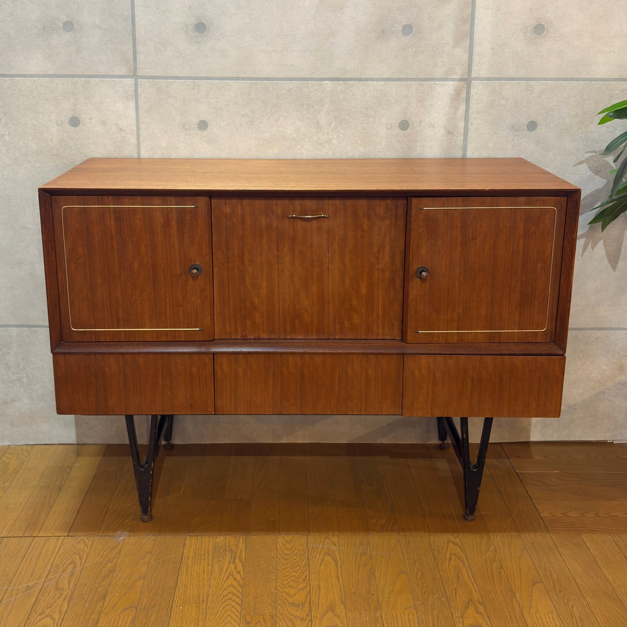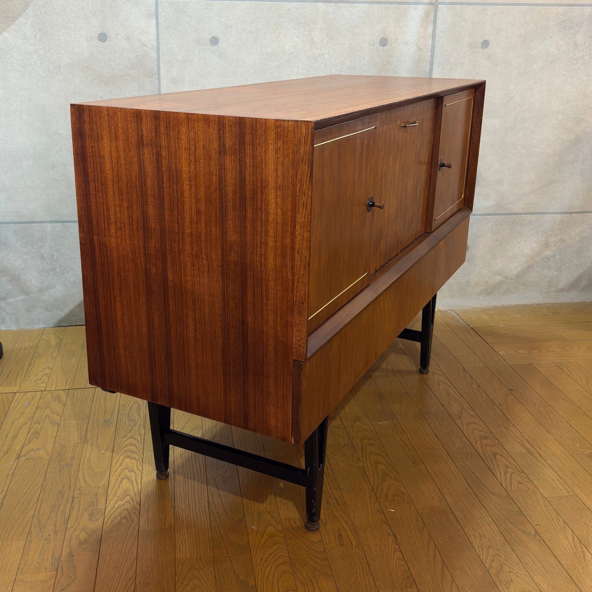 デザインで特に目を引くのが両サイドの扉に施された特徴的な真鍮の装飾です。矢じりのようにシャープでかつ優雅な曲線を描くこの意匠は当時のミッドセンチュリーデザインが目指した未来への志向と伝統的な素材の融合を象徴しているかのようです。チーク材の温かみと真鍮のきらめきが絶妙なコントラストを生み出し空間に洗練されたアクセントを加えます。