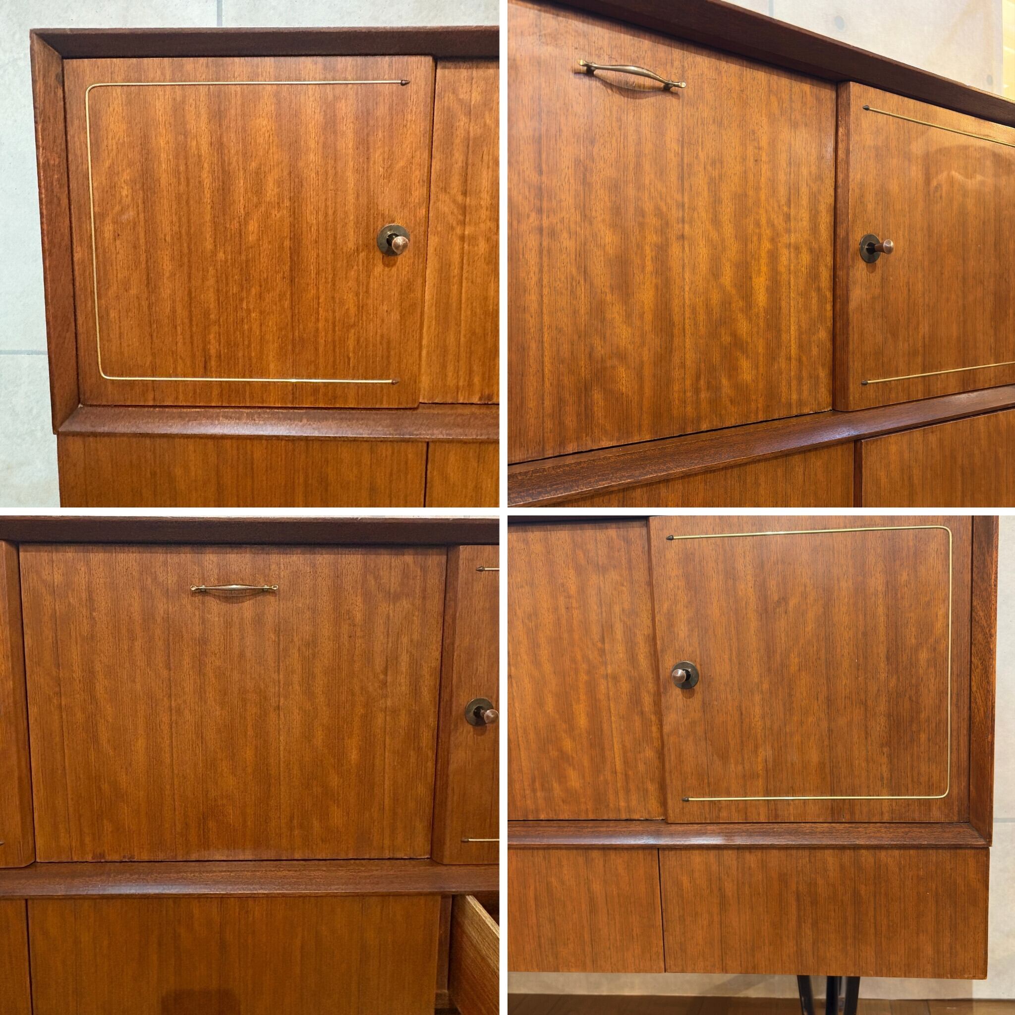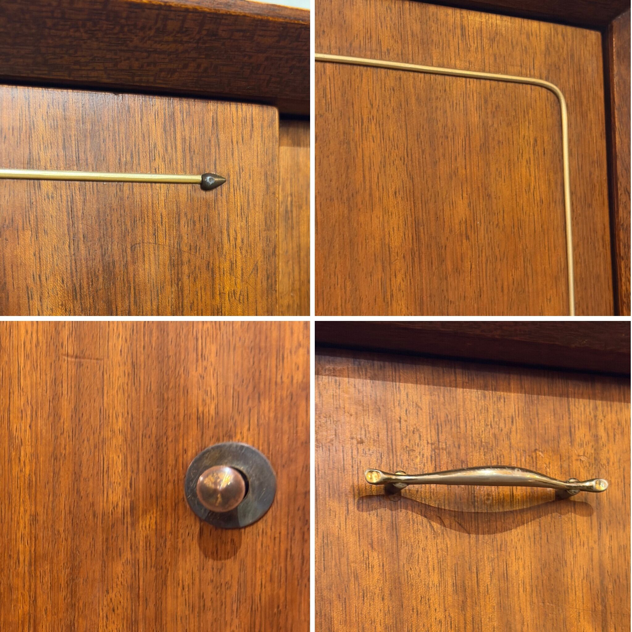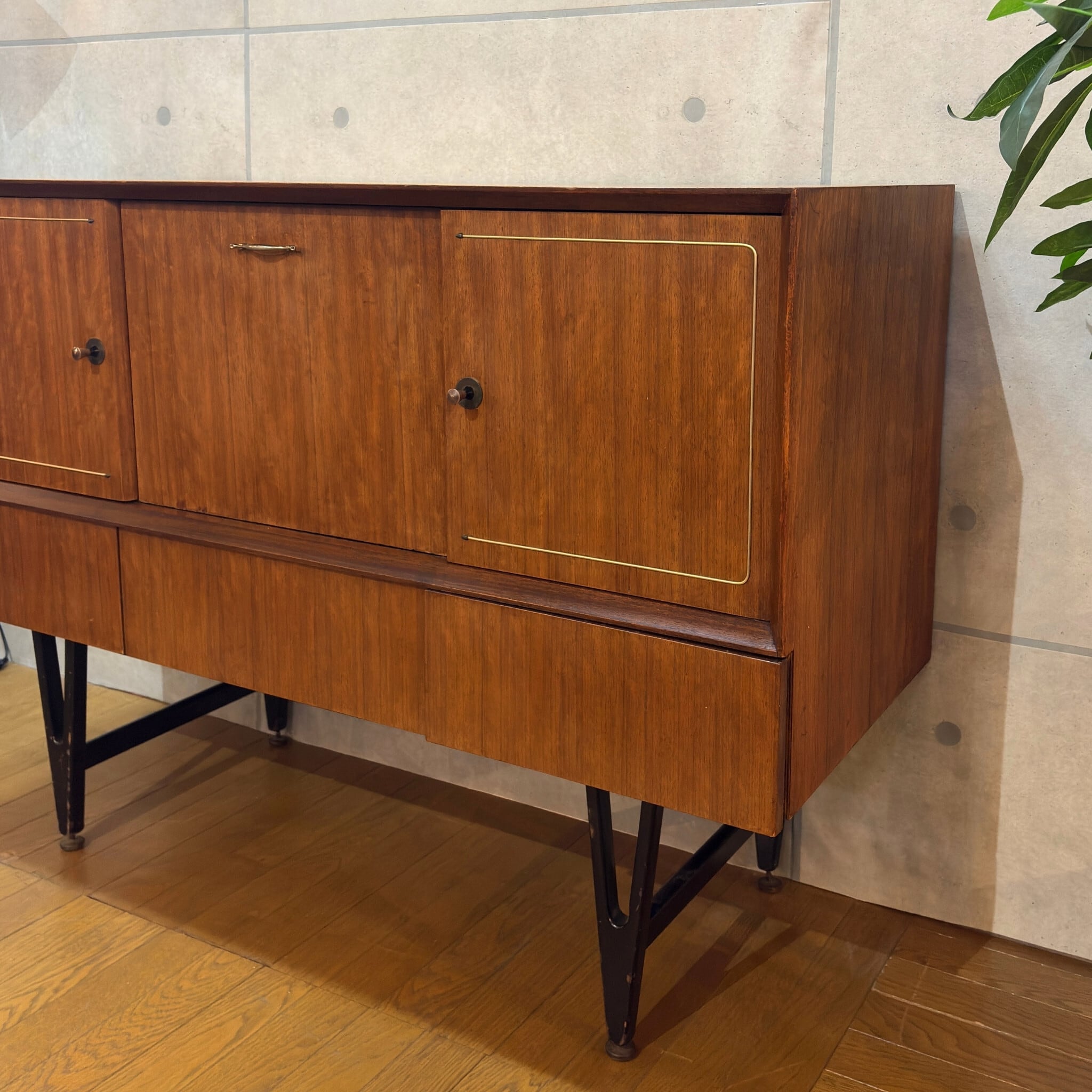 デザインで特に目を引くのが両サイドの扉に施された特徴的な真鍮の装飾です。矢じりのようにシャープでかつ優雅な曲線を描くこの意匠は当時のミッドセンチュリーデザインが目指した未来への志向と伝統的な素材の融合を象徴しているかのようです。チーク材の温かみと真鍮のきらめきが絶妙なコントラストを生み出し空間に洗練されたアクセントを加えます。