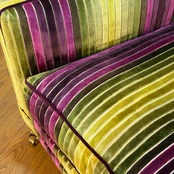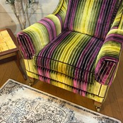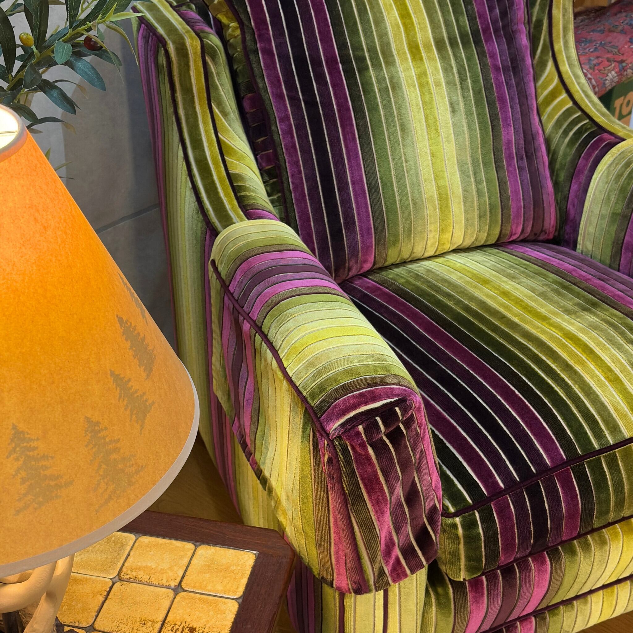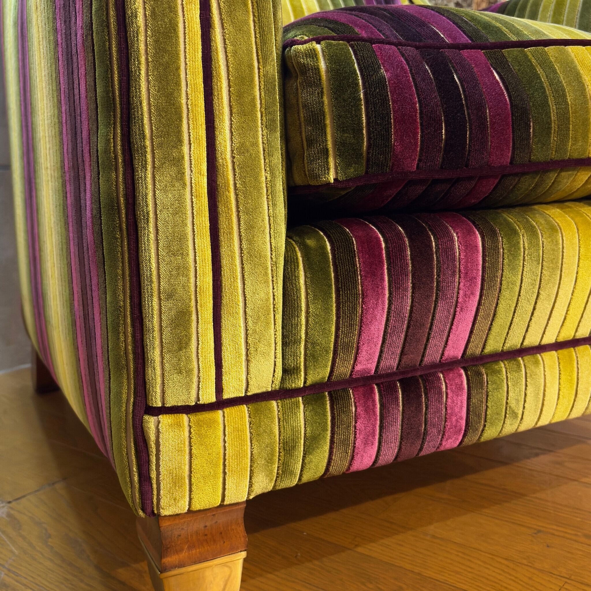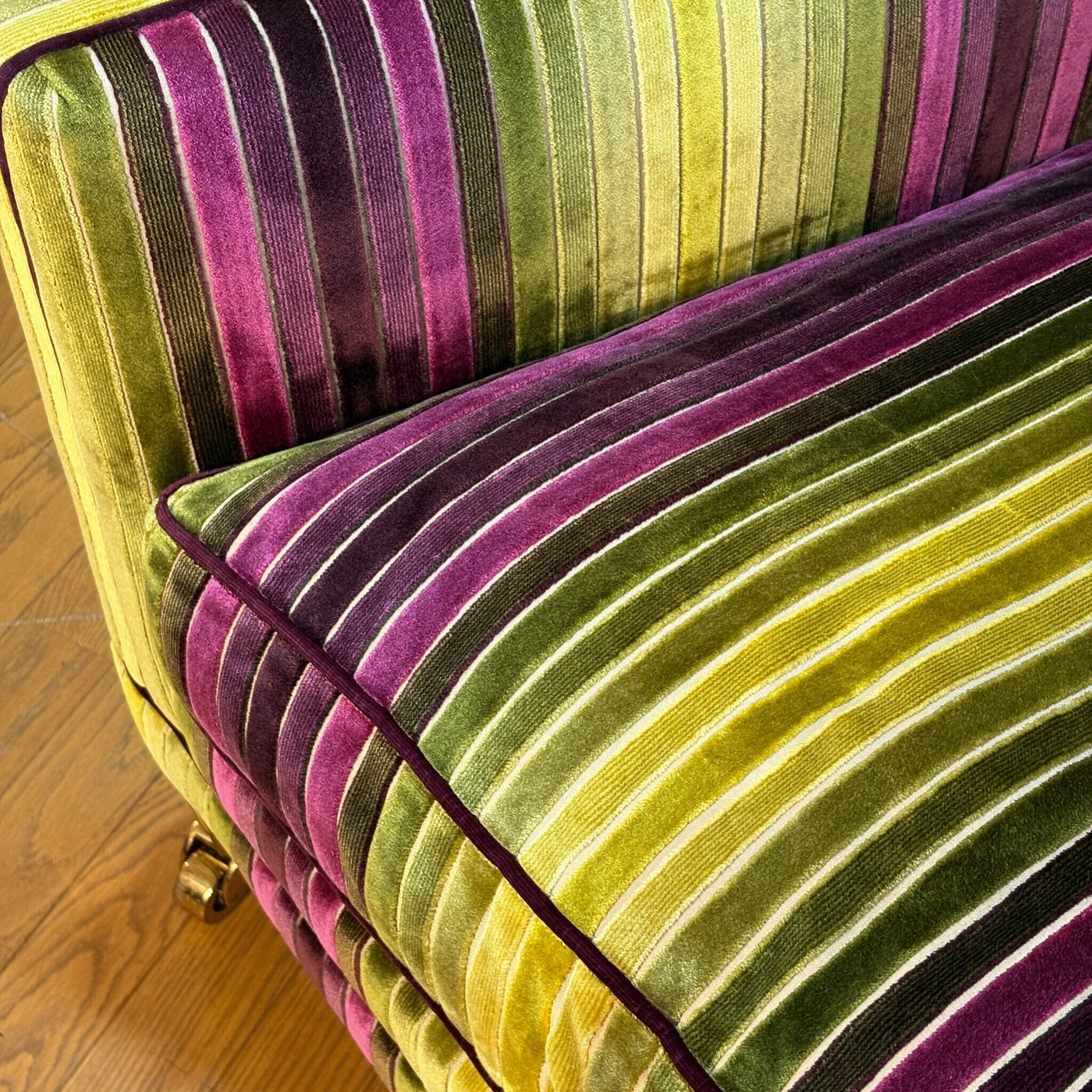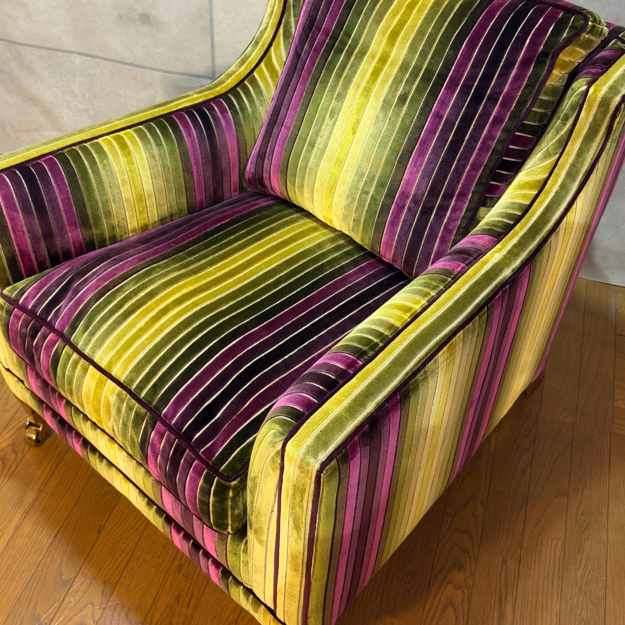 デザイン性: この個体最大の魅力はイエロー、グリーン、マゼンタ、パープルが織りなす大胆で美しいマルチストライプのベルベット張り地です。空間の主役となるアクセントチェアにぴったりです。