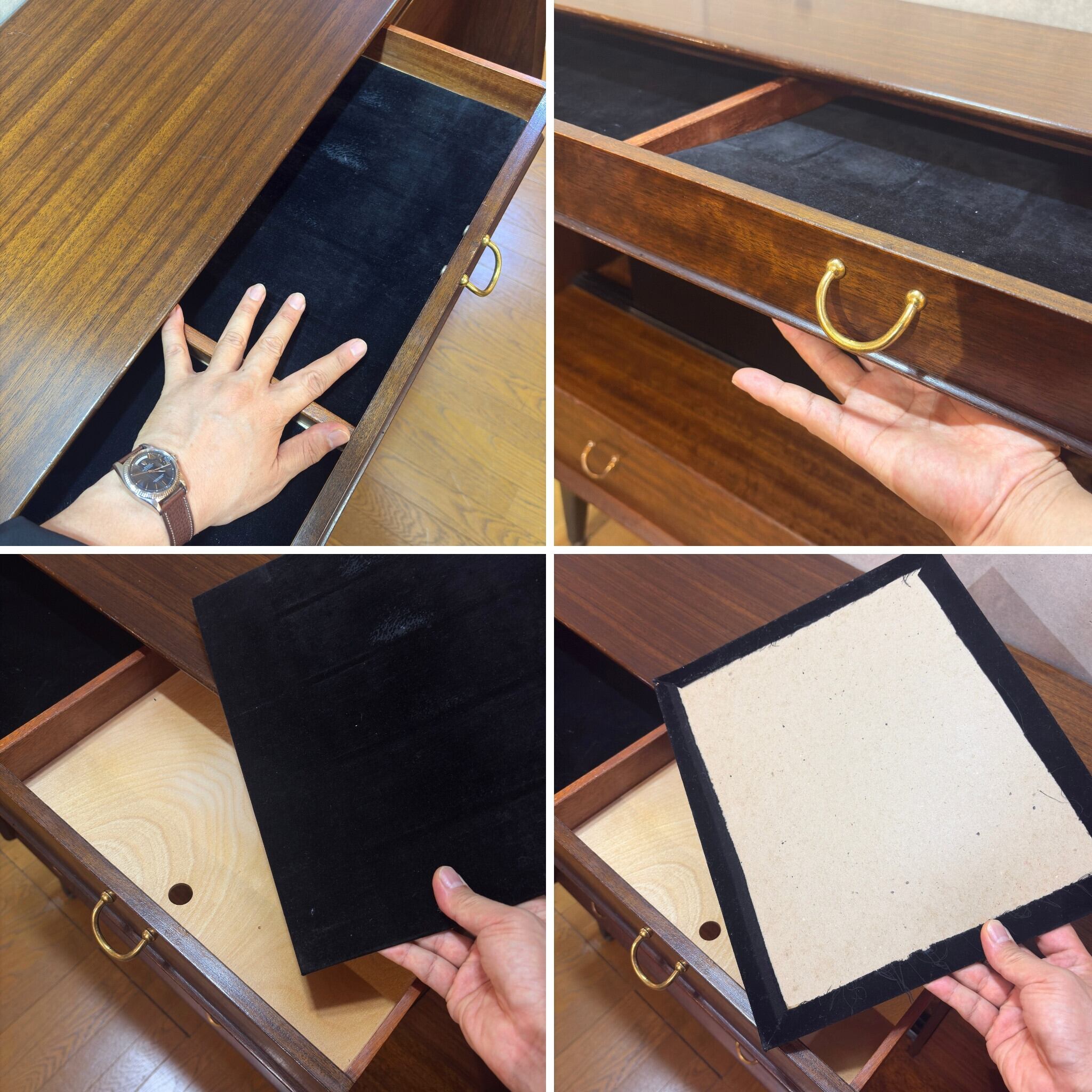 上部の引き出しには取り外し可能な黒いフェルト地の仕切りが付属していて、底部の穴から指で押すことで取り外しができます。厚紙のような素材に布が巻かれているだけですのでお好みに合わせて張り替えたり、作り直していただいても良いかと思います。