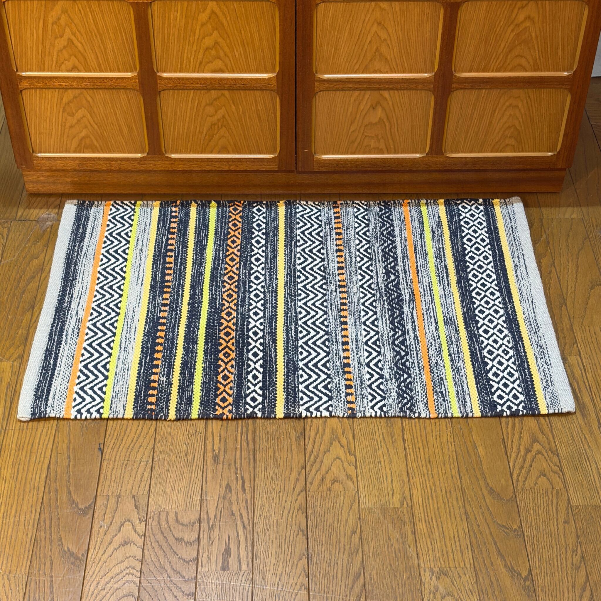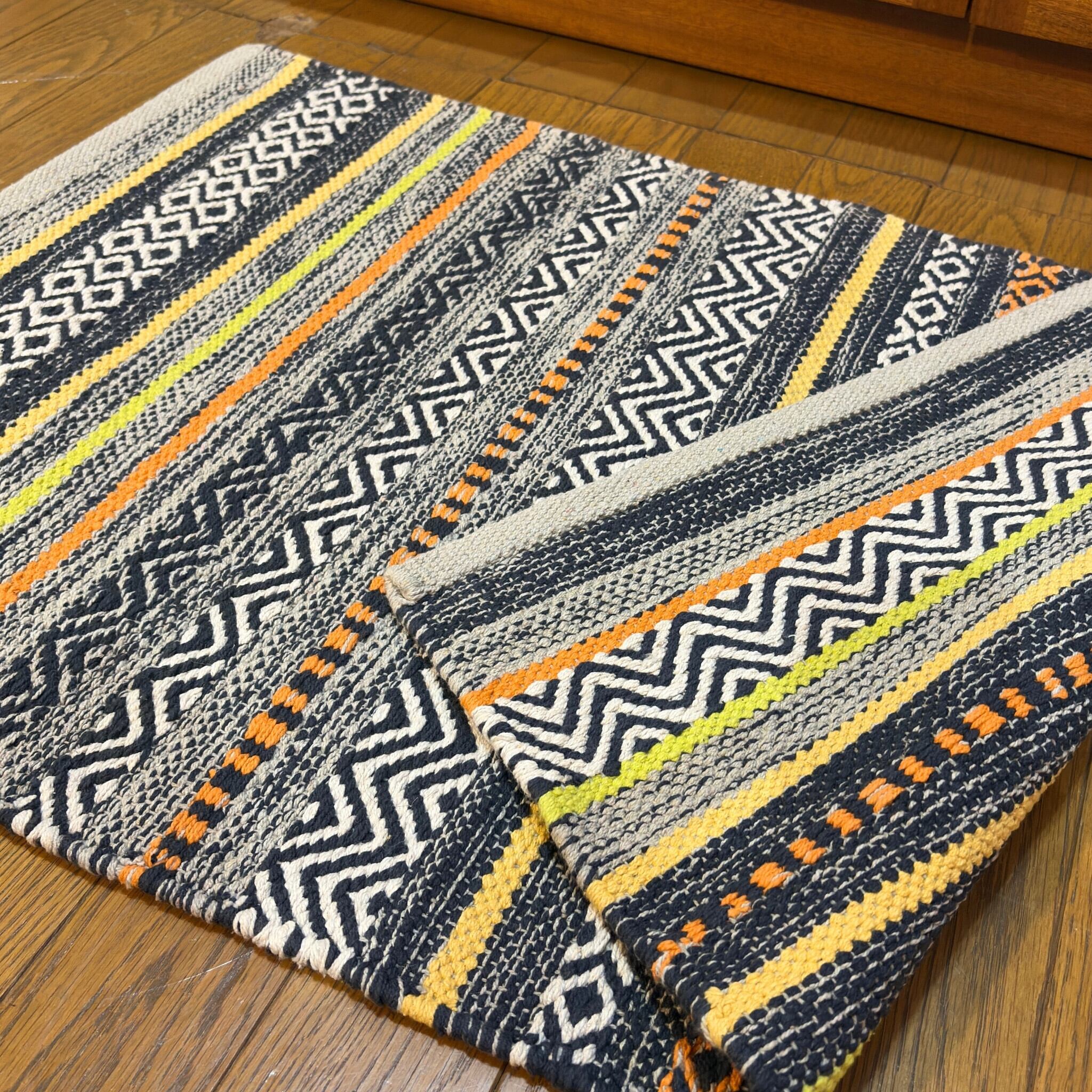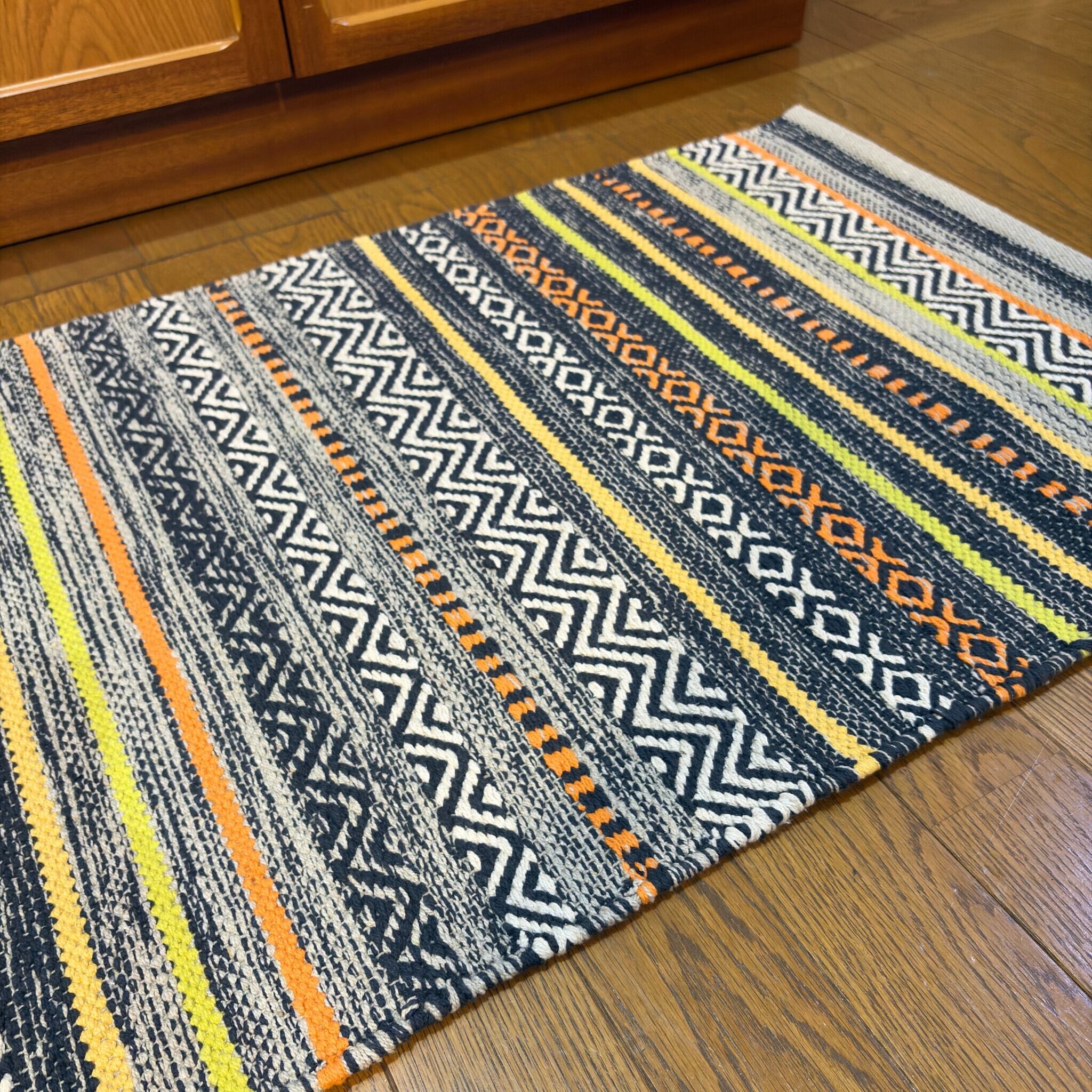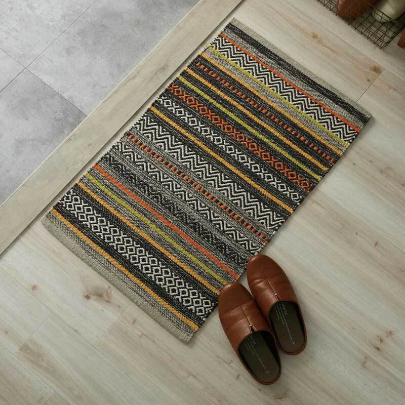 ネイティブアメリカンやエスニック調の伝統的なパターンに鮮やかなマルチカラーのラインを効かせた個性豊かなデザインのマットです。コットンをベースとした柔らかな風合いが温かい印象を与えてくれます。絨毯製造の歴史を持つインドで生産されたデザイン性と実用性を兼ね備えた一枚です。