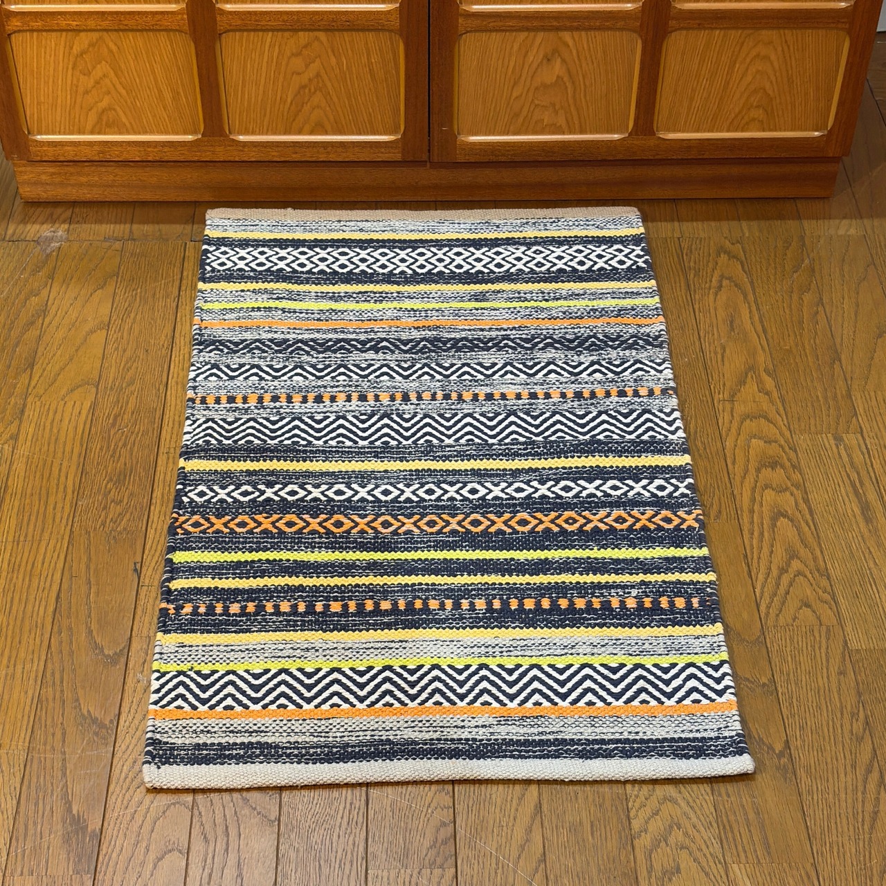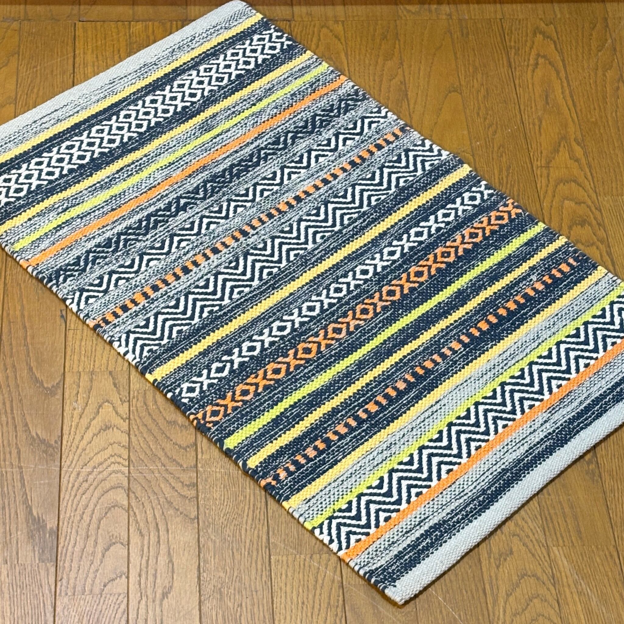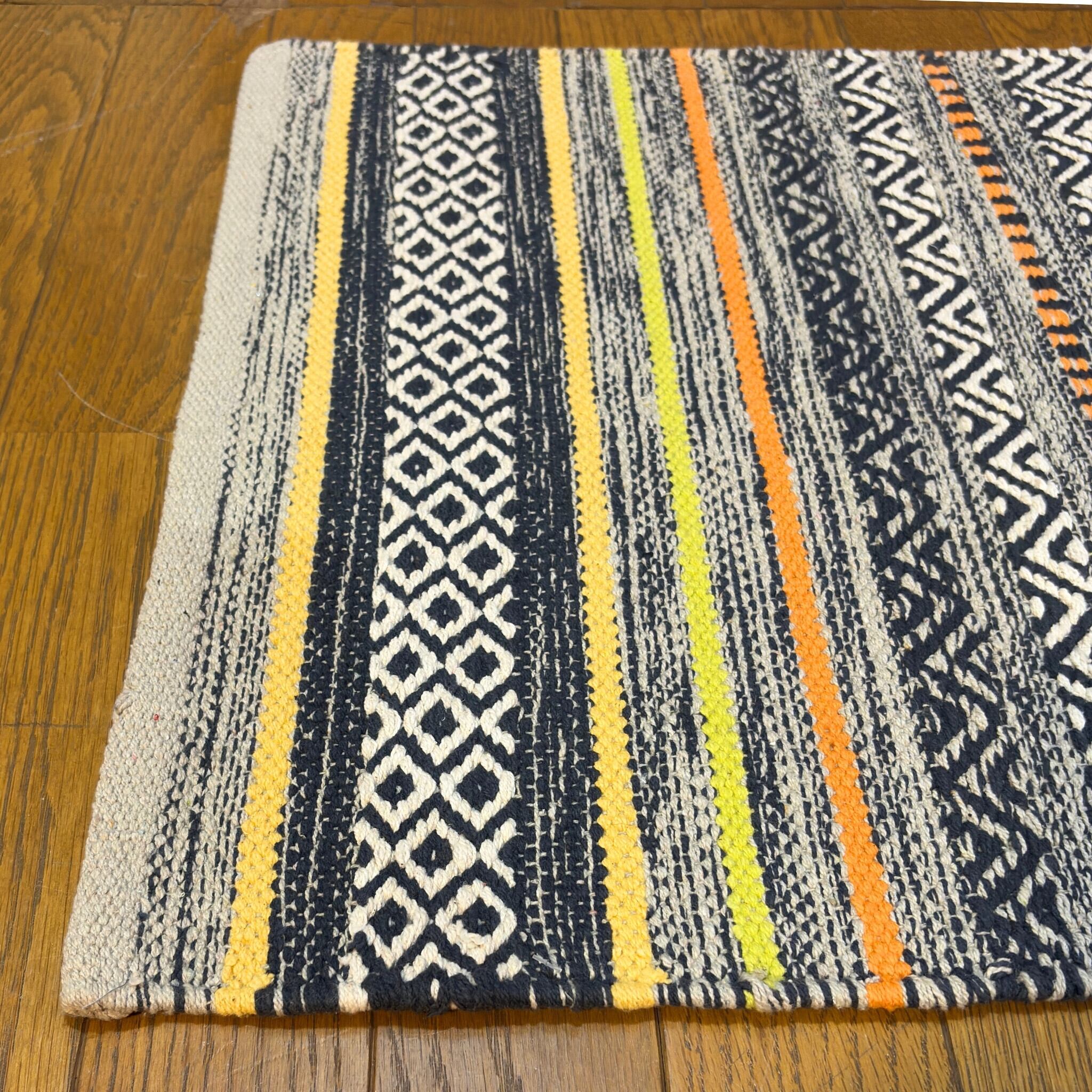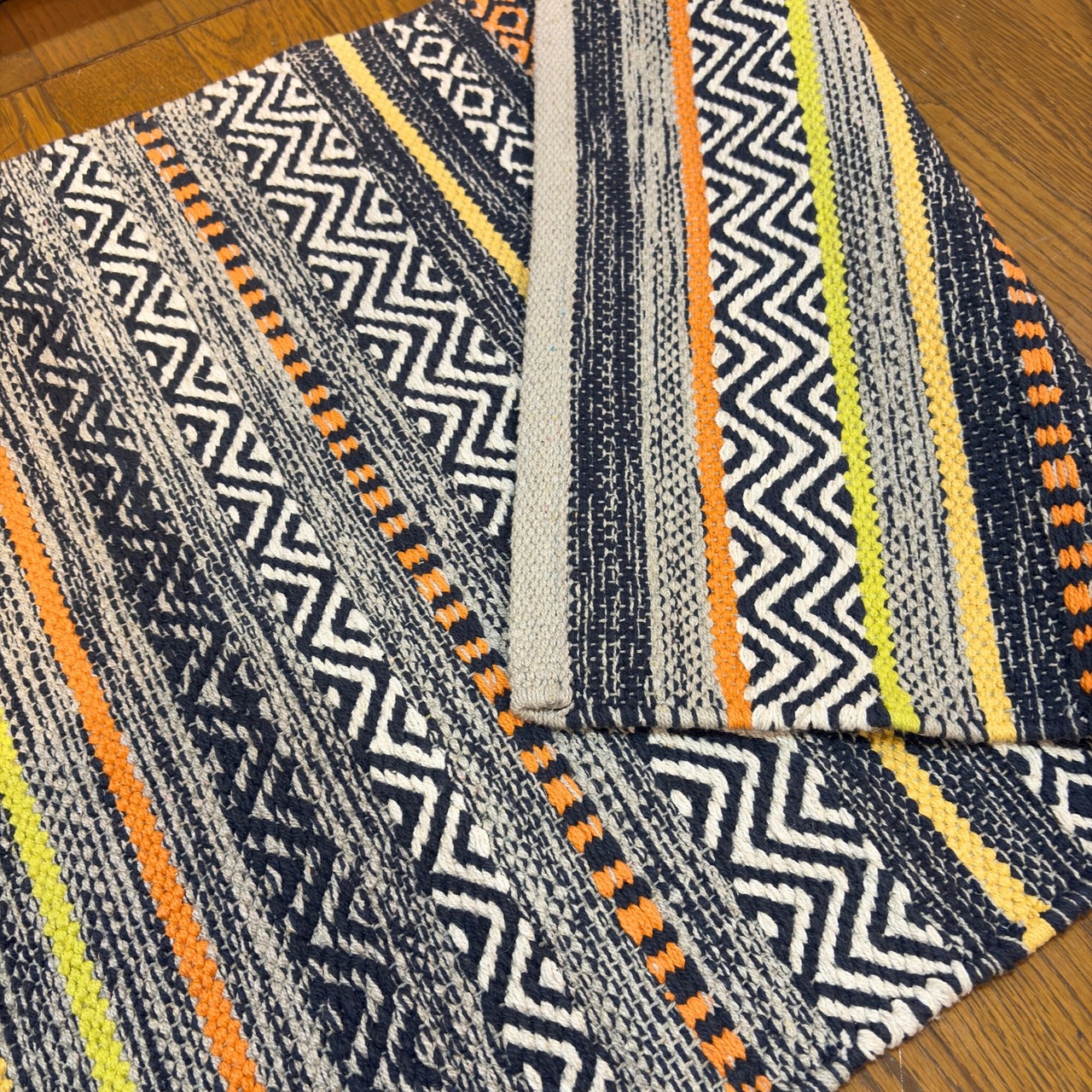 ネイティブアメリカンやエスニック調の伝統的なパターンに鮮やかなマルチカラーのラインを効かせた個性豊かなデザインのマットです。コットンをベースとした柔らかな風合いが温かい印象を与えてくれます。絨毯製造の歴史を持つインドで生産されたデザイン性と実用性を兼ね備えた一枚です。