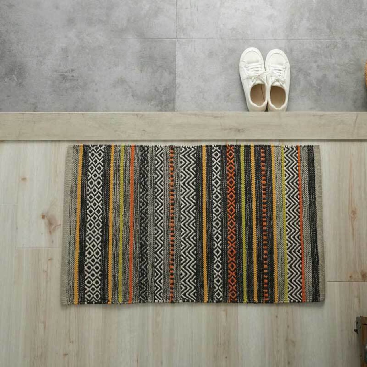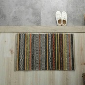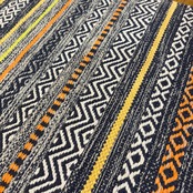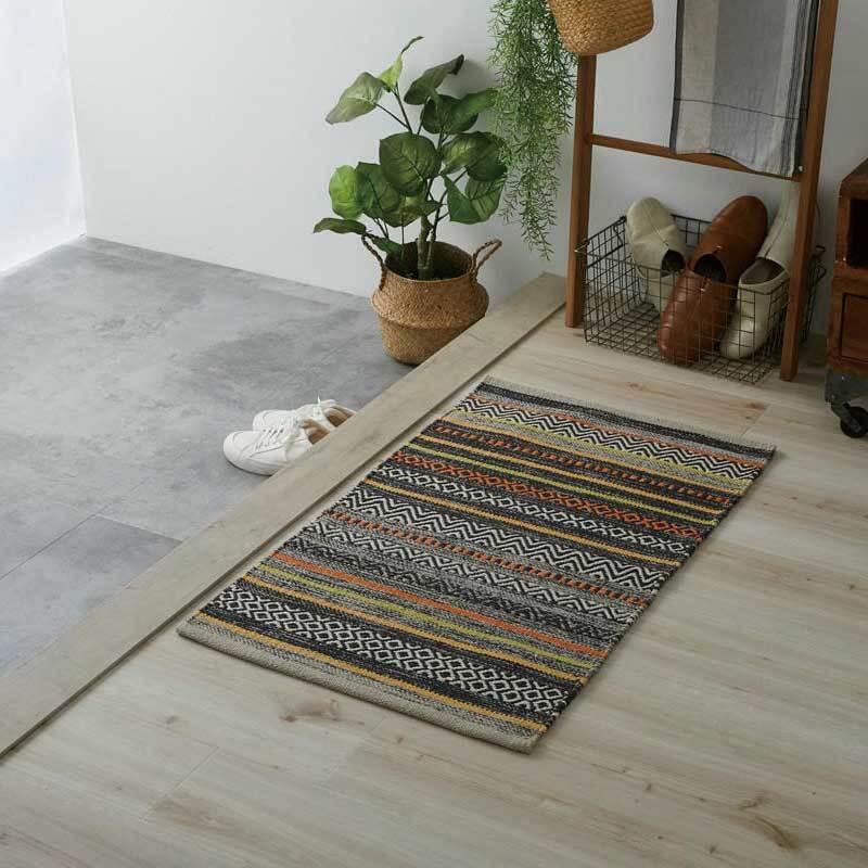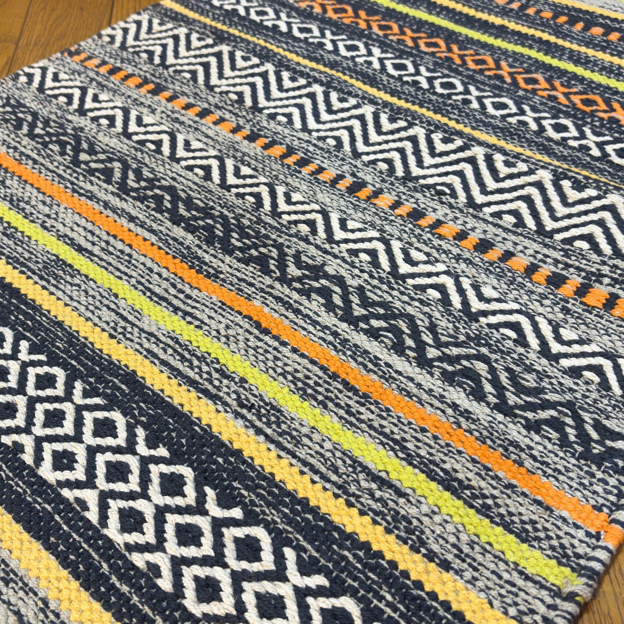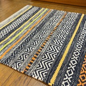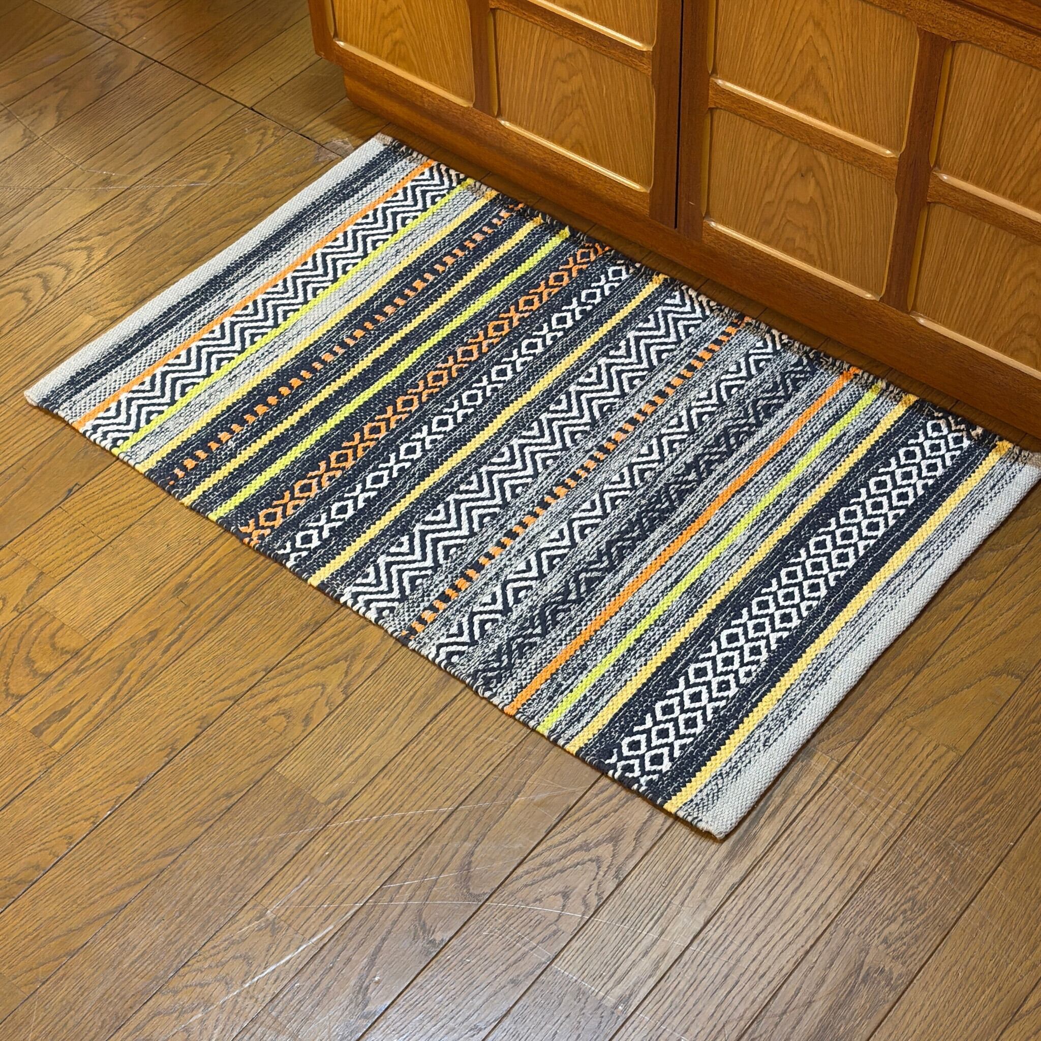 ネイティブアメリカンやエスニック調の伝統的なパターンに鮮やかなマルチカラーのラインを効かせた個性豊かなデザインのマットです。コットンをベースとした柔らかな風合いが温かい印象を与えてくれます。絨毯製造の歴史を持つインドで生産されたデザイン性と実用性を兼ね備えた一枚です。