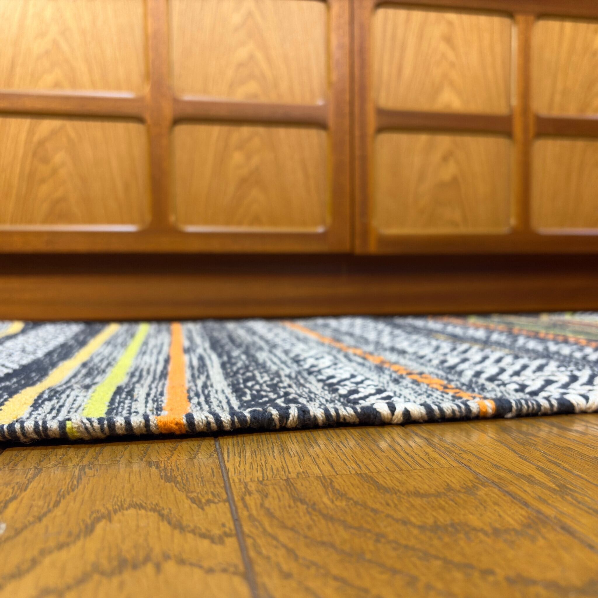 チーク材やオーク材のサイドボード、キャビネットの前に敷くこと木材の温かみとマットの鮮やかな色彩が美しいコントラストを生み出します。