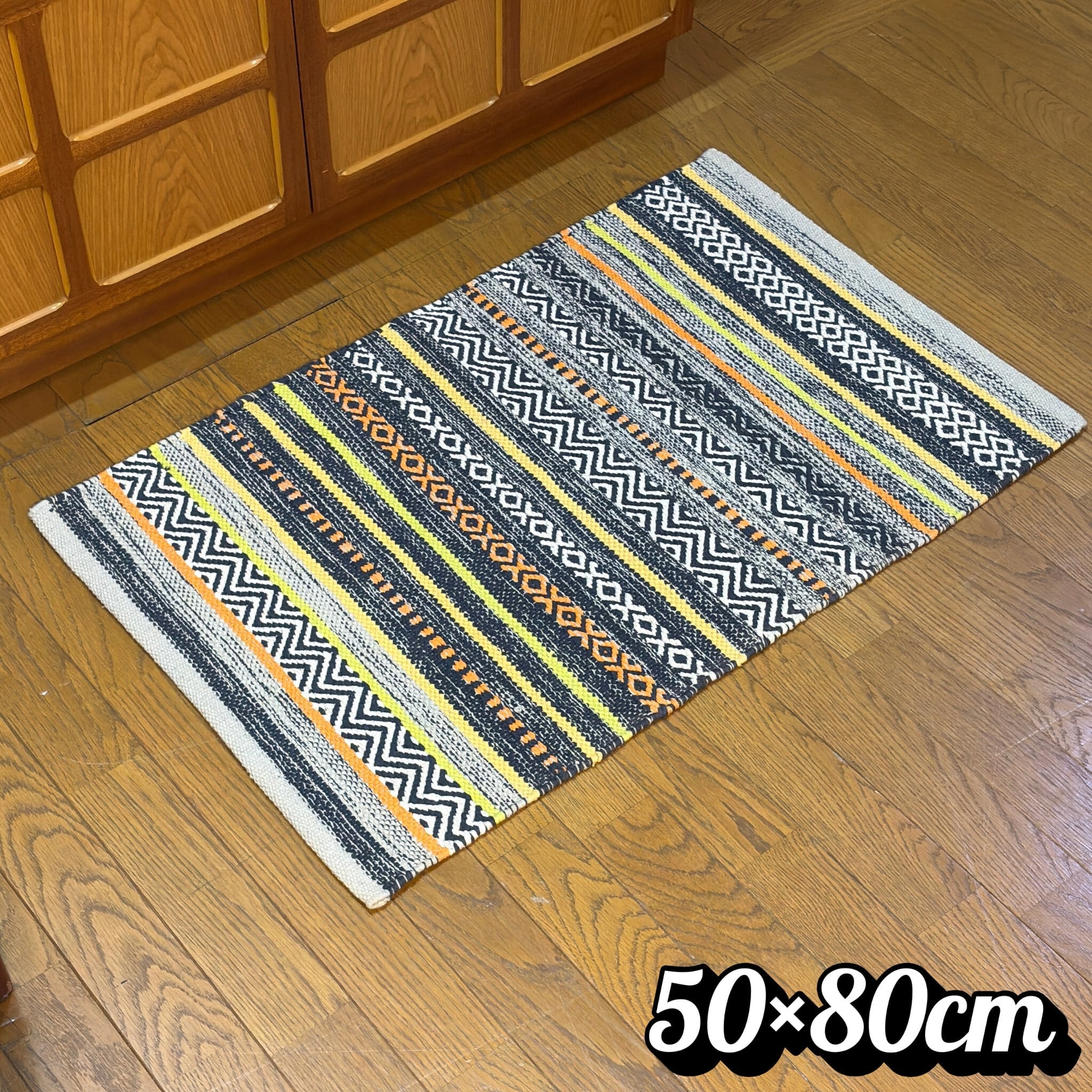 約50cm×80cmというコンパクトなサイズ感は空間の雰囲気を手軽に変えるアクセントラグとしての用途に適しています。
