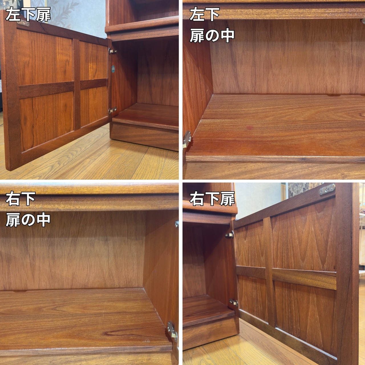 下部収納の扉に施された複数のスクエア(四角形)パネルはネイサンを代表するデザインです。温かみのあるチーク材が現代の空間にも美しいヴィンテージ感を添えます。