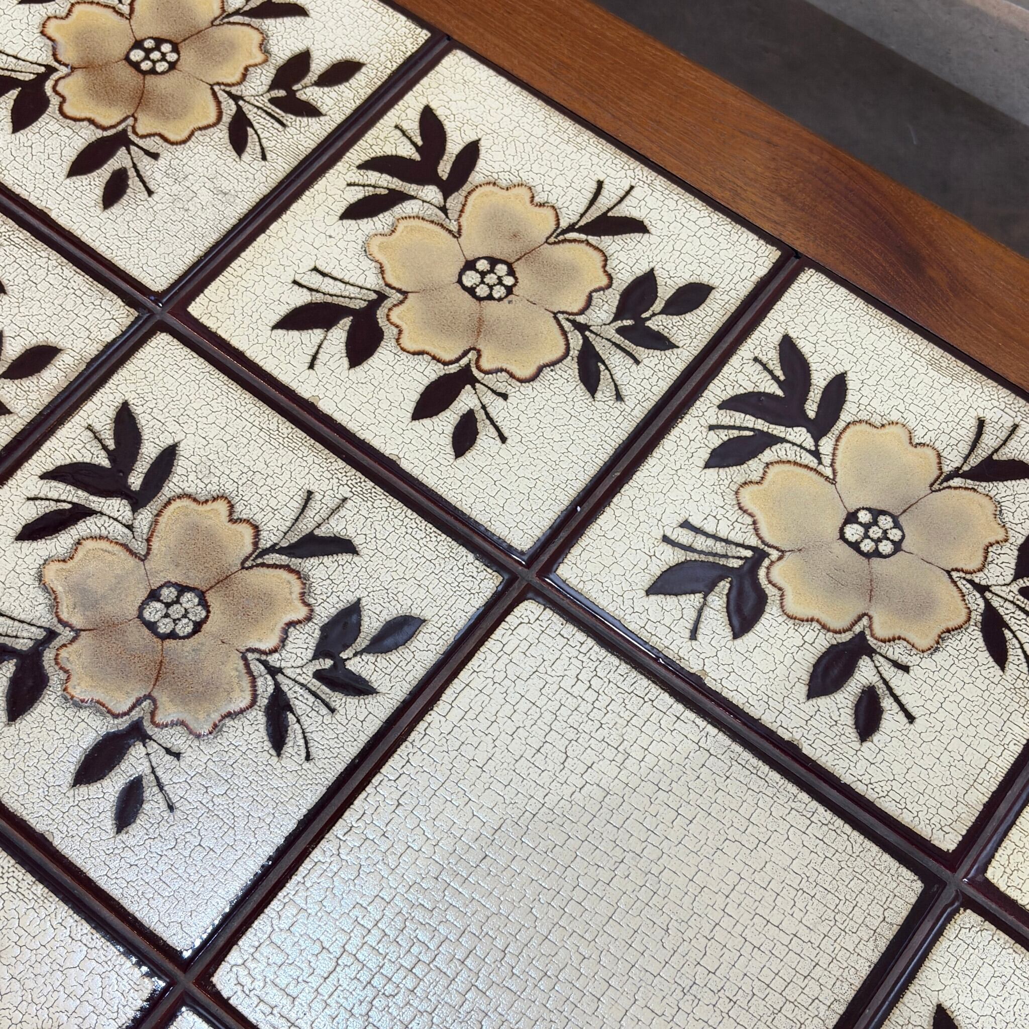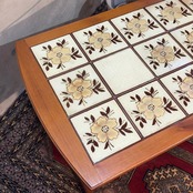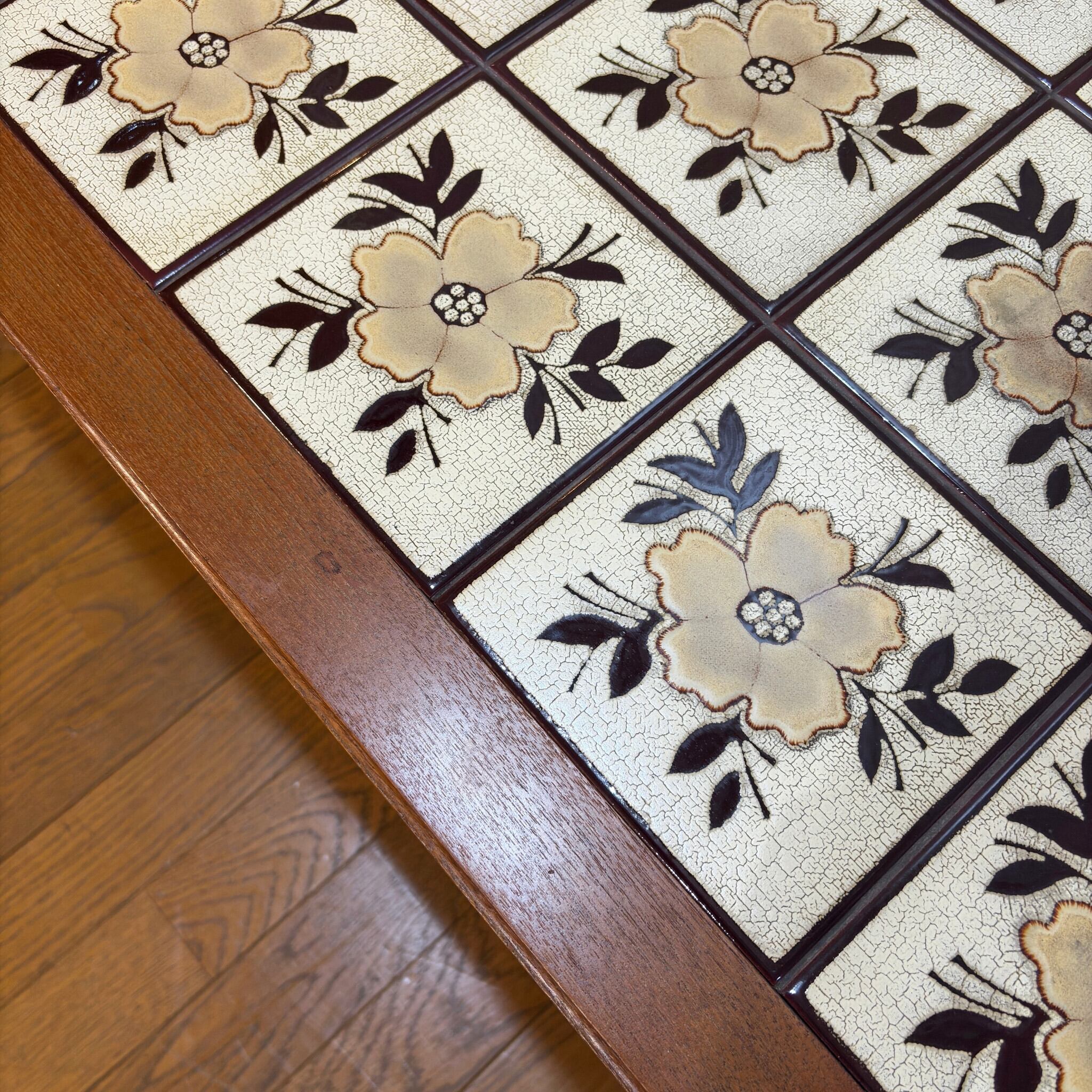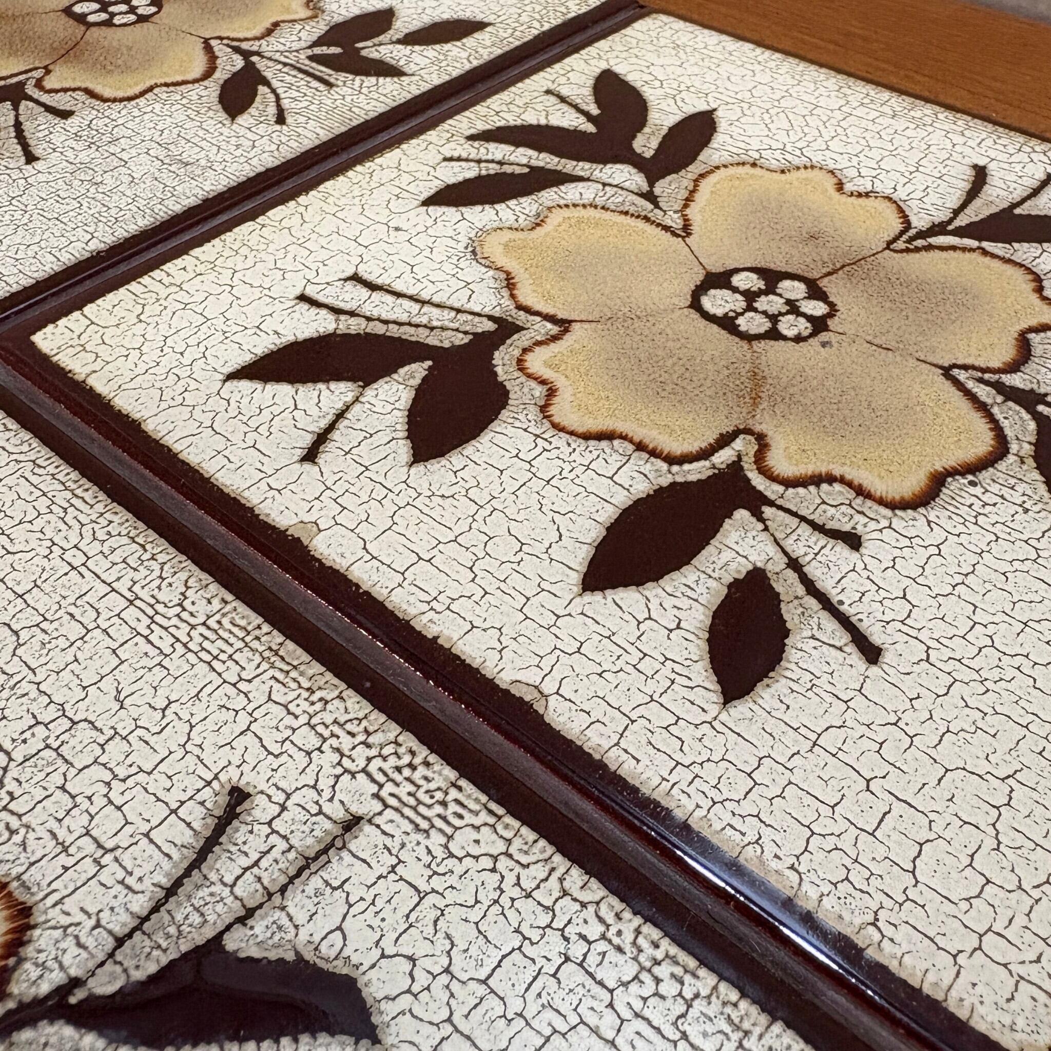 天板のタイルは焼成時に意図的に作られたクラックル(貫入)釉薬の模様が特徴です。素朴で美しい草花のパターンはノルタルジックな印象です。
