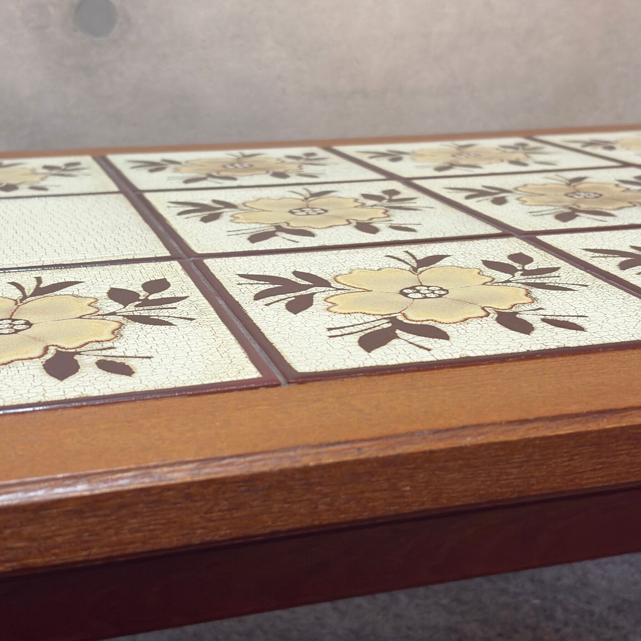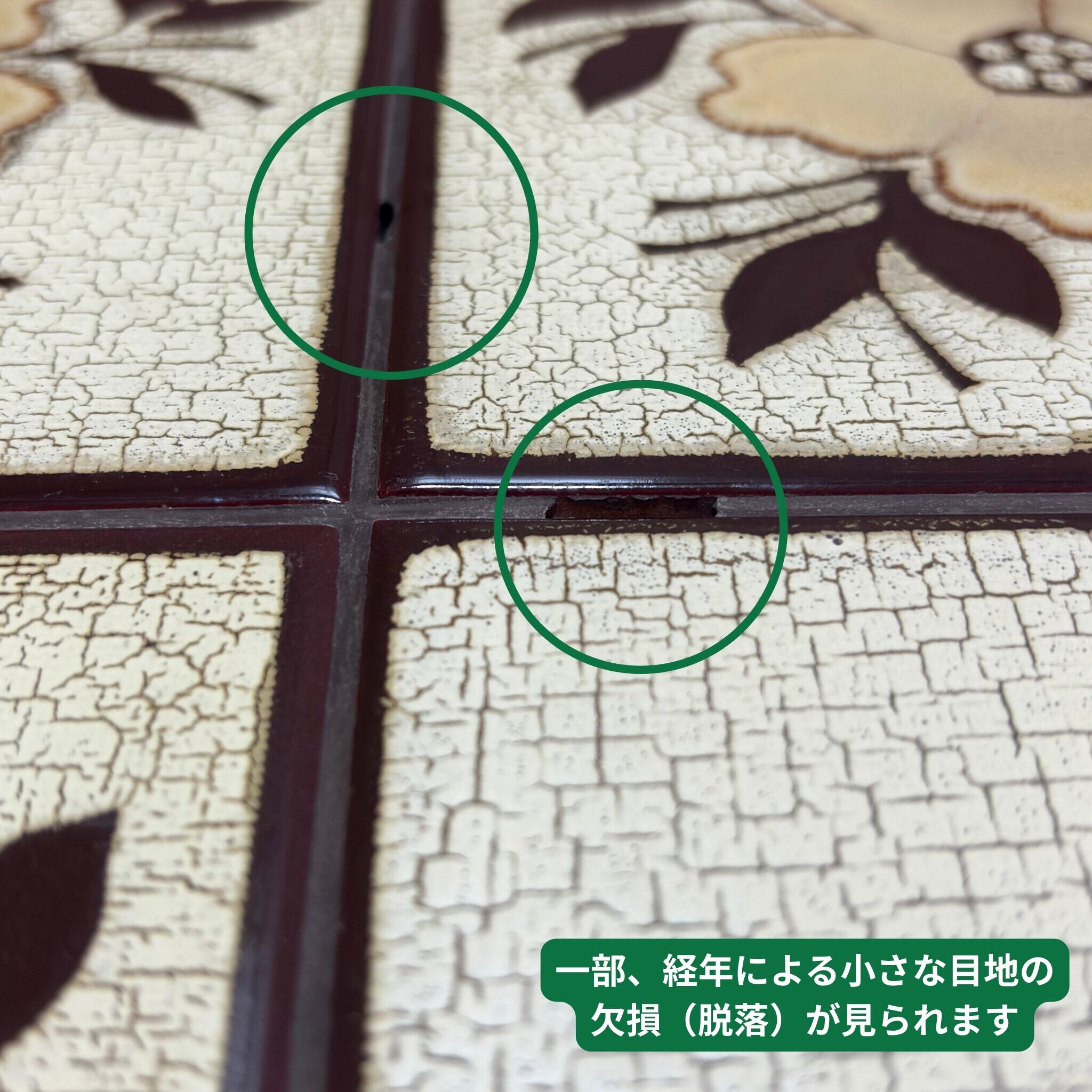 経年による小さな目地の欠損(脱落)が一部に見られます(画像参照)。これはヴィンテージのタイルトップテーブルによく見られる現象でありテーブルの構造的な強度に影響はありません。