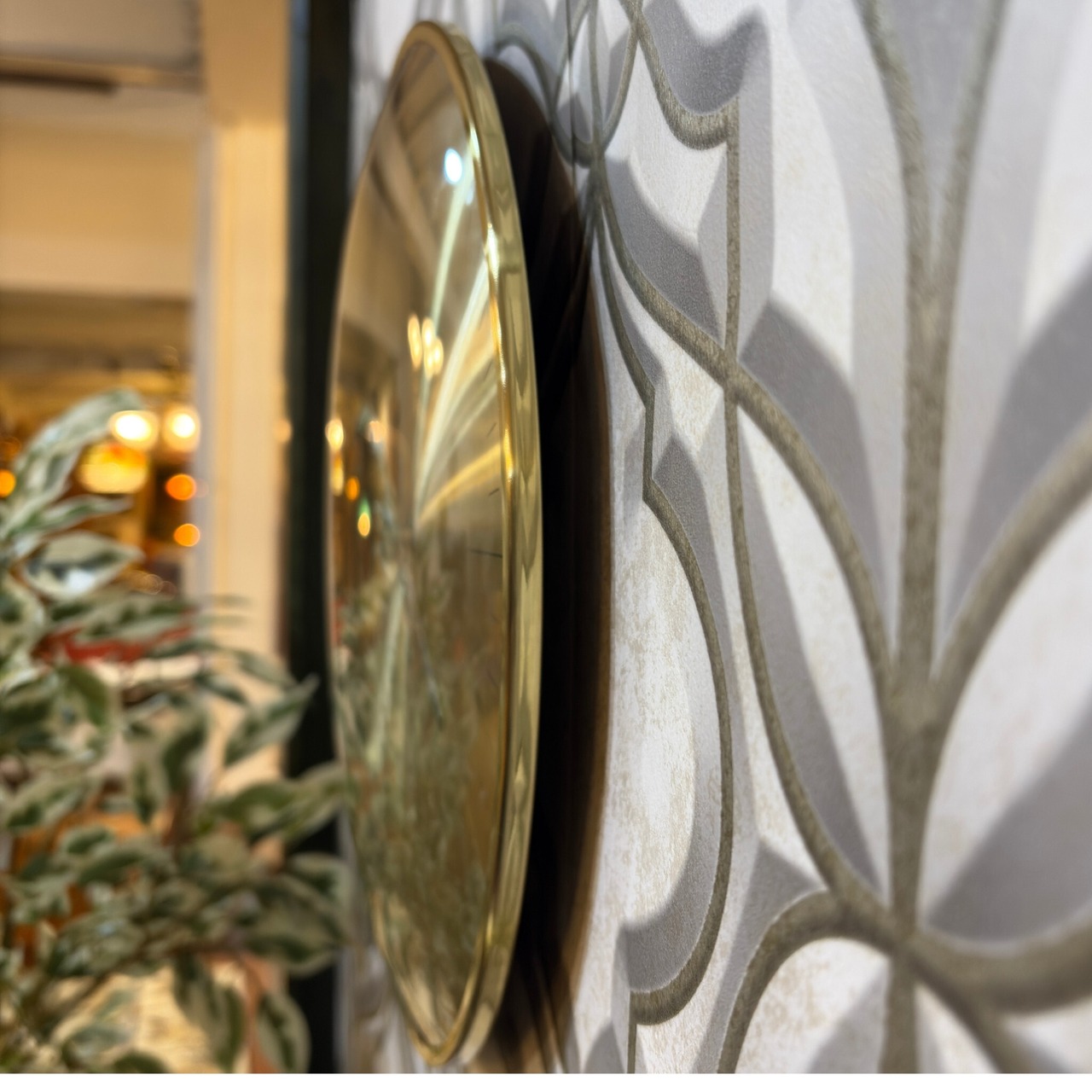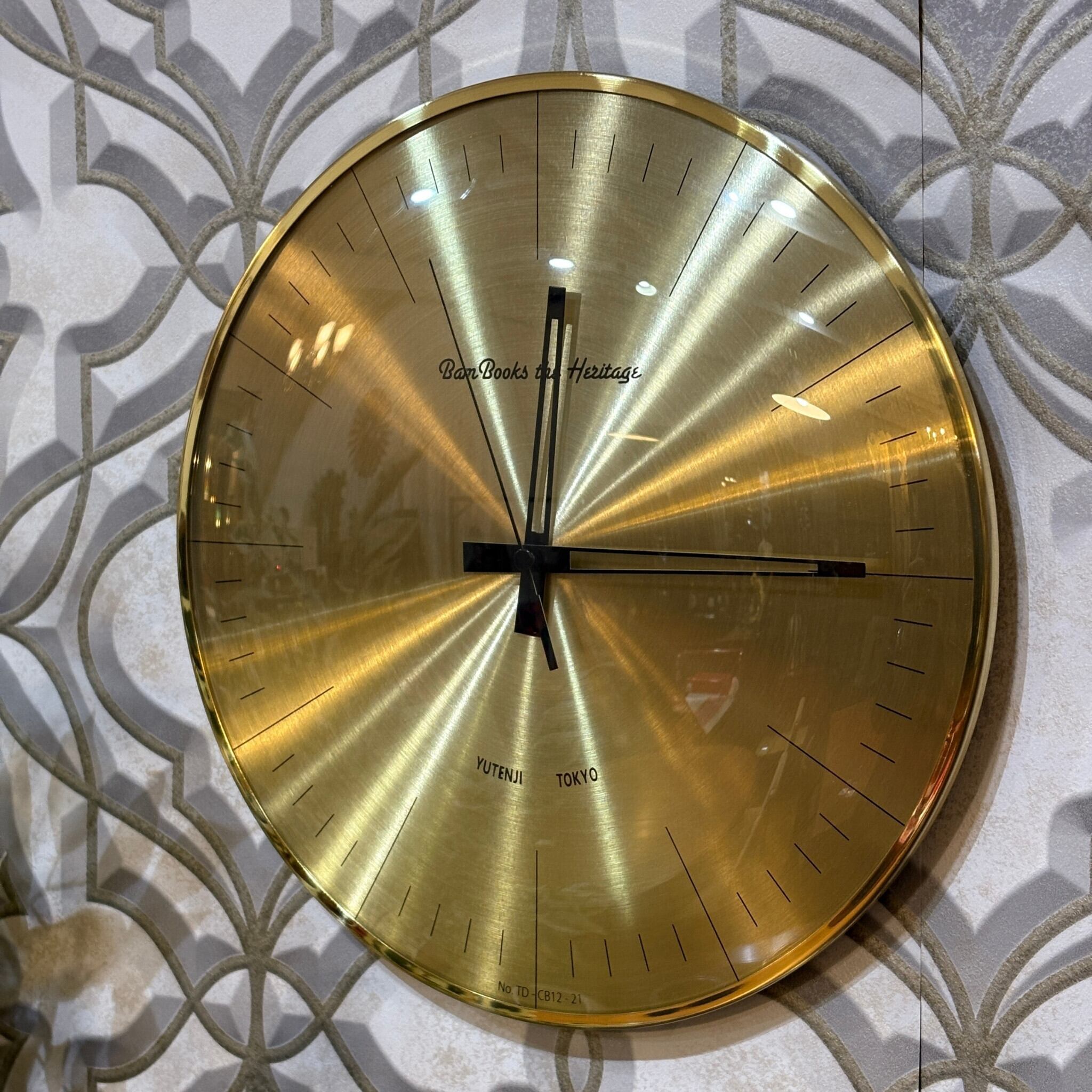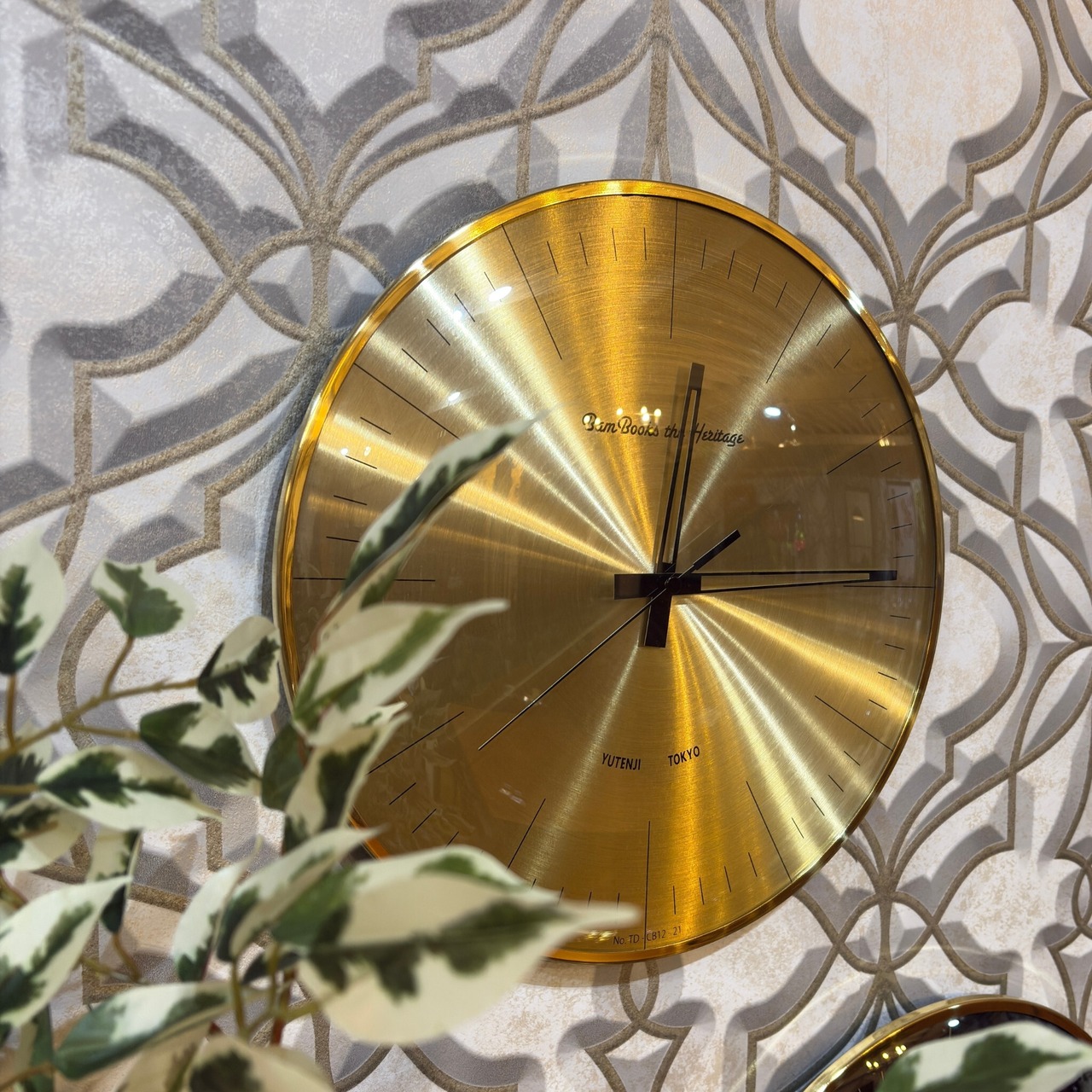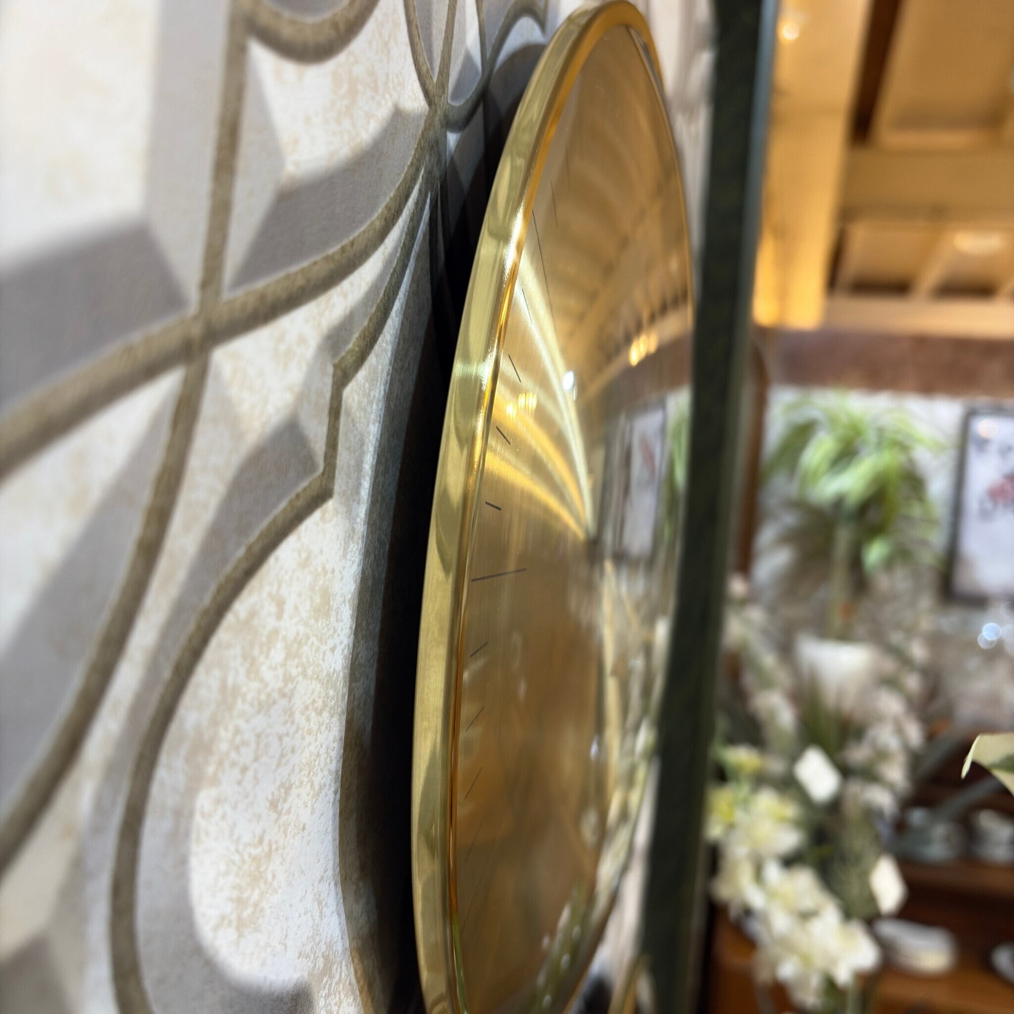 写真では店内の風景が映り込んでいますがこれはこのドームガラスの特性です。設置したお部屋の光や影、そして家具やアートといった空間そのものをガラスの曲面に映し込み、まるで時計自体が小さなアート作品のように周囲の風景を取り込んで変化します。角度や時間帯によって表情が変わるため退屈しない「生きたインテリア」としてお部屋に深みを与えてくれます。