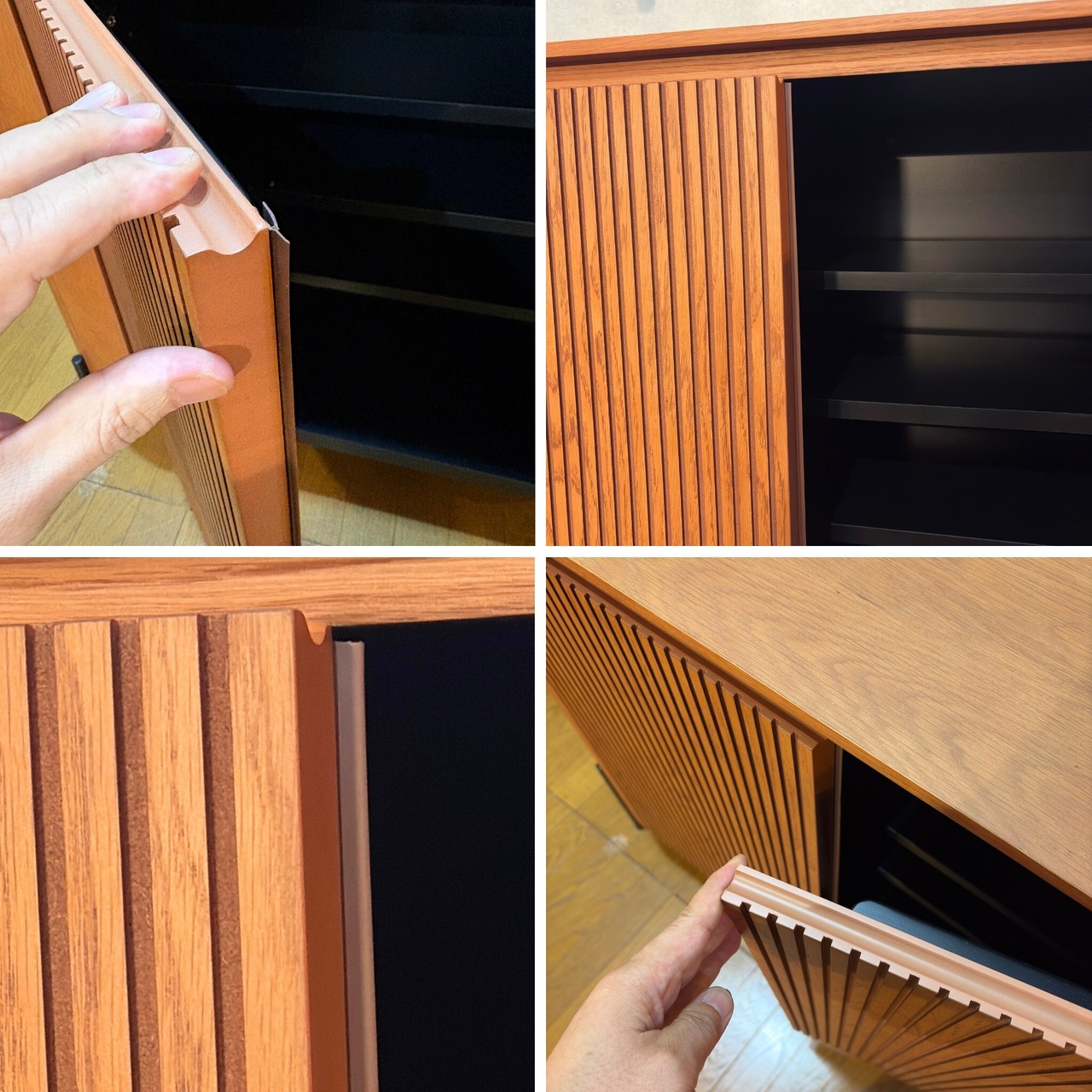 更に、配線穴があり棚板と背板の間には隙間が設けられています。これにより扉内に入れたオーディオ機器やルーターなどの配線も背面から美しく処理できるよう、非常に考えられた設計になっています。